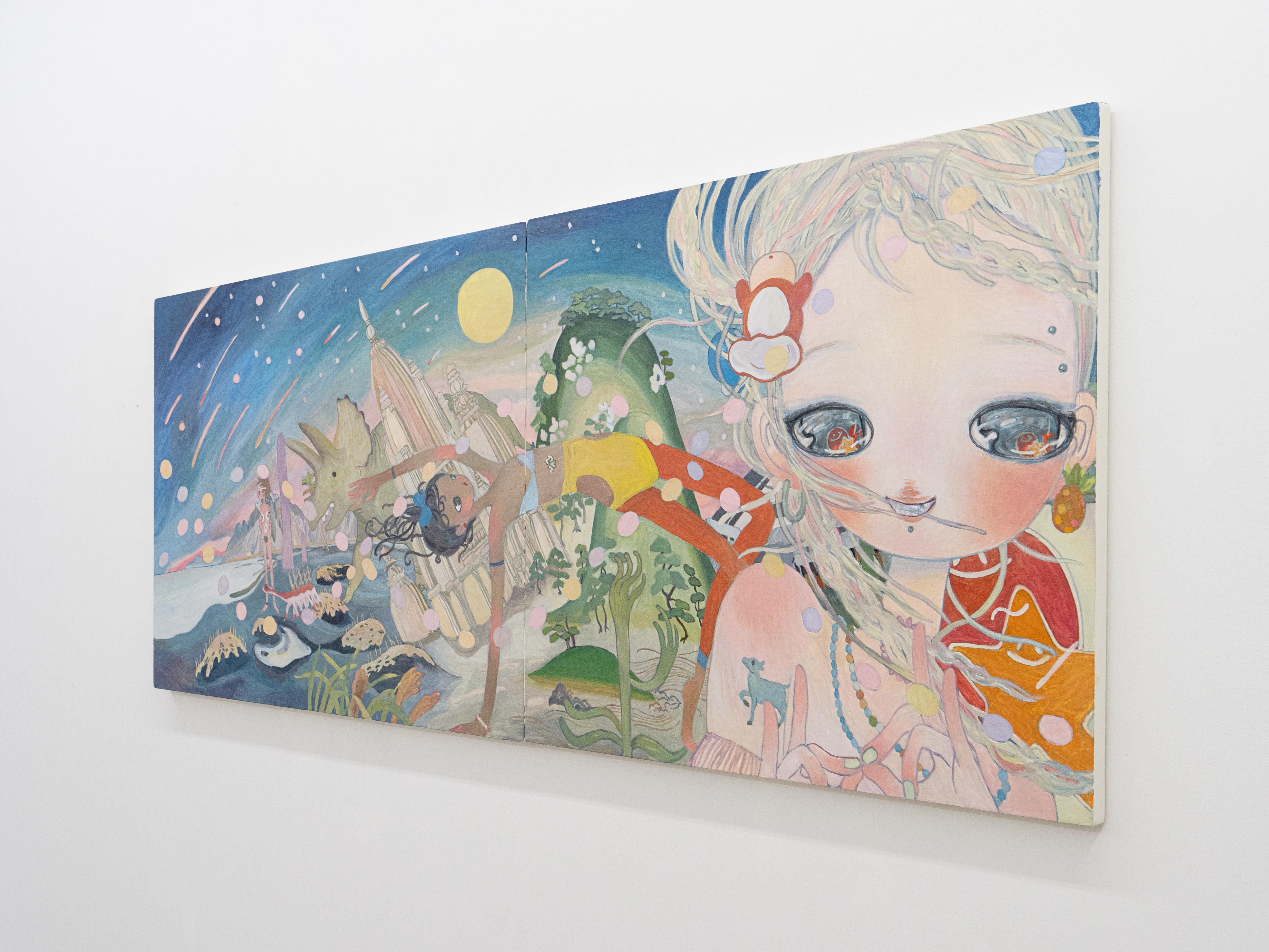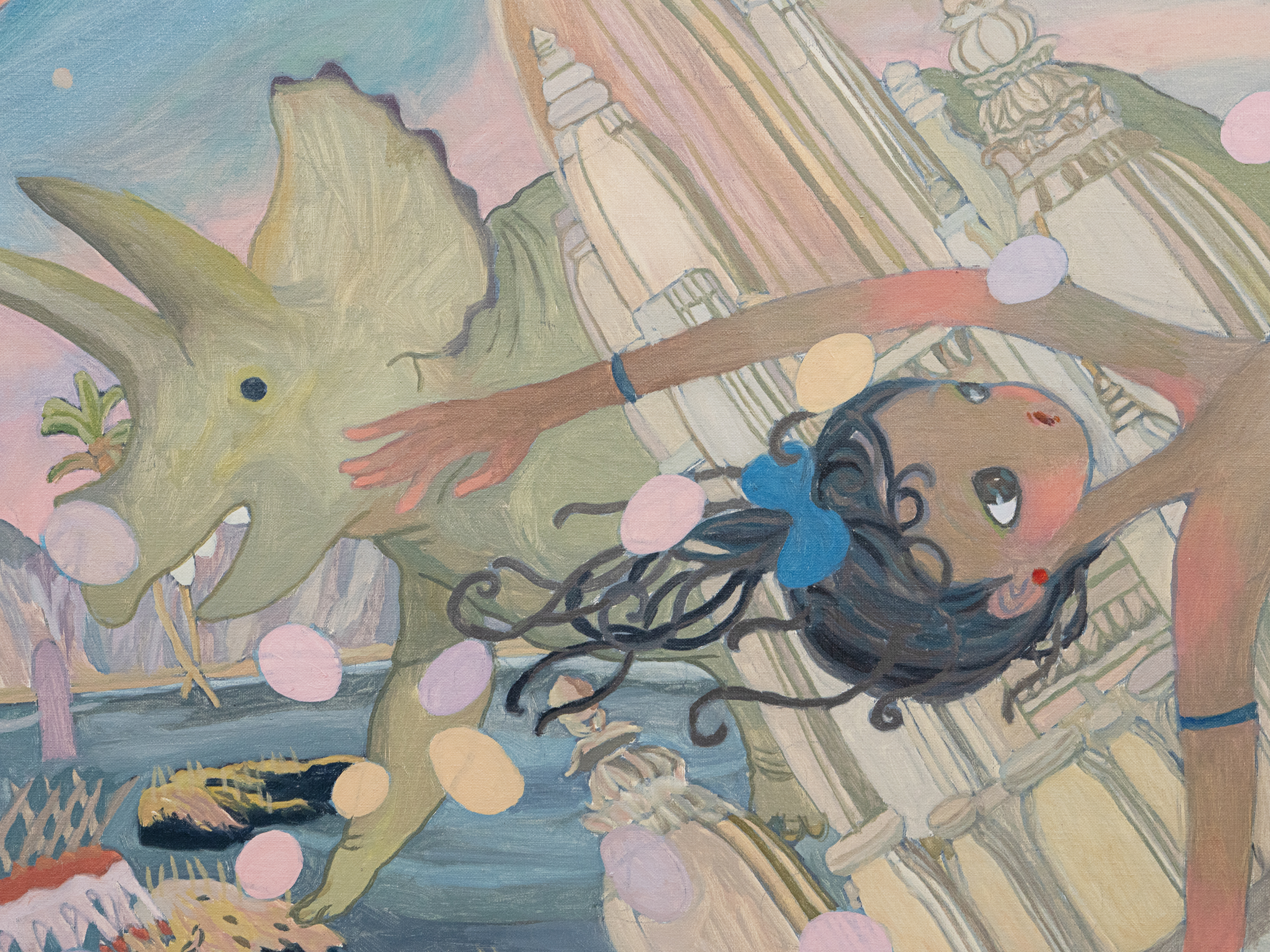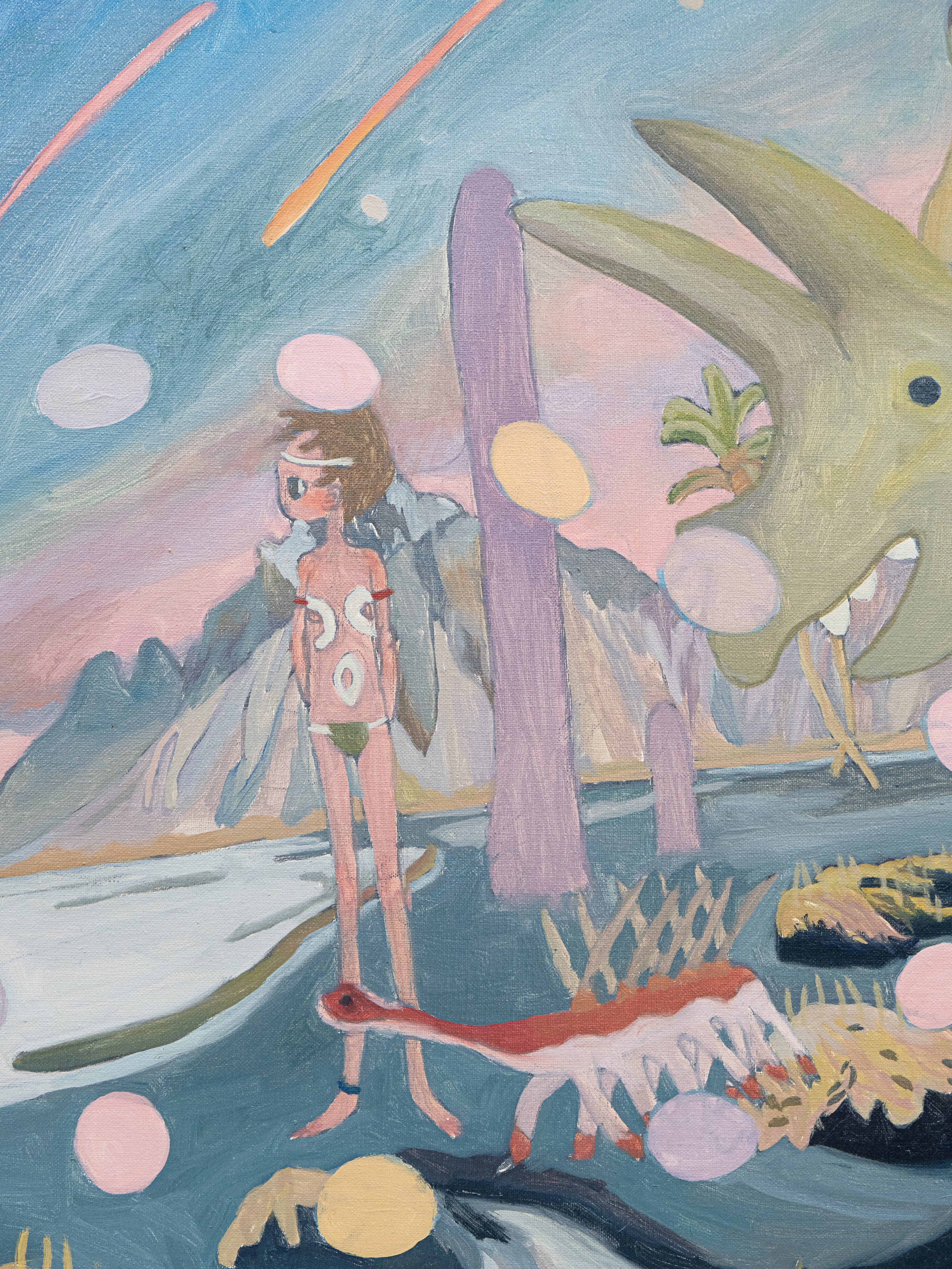 A person living in the modern age, a person striking a yoga pose at the center, a temple submerged in the Ganges River, creatures of the Cambrian period, the towering fungi of the Devonian period known as Prototaxites, and the sea.