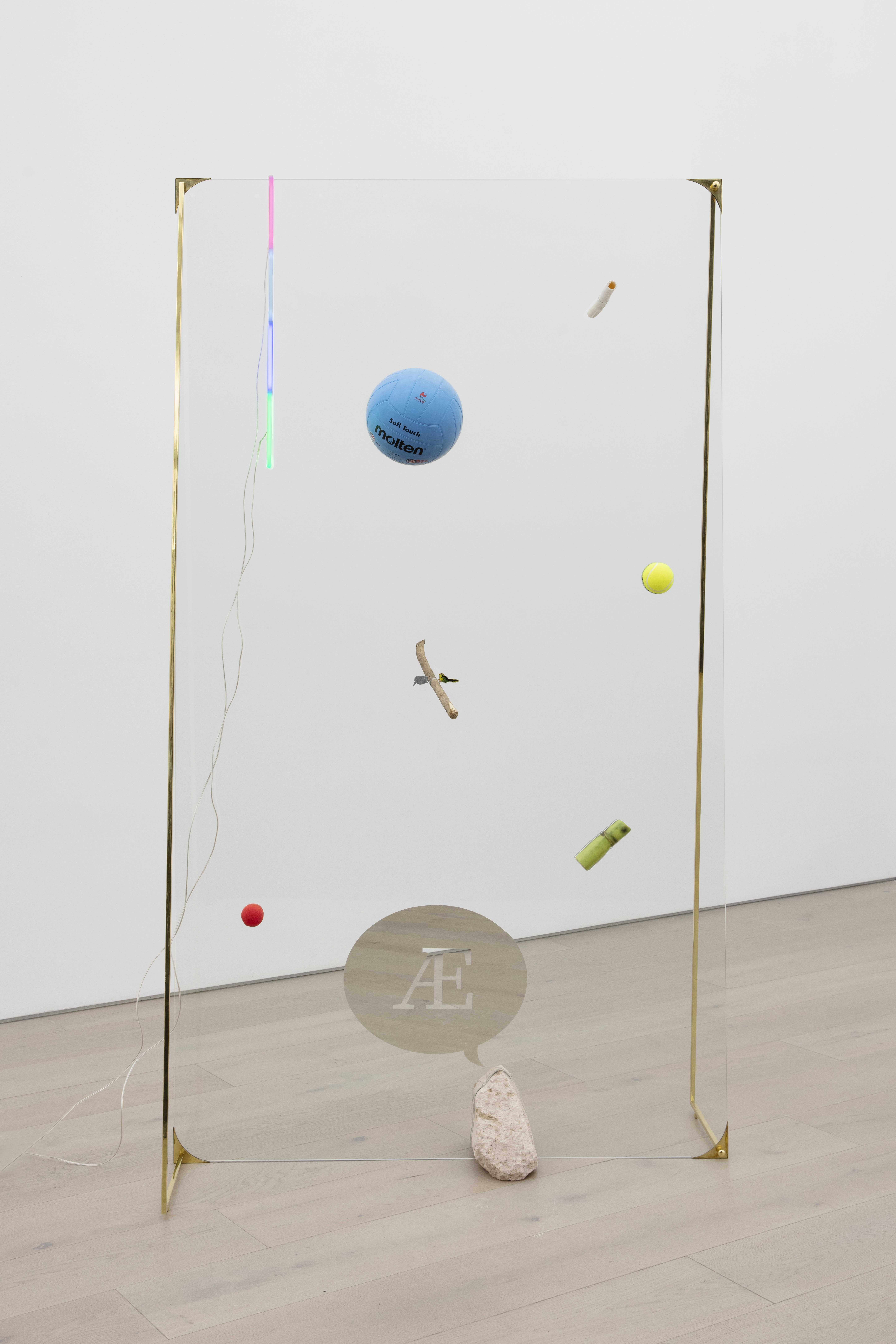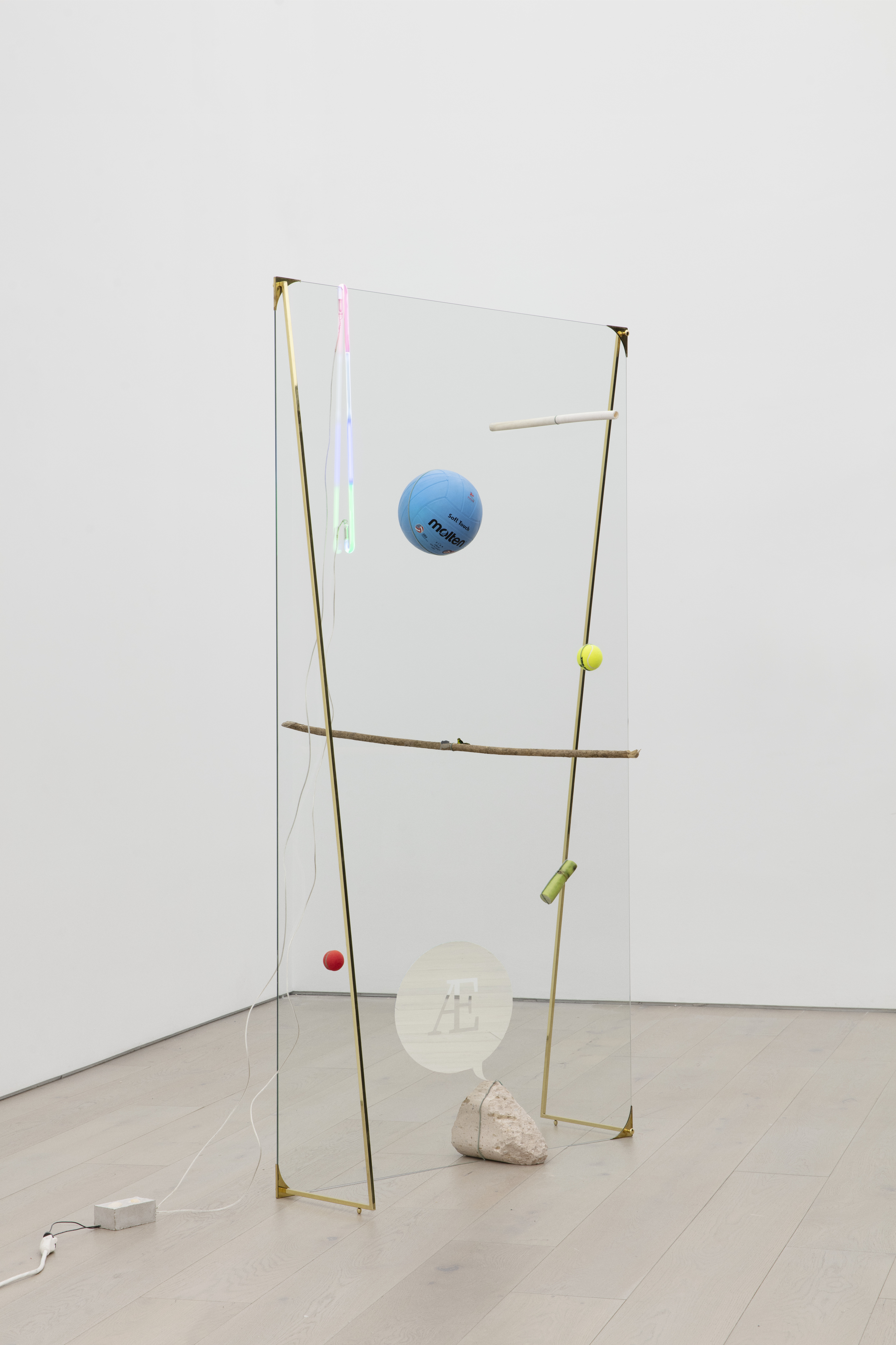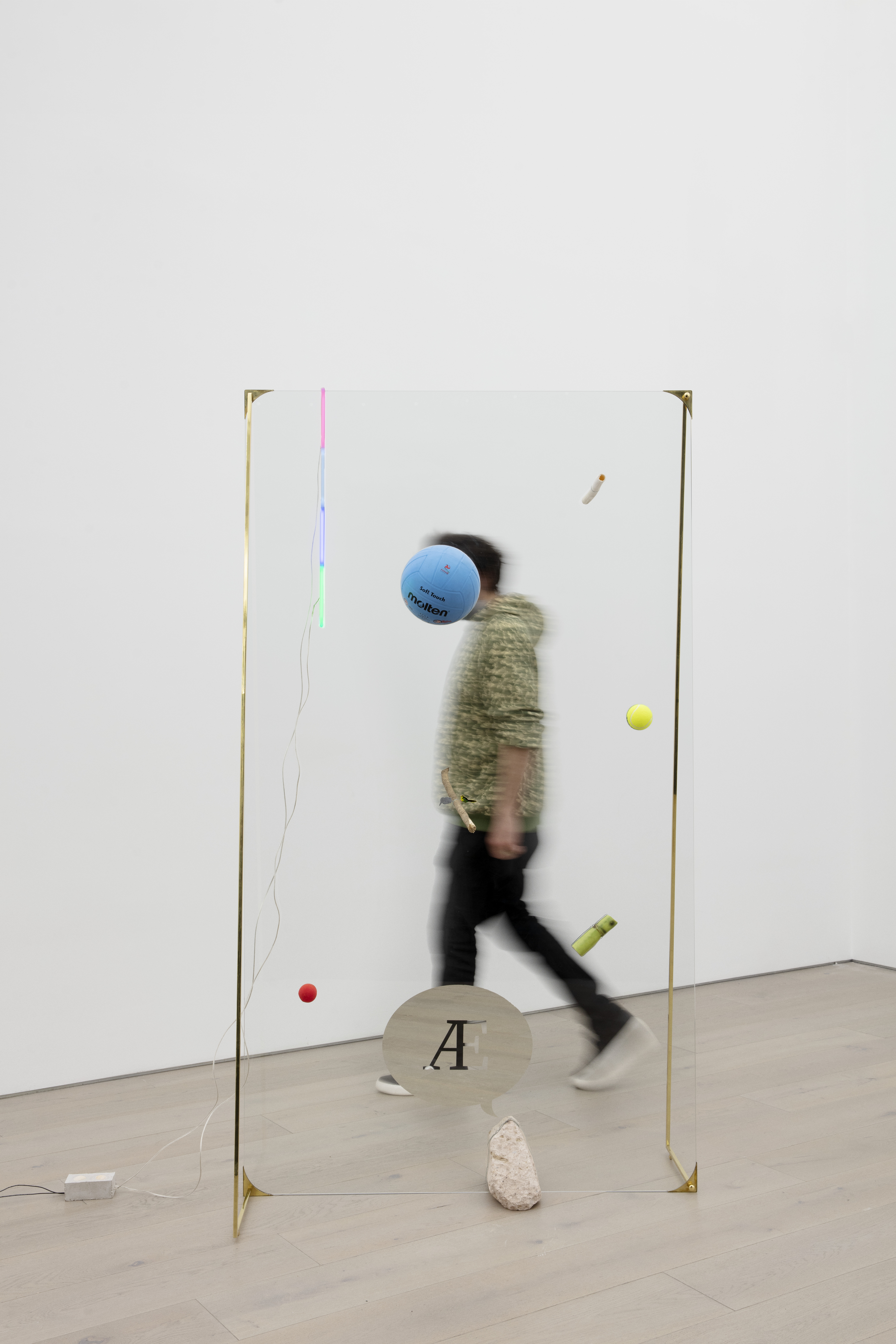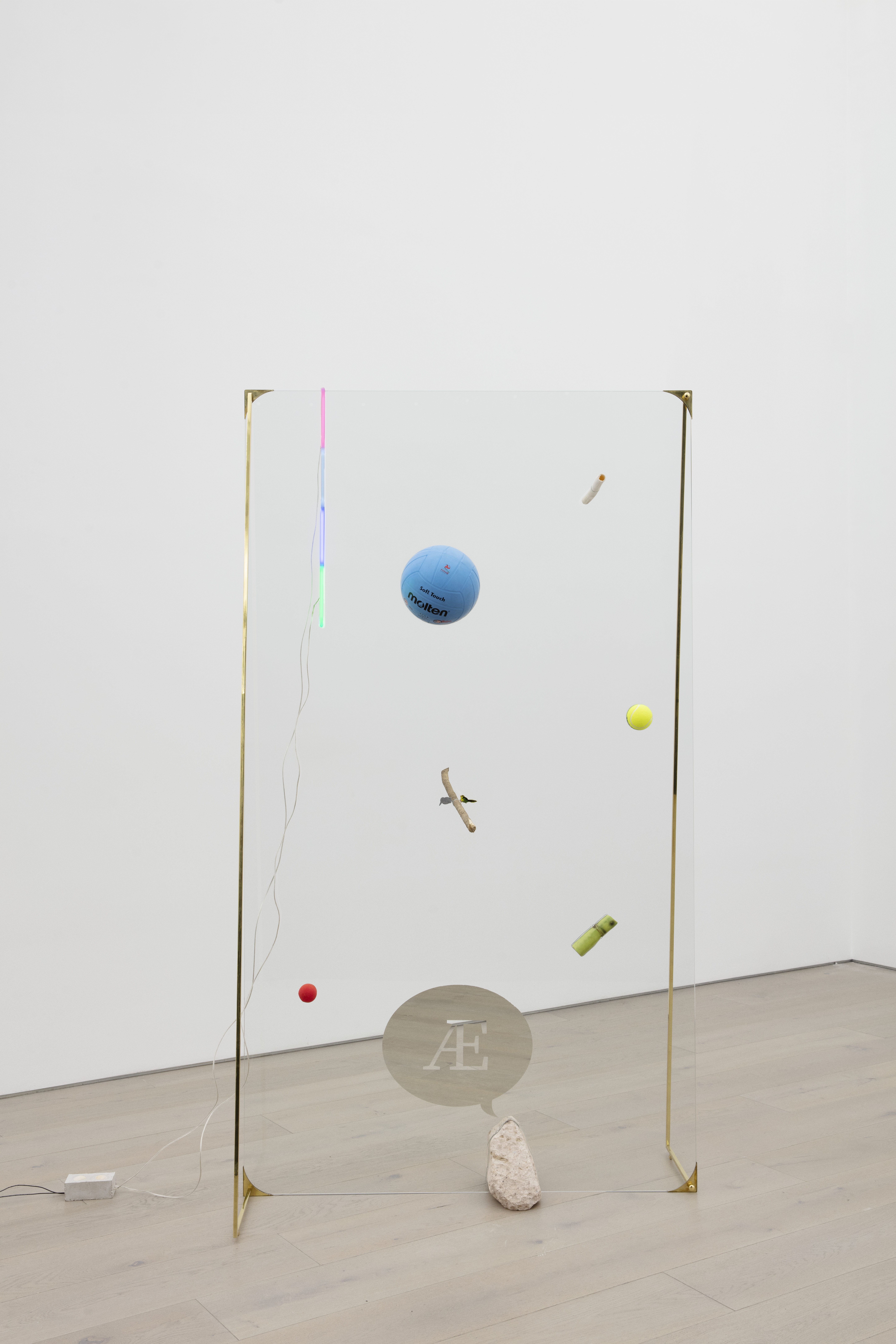 "This piece refers to the possibility of freezing a series of events in space and time, as if the action of throwing objects through the air were suddenly compromised by a mesh of static energy, finitely suspending the objects in their path. This sculpture assumes action and reaction as a principle for its configuration. The composition in relation to the place occupied by the objects in the glass is random, alluding to the force with which they were thrown and their weight. The selection of objects was made with the intention of achieving a harmonious and balanced composition, each one refers to the condition of precariousness related to the experience of life, to the basic needs that drive us and keep us alive."