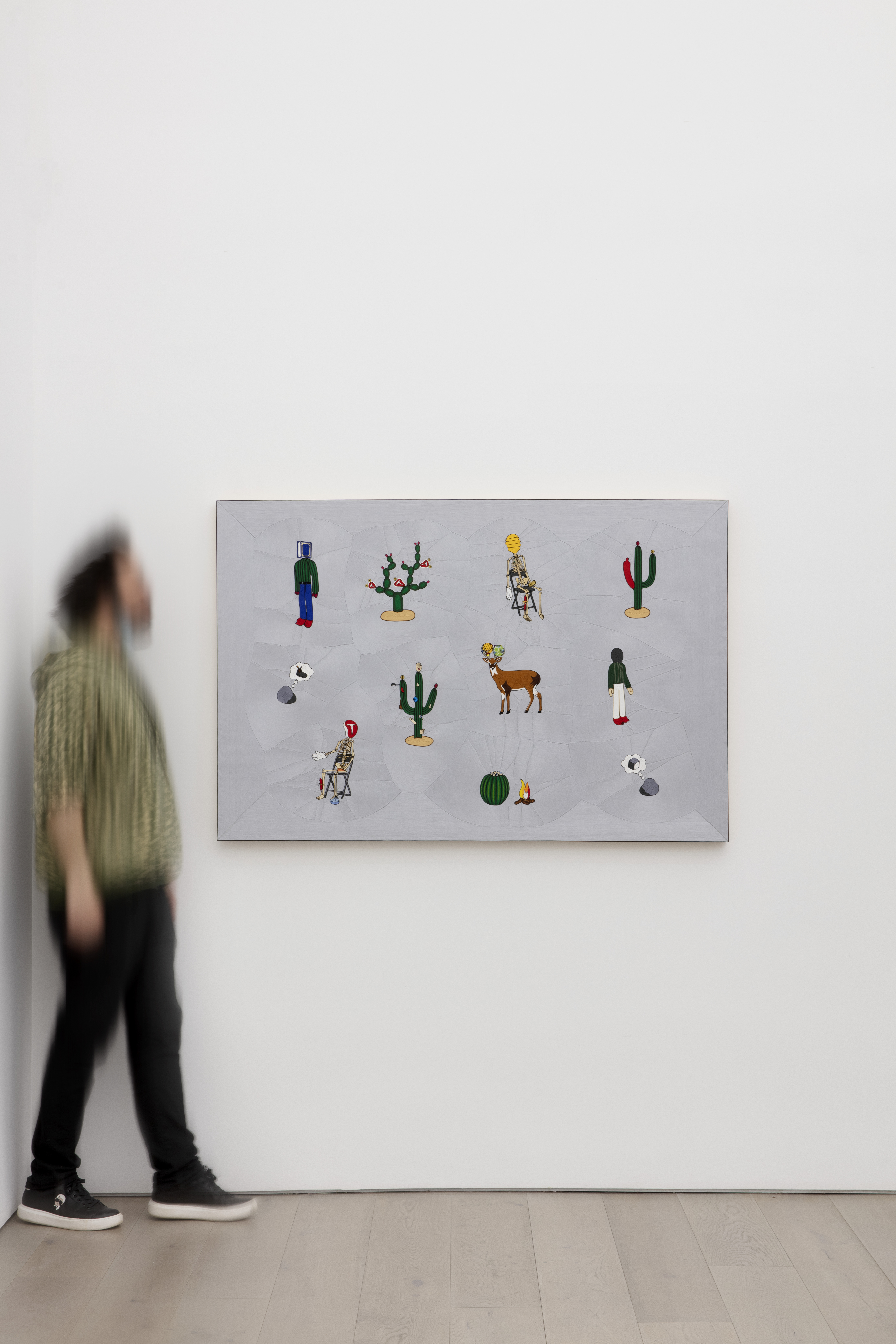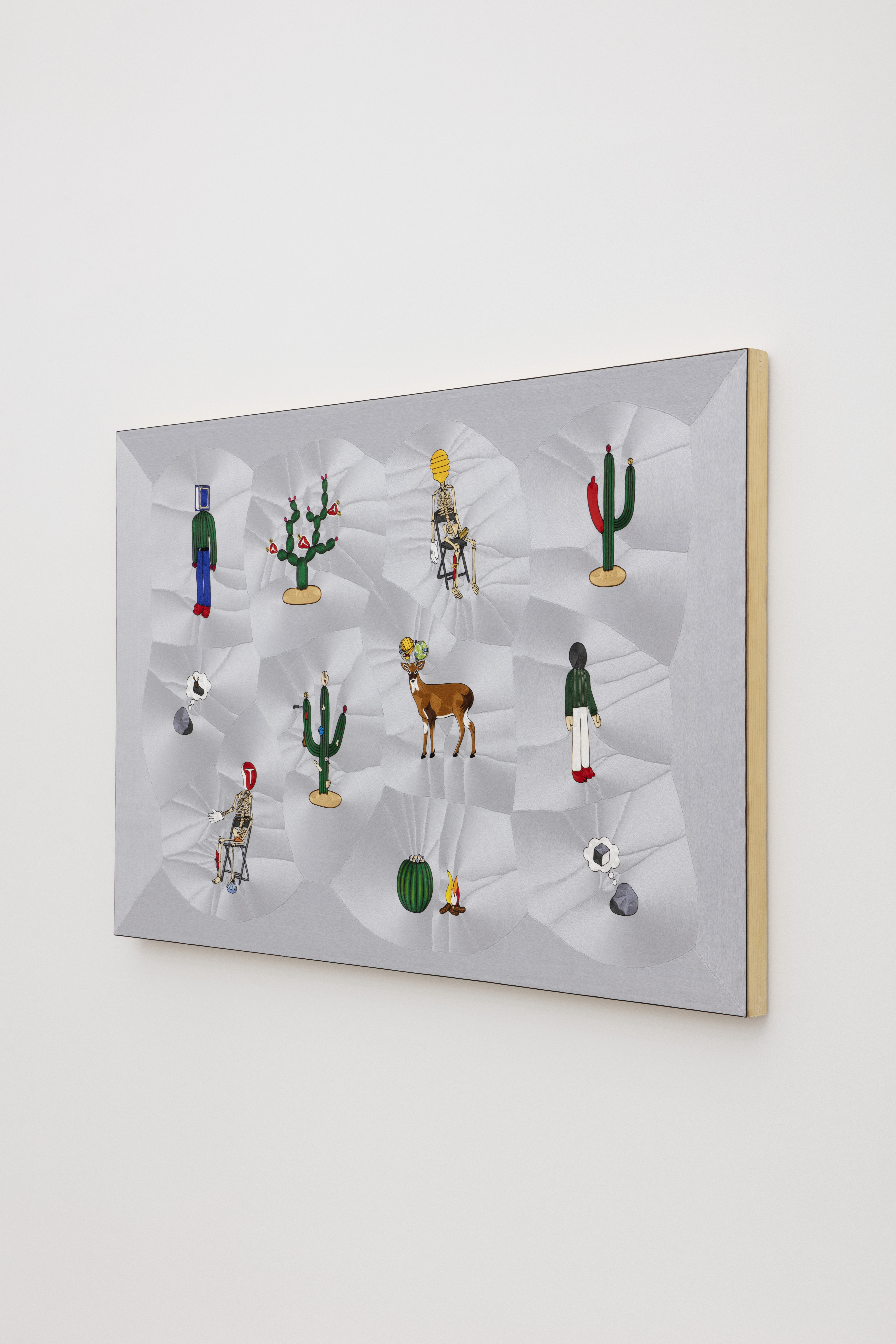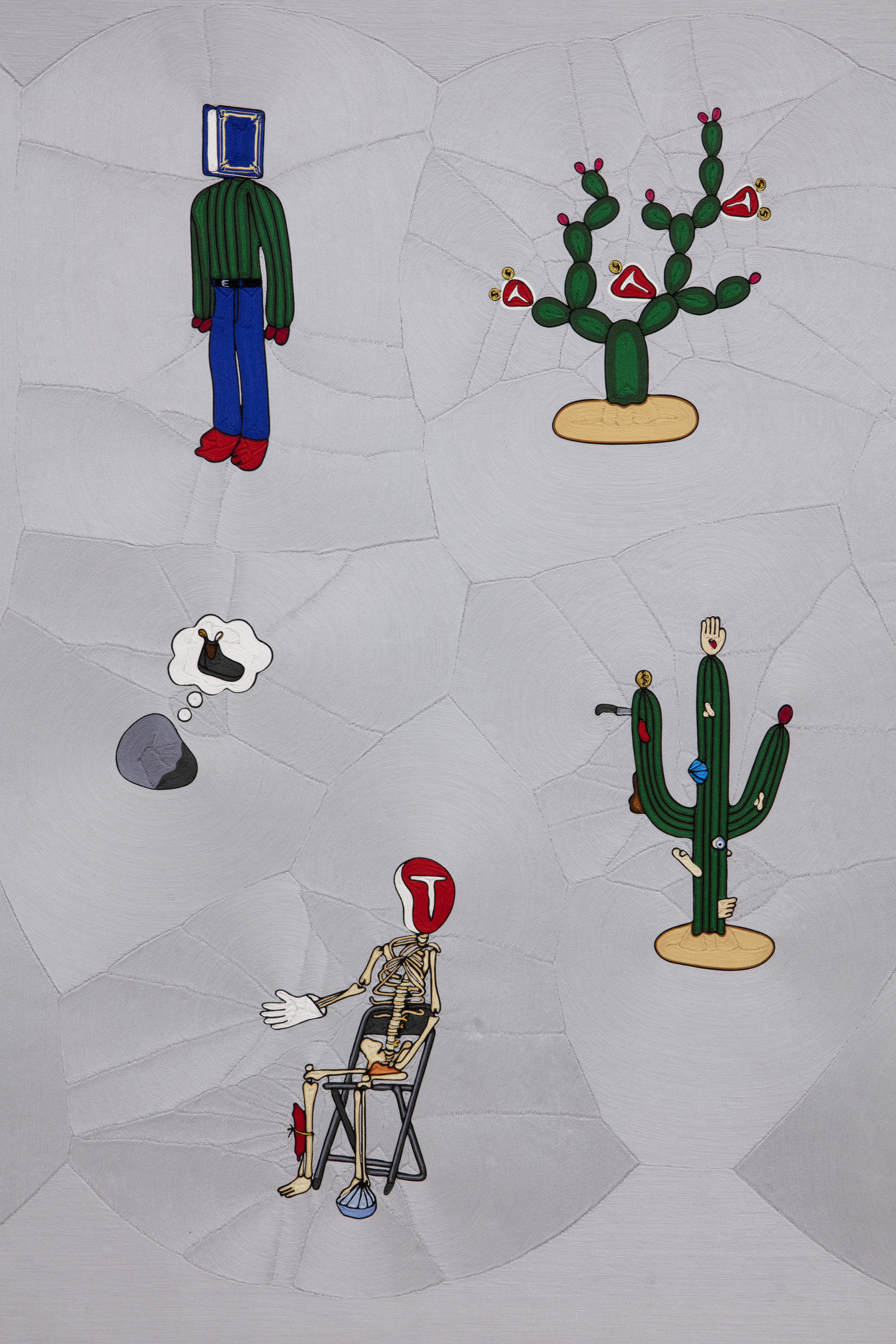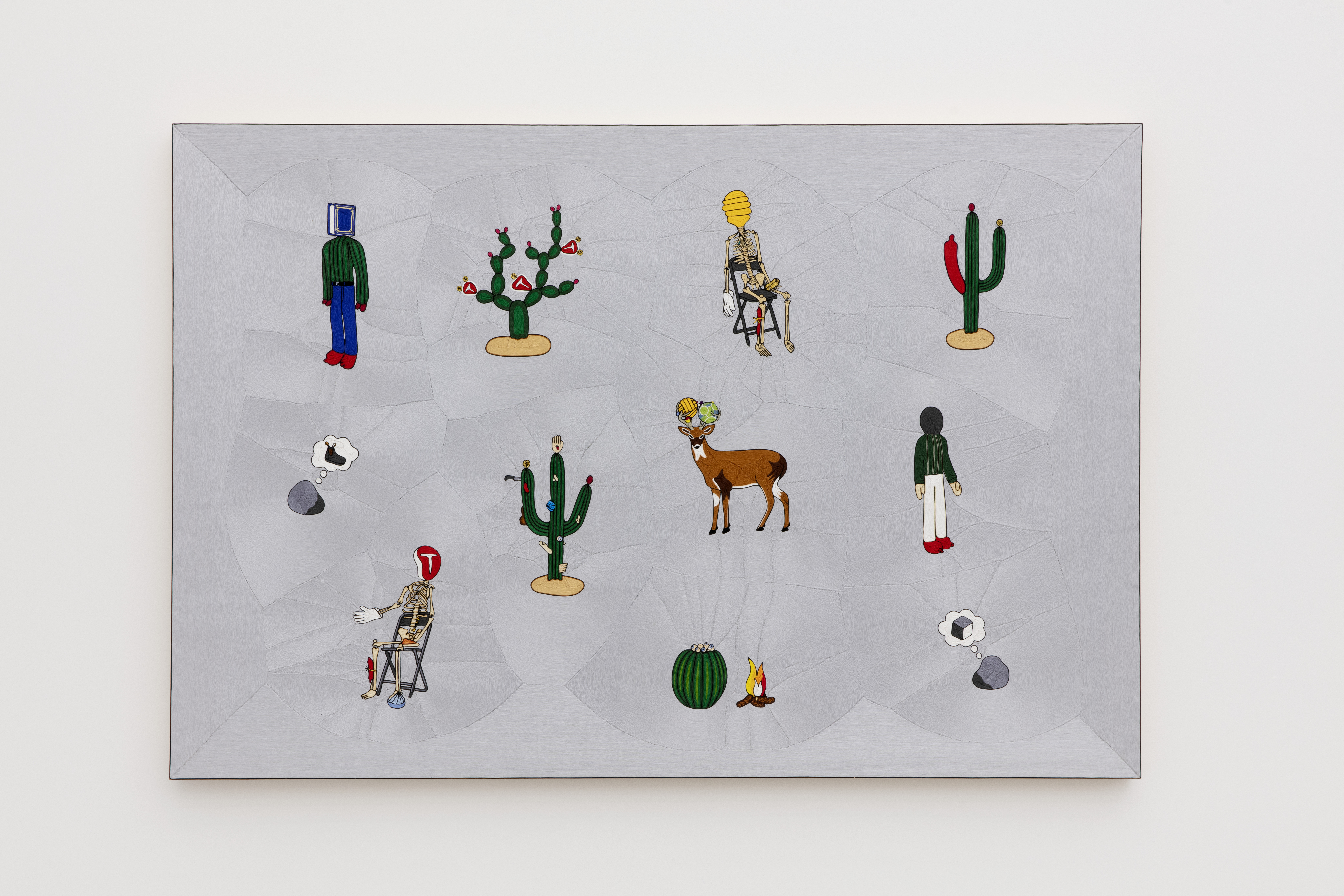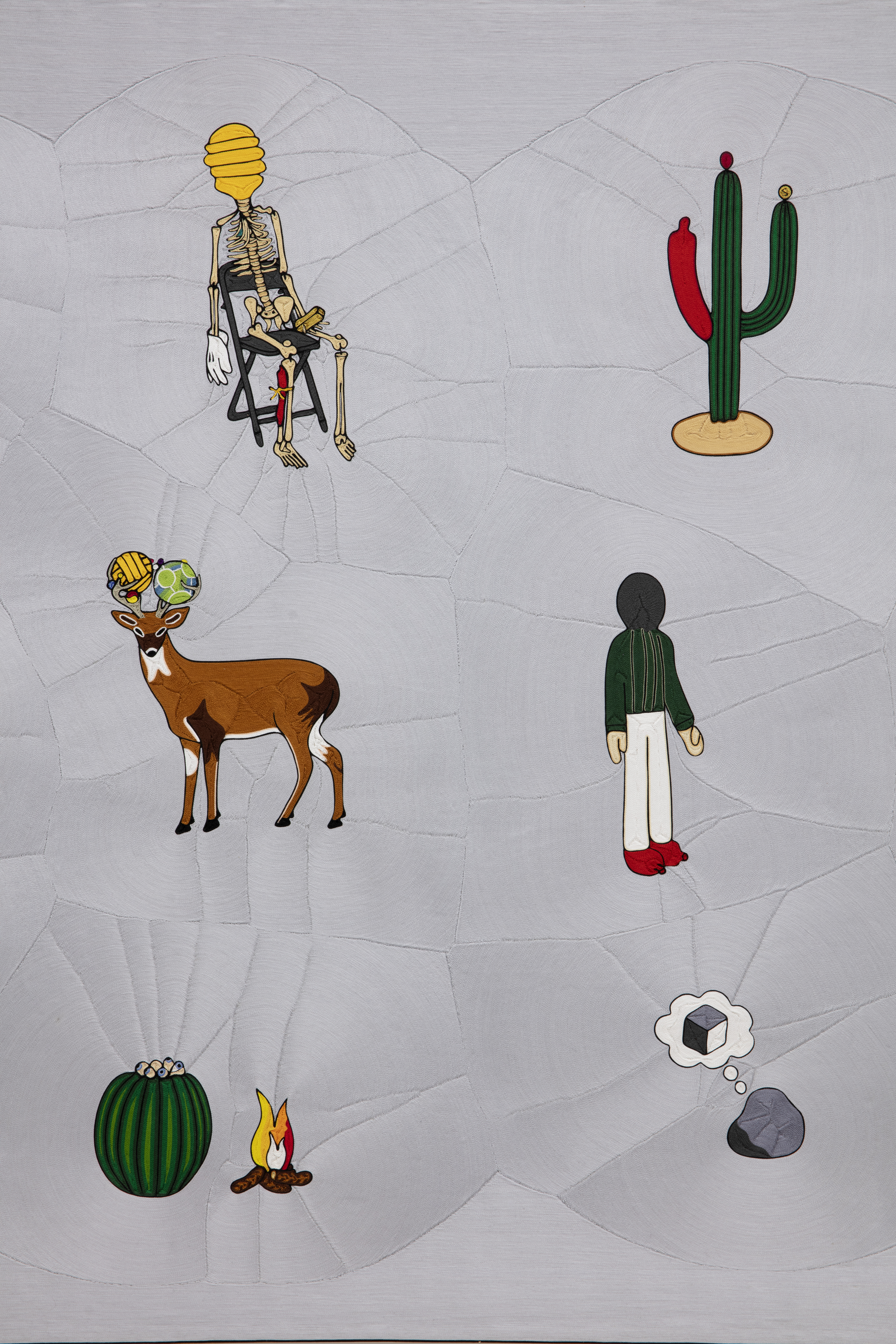 “For some time, I was looking for a technique that would allow me to transfer the aesthetic of some of my sculptures to a two-dimensional format in order to graphically enhance the visual force and magic of the pieces. This led me to find a traditional technique known as ¨Nierika¨, images created through spreading beeswax onto wooden boards, and pressing in hand-painted yarn designs, crafted by the Wixarikas or Huicholes in San Andrés Cohamiata, a village in the middle of a mountain range in the north of the state of Jalisco, México. This technique is used to represent the gods of these people, and also to represent the visions that their shamans have. I believe that this makes the relationship between the images that are depicted in this series and their meaning clearer. When I saw the first finished piece, I noticed the very precise way in which “Nierika” complemented the pieces belonging to this series and I included that relevance in the title choice. The original meaning of the sculptures from which these worsted yarn pieces were inspired was restructured and found a clearer meaning – the empty space represented by pale gray is fragmented by the images in the picture, and these conditions in this space are what I seek when I produce new pieces. These pieces were elaborated in the family workshop of the master Manolo Castro Montoya ‘’Muwieritemay’’.