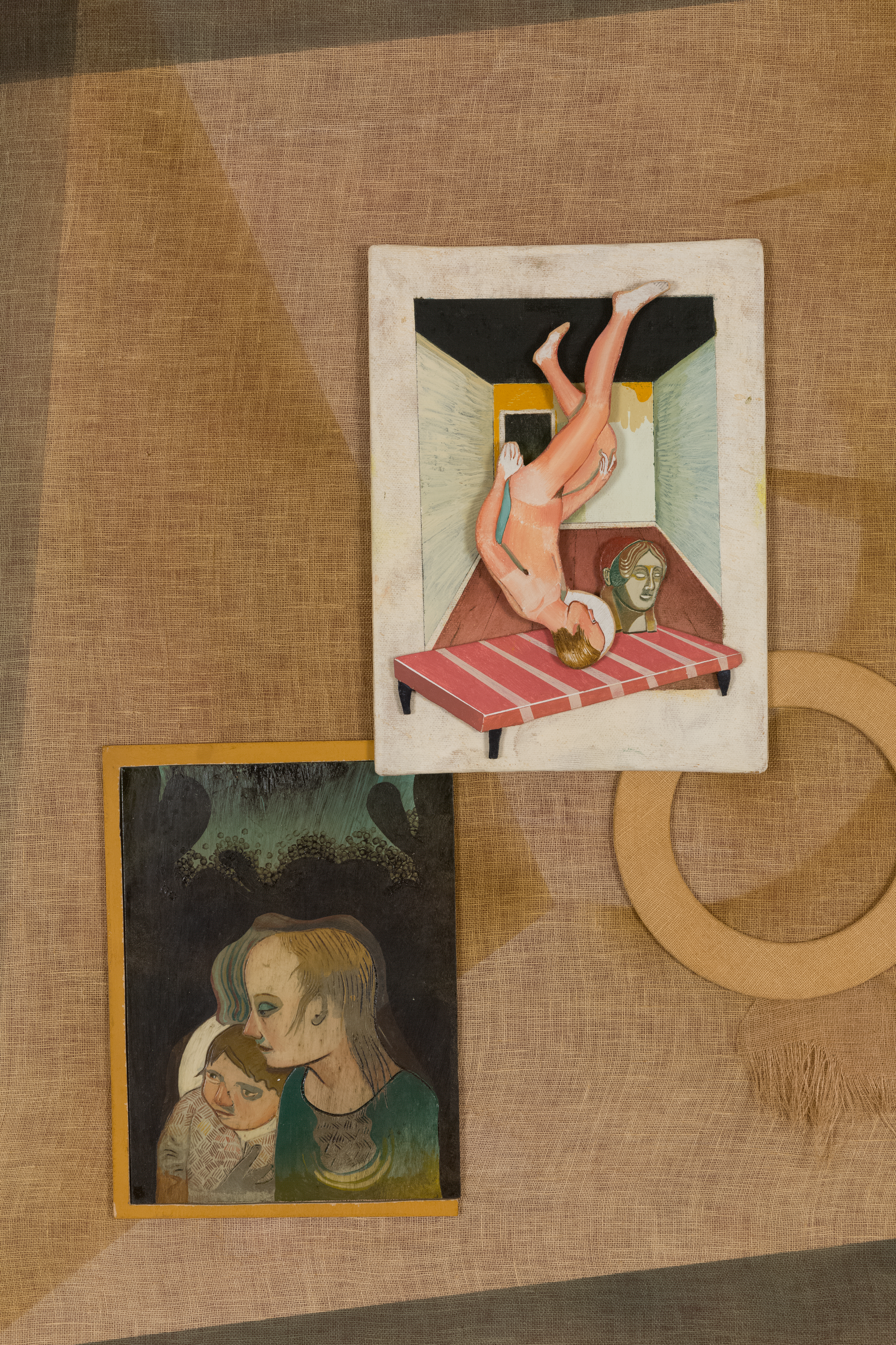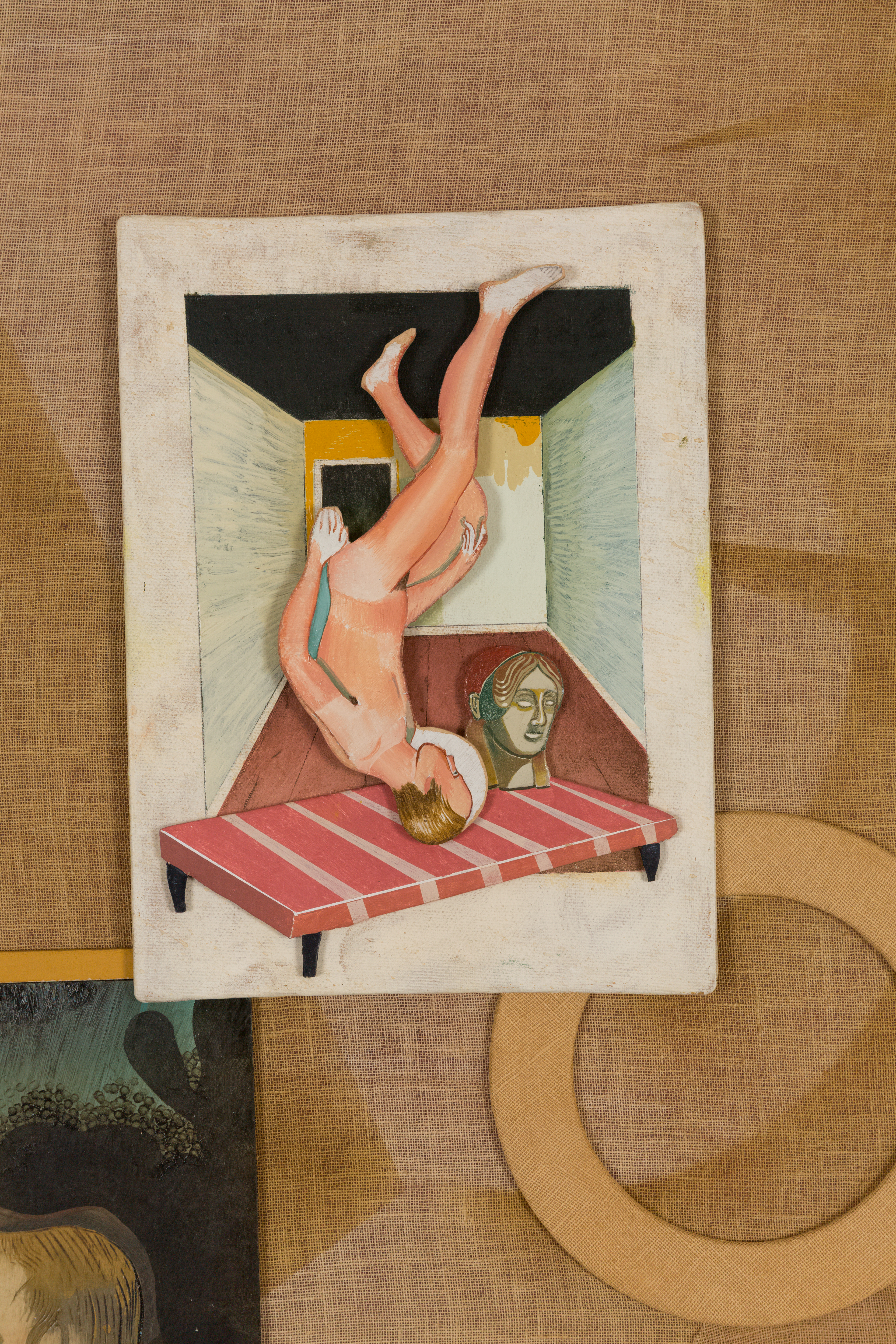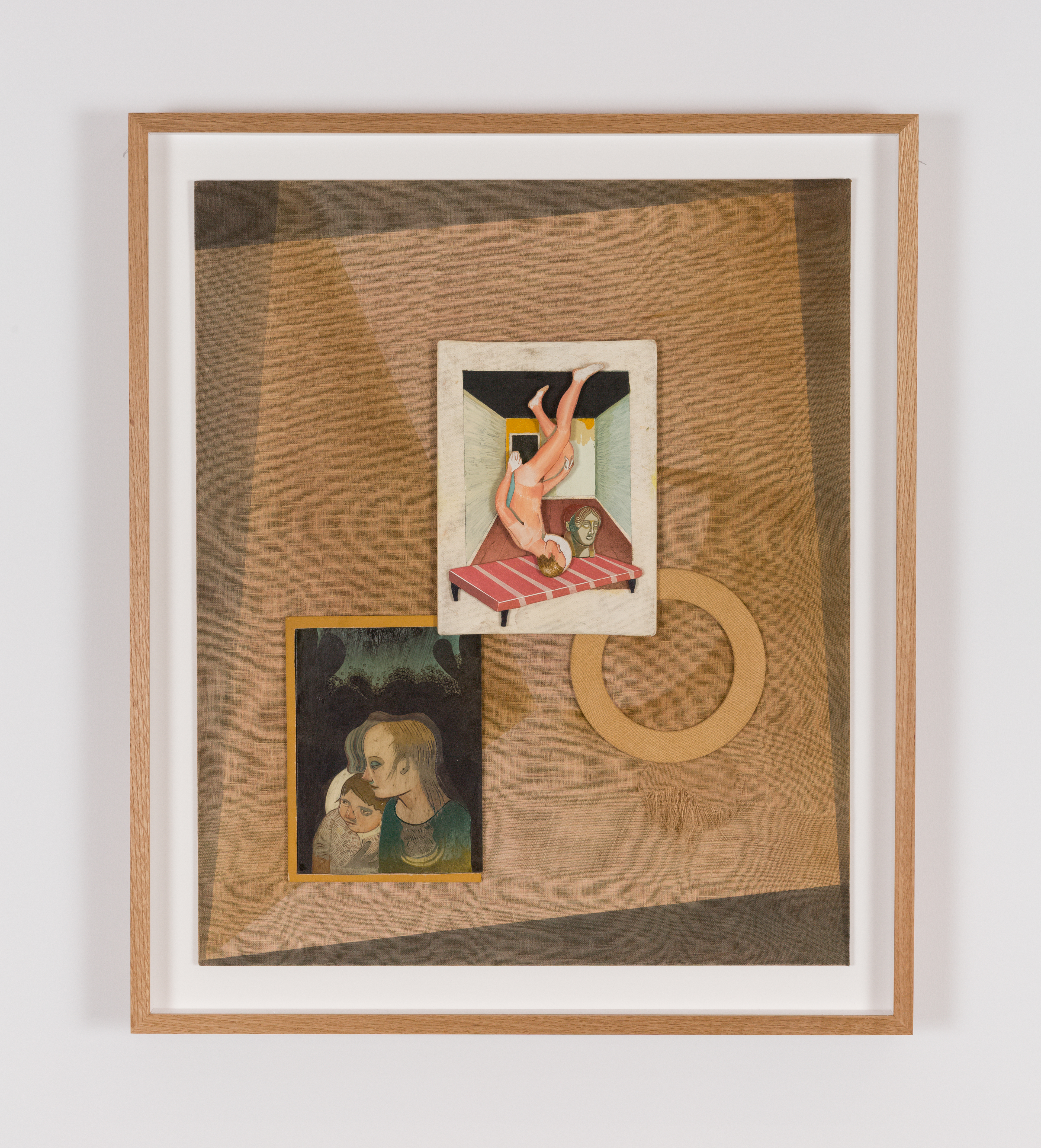 Oil, inks, wood, linoleum, linen on panel