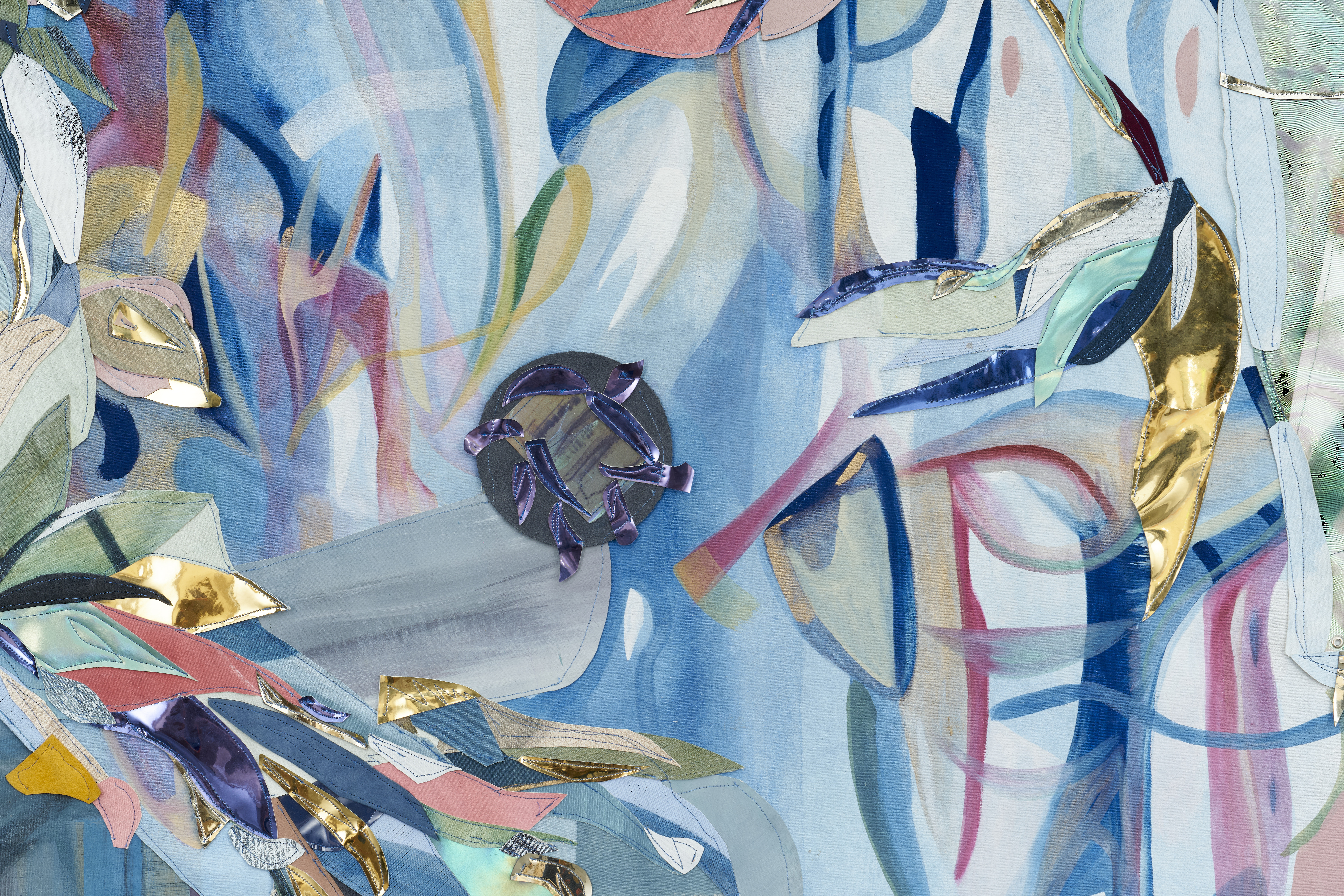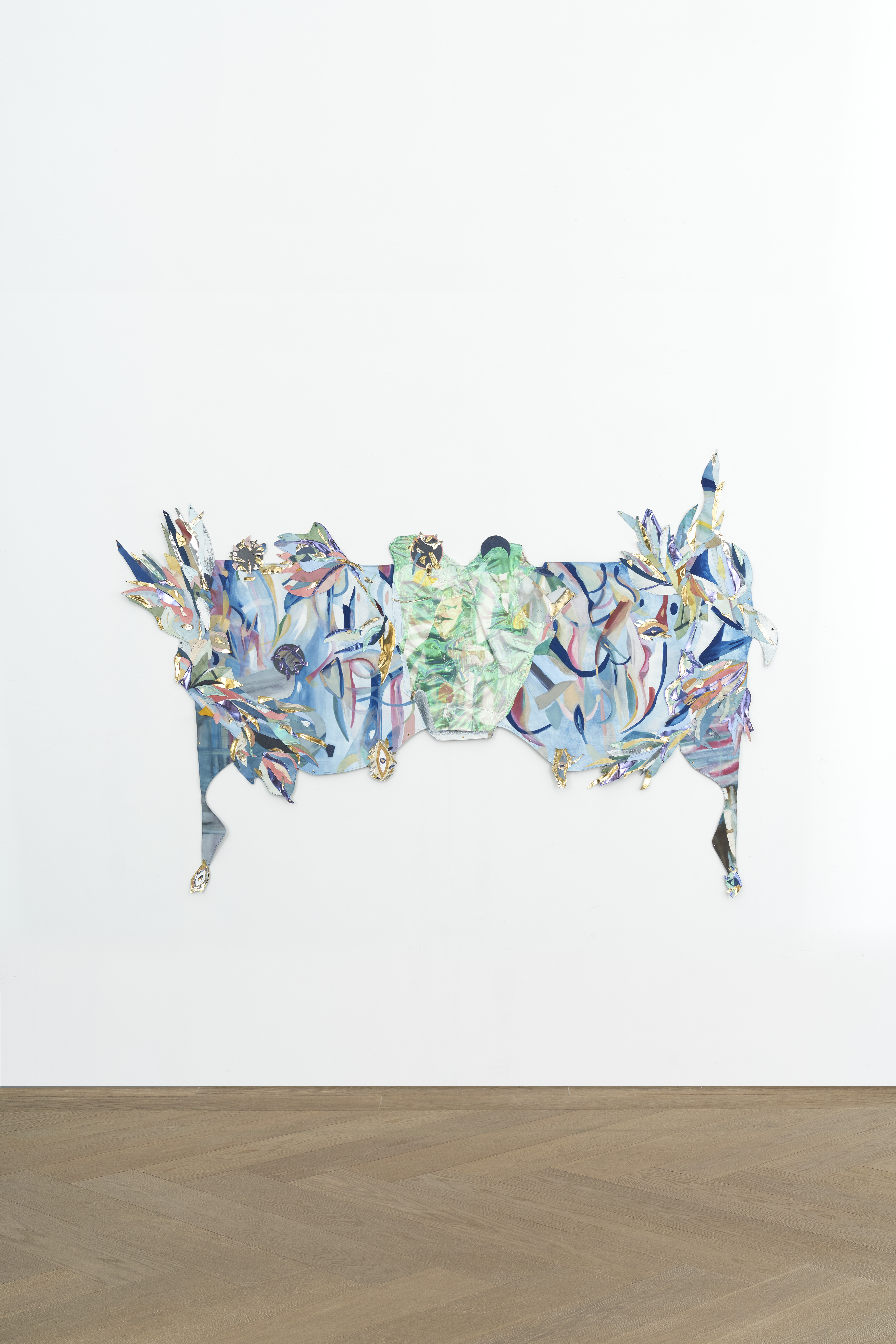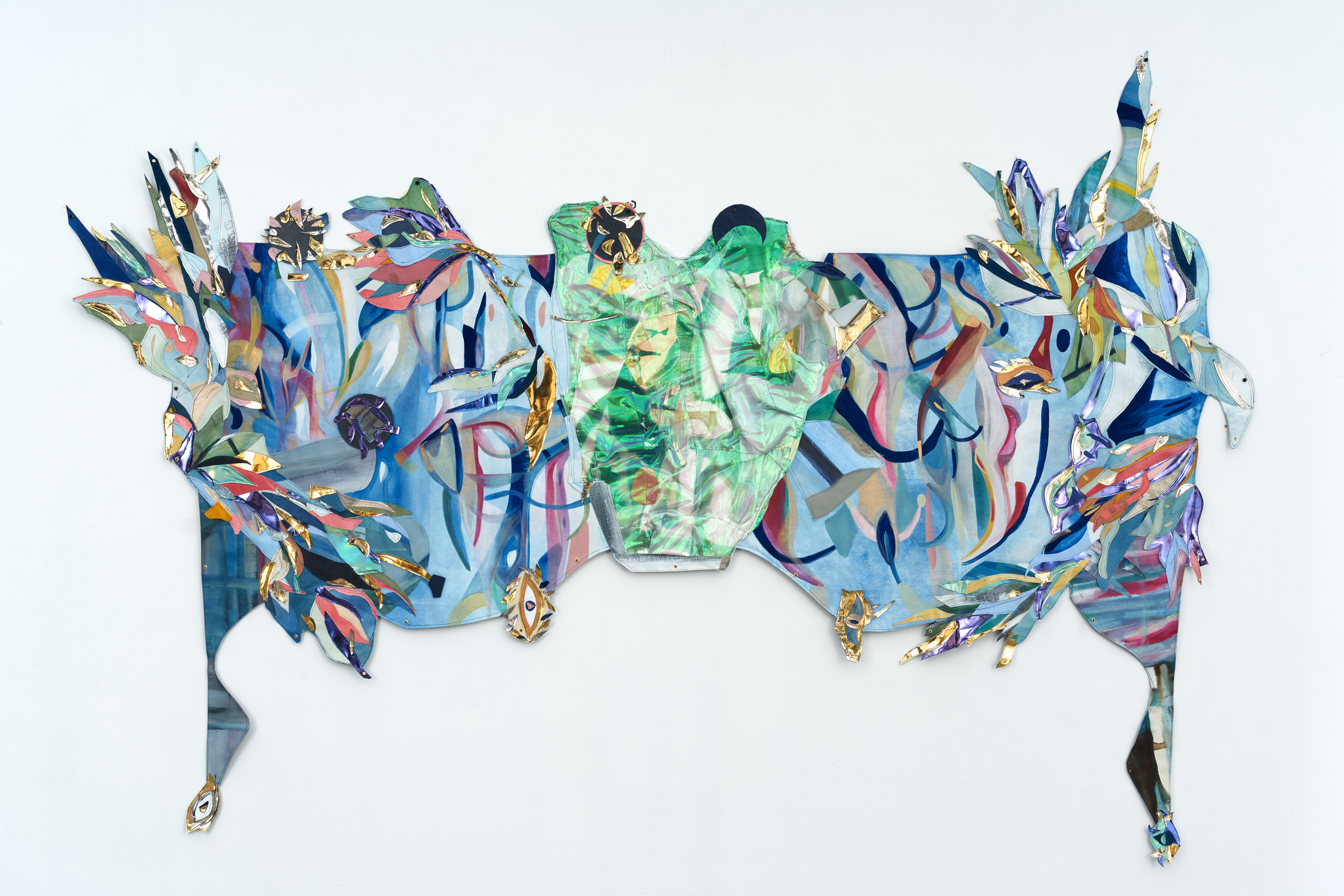 Oil, acrylic and watercolor on canvas, vinyl, suede, leather, iridescent fabric, photograph, paper, chinese ink