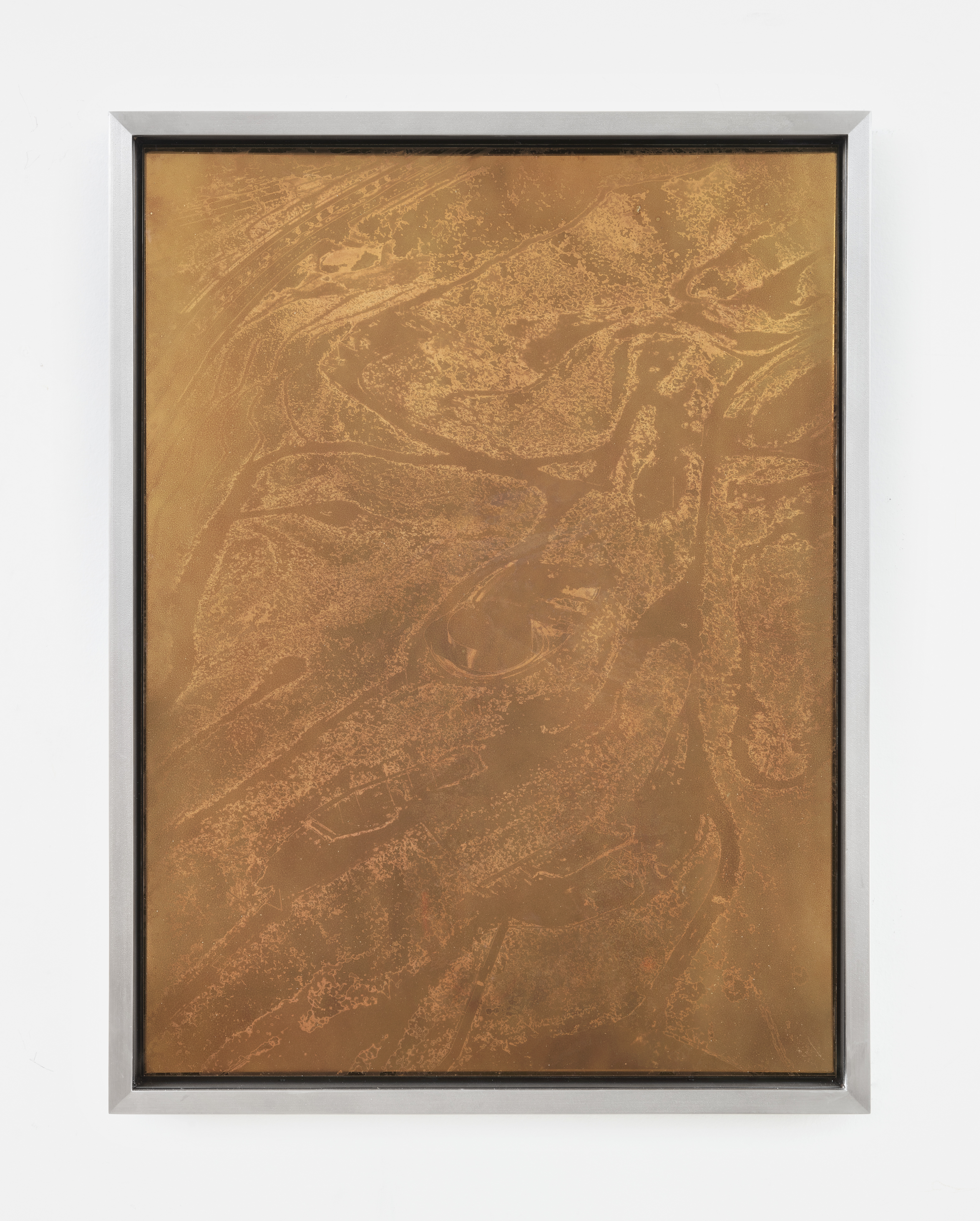 Heliography on high-polished stainless steel plate, stainless steel frame, museum glass (ArtGlass 70)