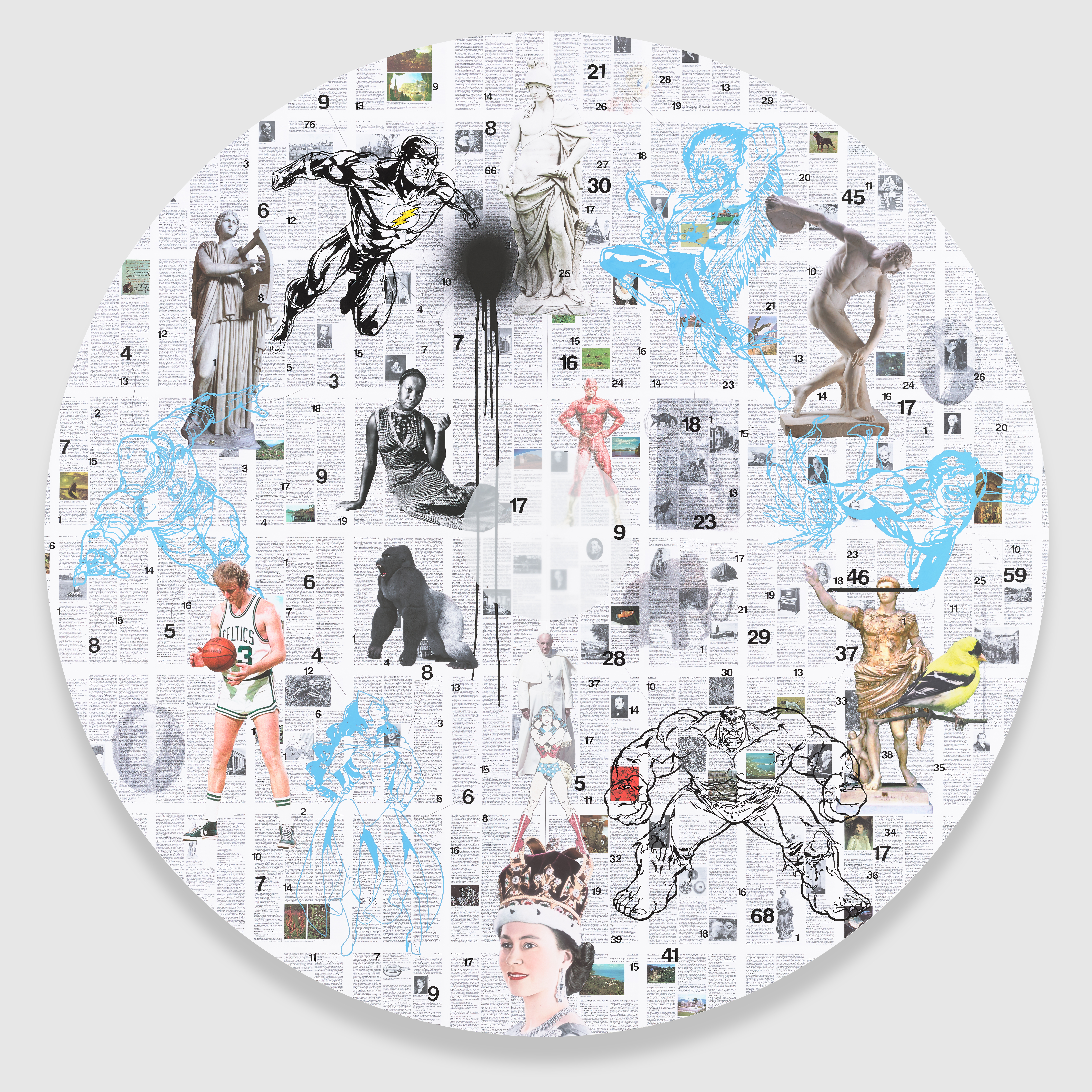 Collage, pigment, graphite, vinyl, enamel, and Moab paper mounted on Sintra, acrylic