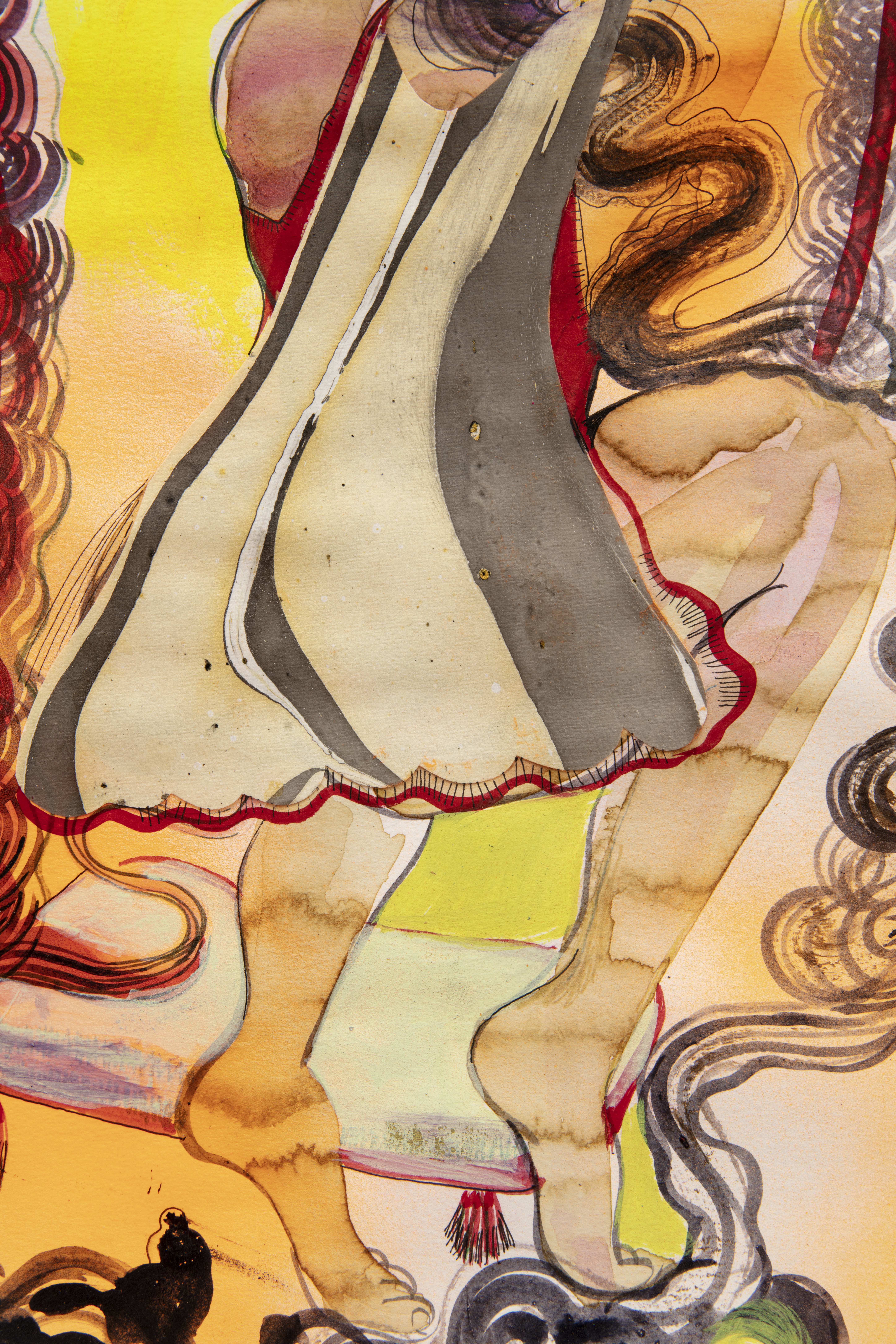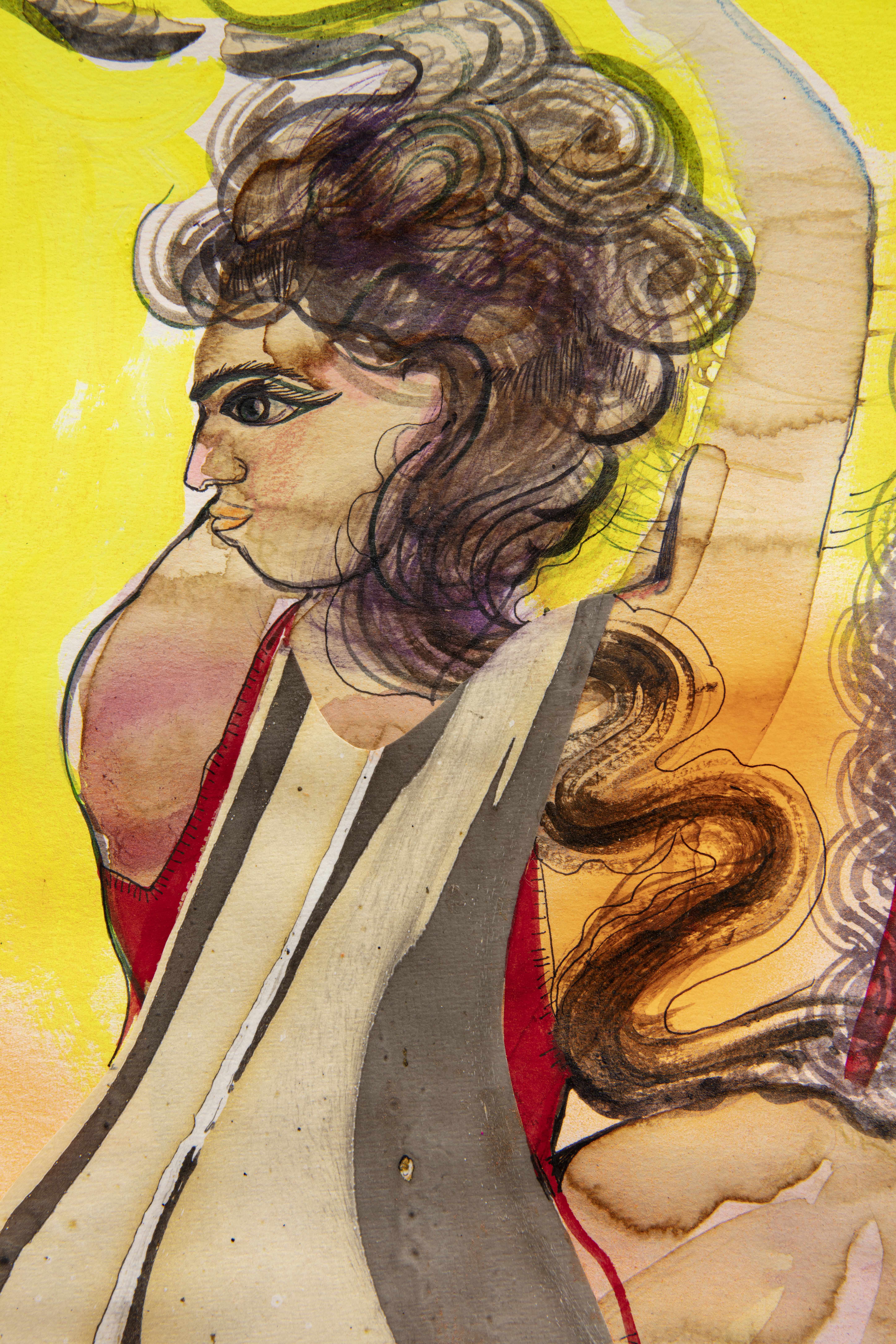 Watercolor paper, ink, dye, acrylic, coffee, sodium bicarbonate, varnish