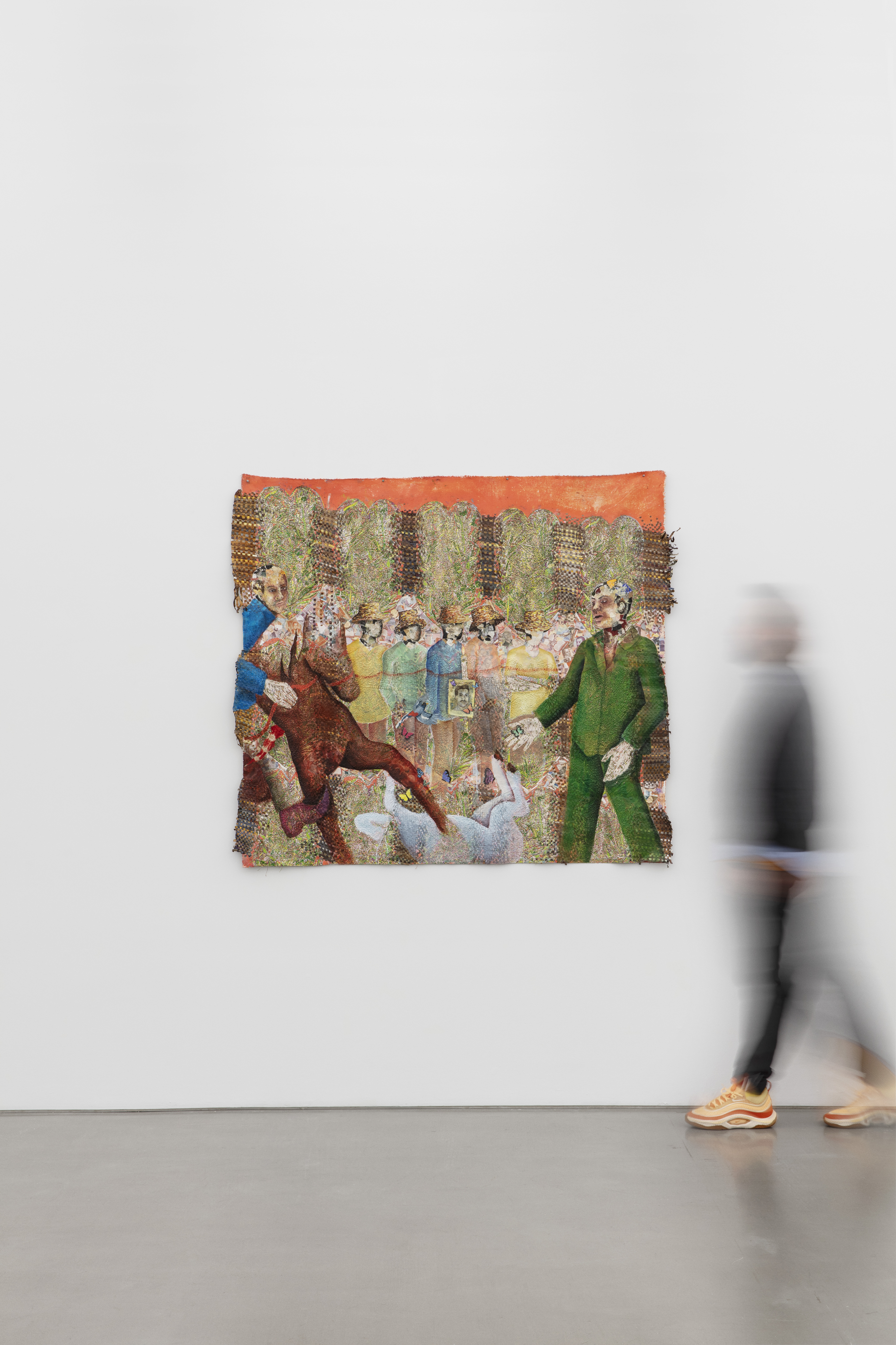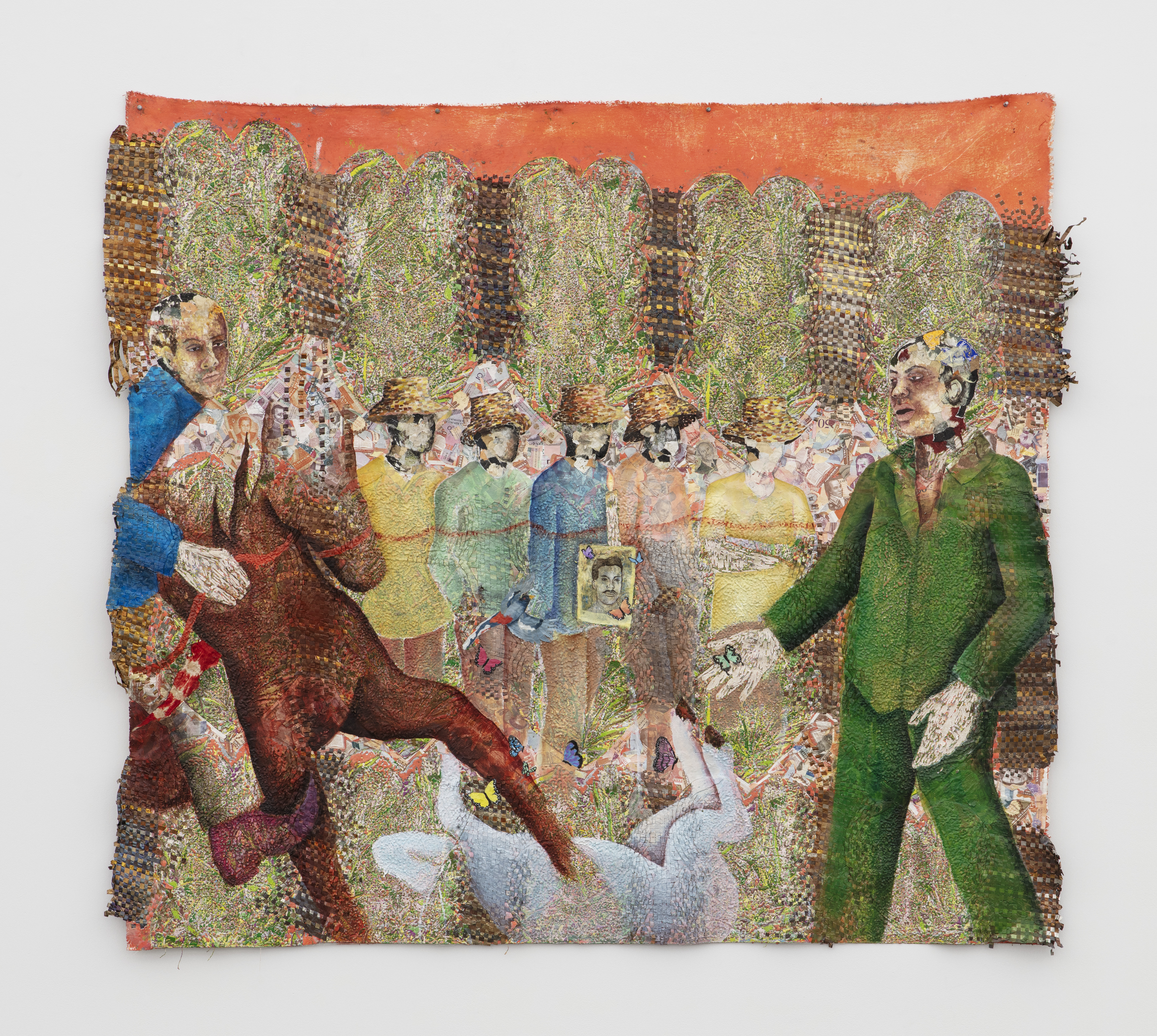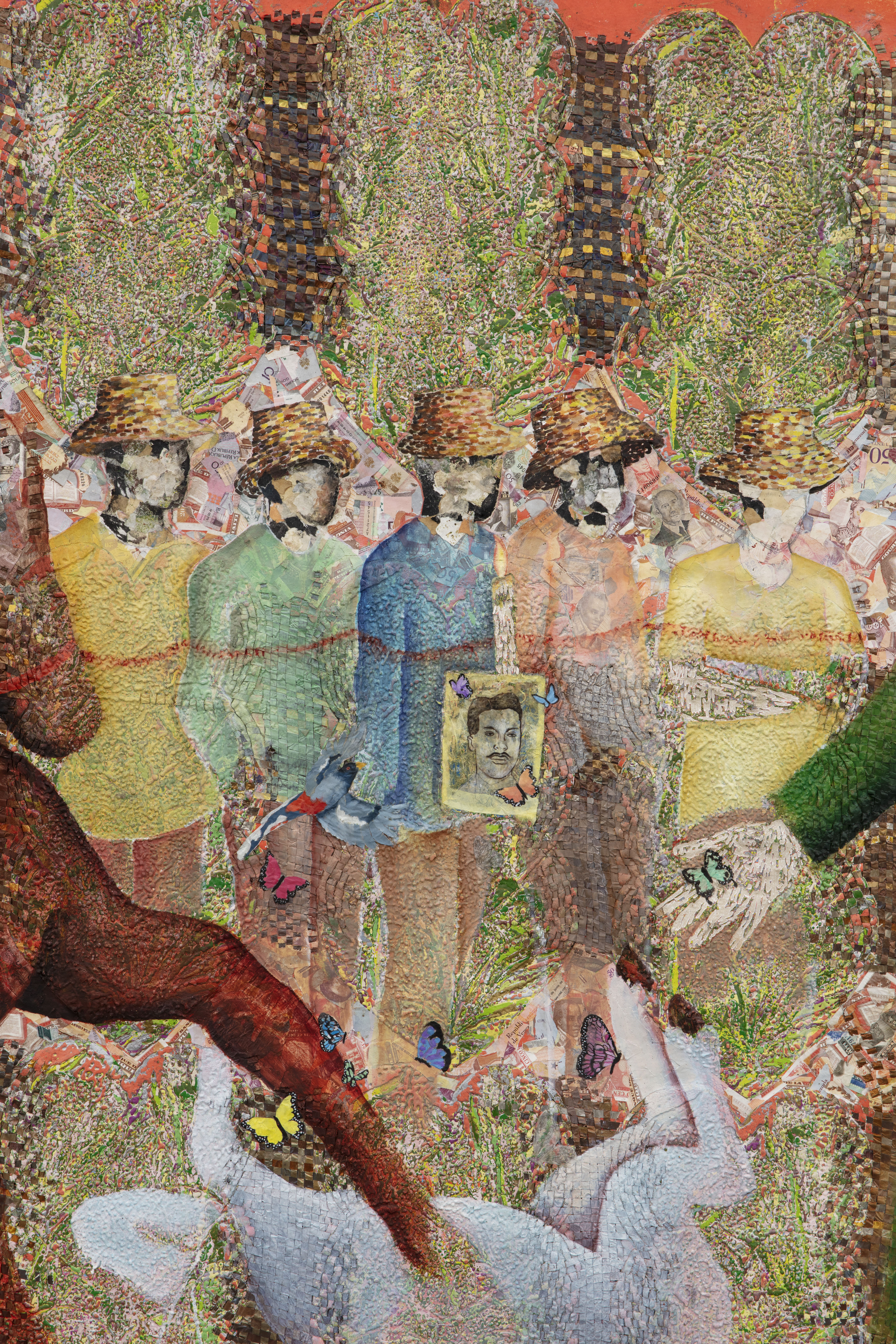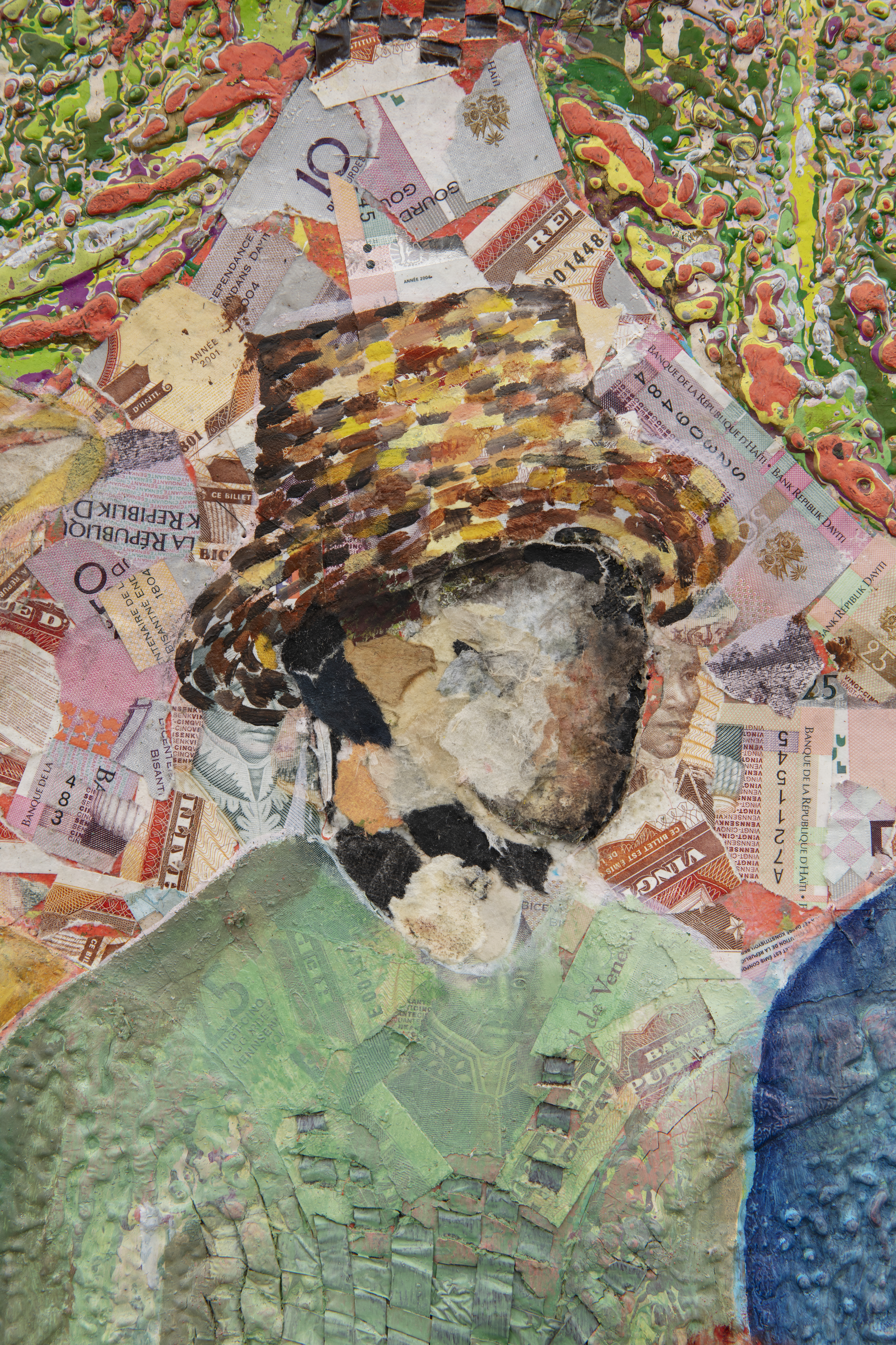 Oil based relief on canvas collage with skinlighting cream, steel, aluminum, bank notes, banana stickers, silkscreen, and tires