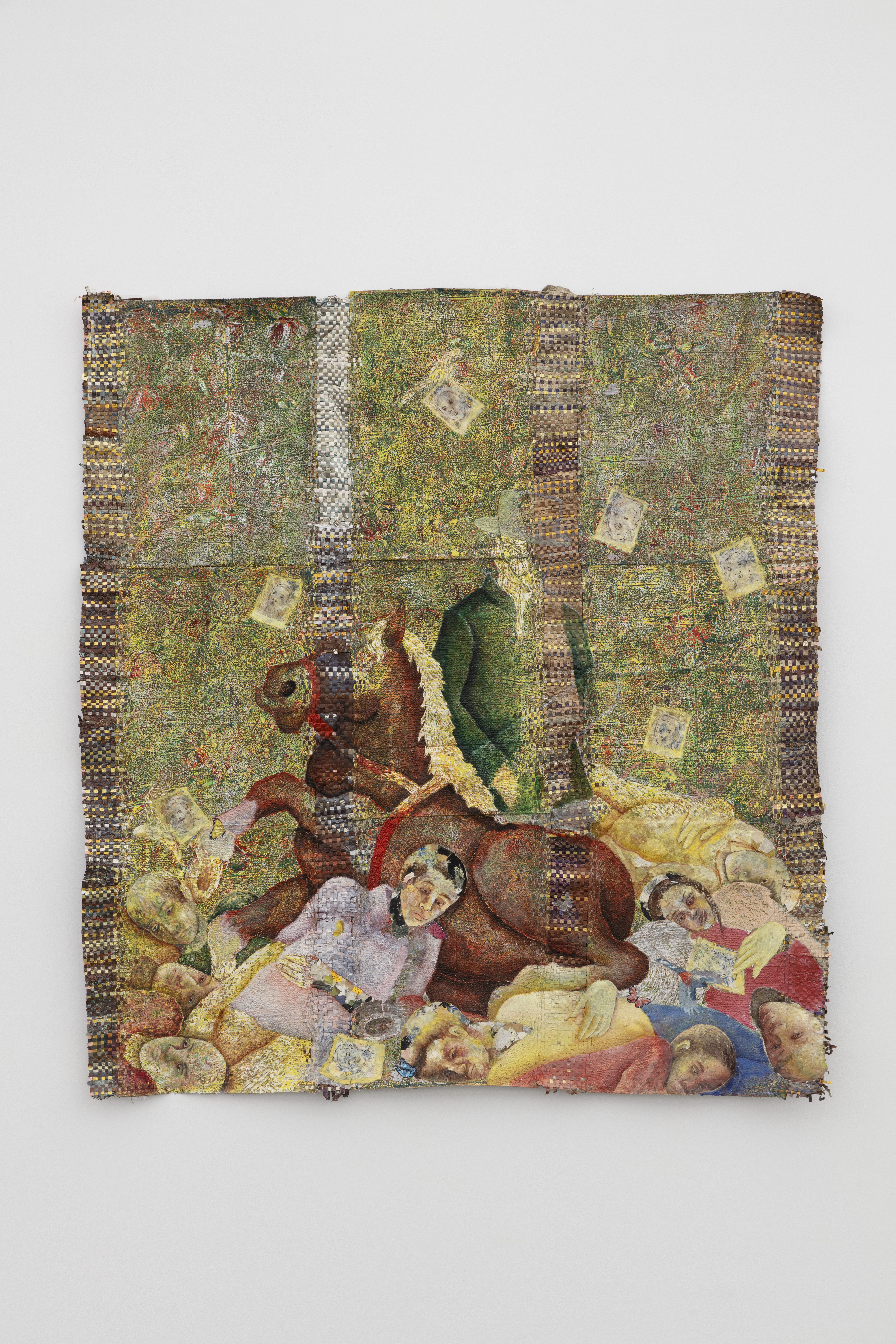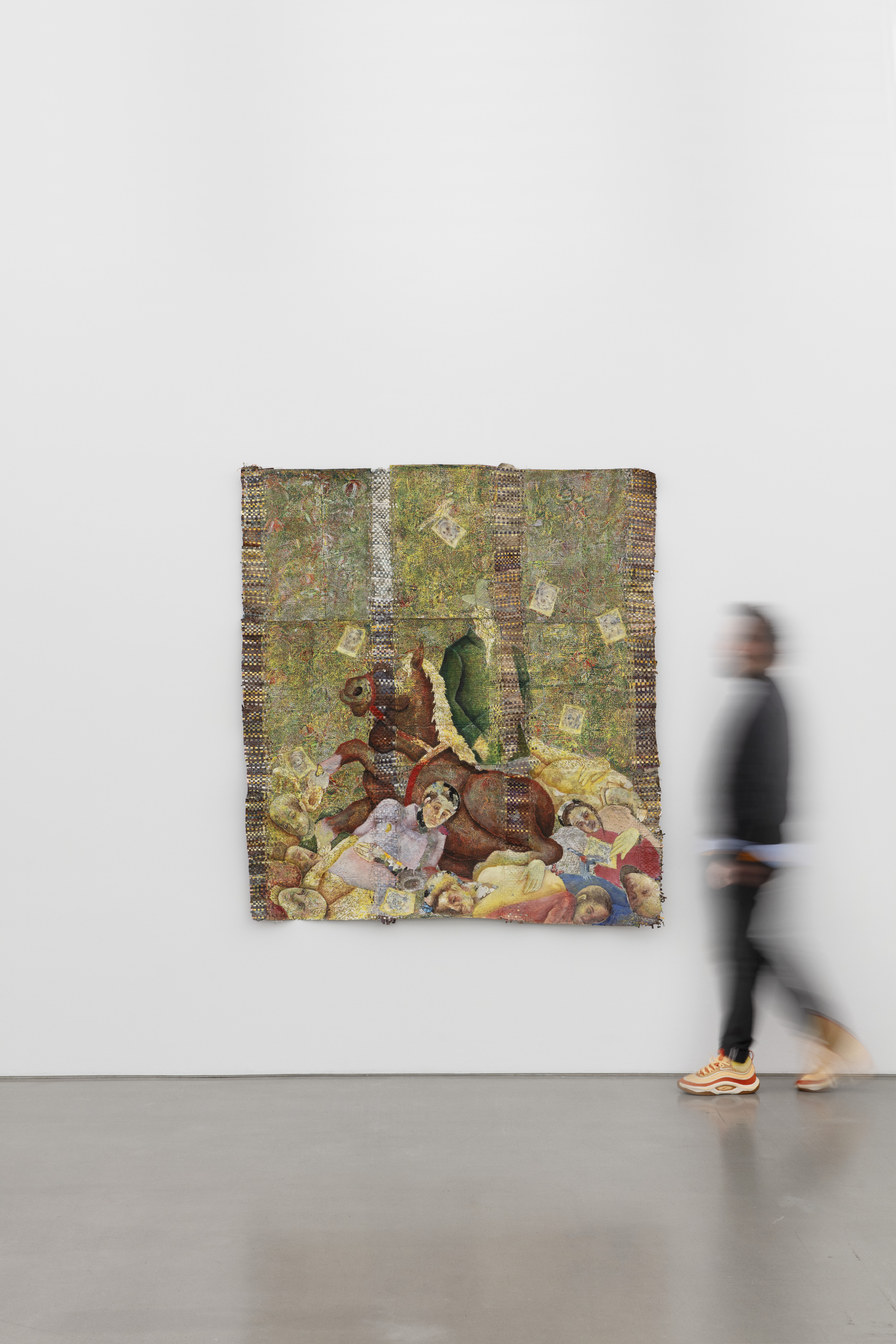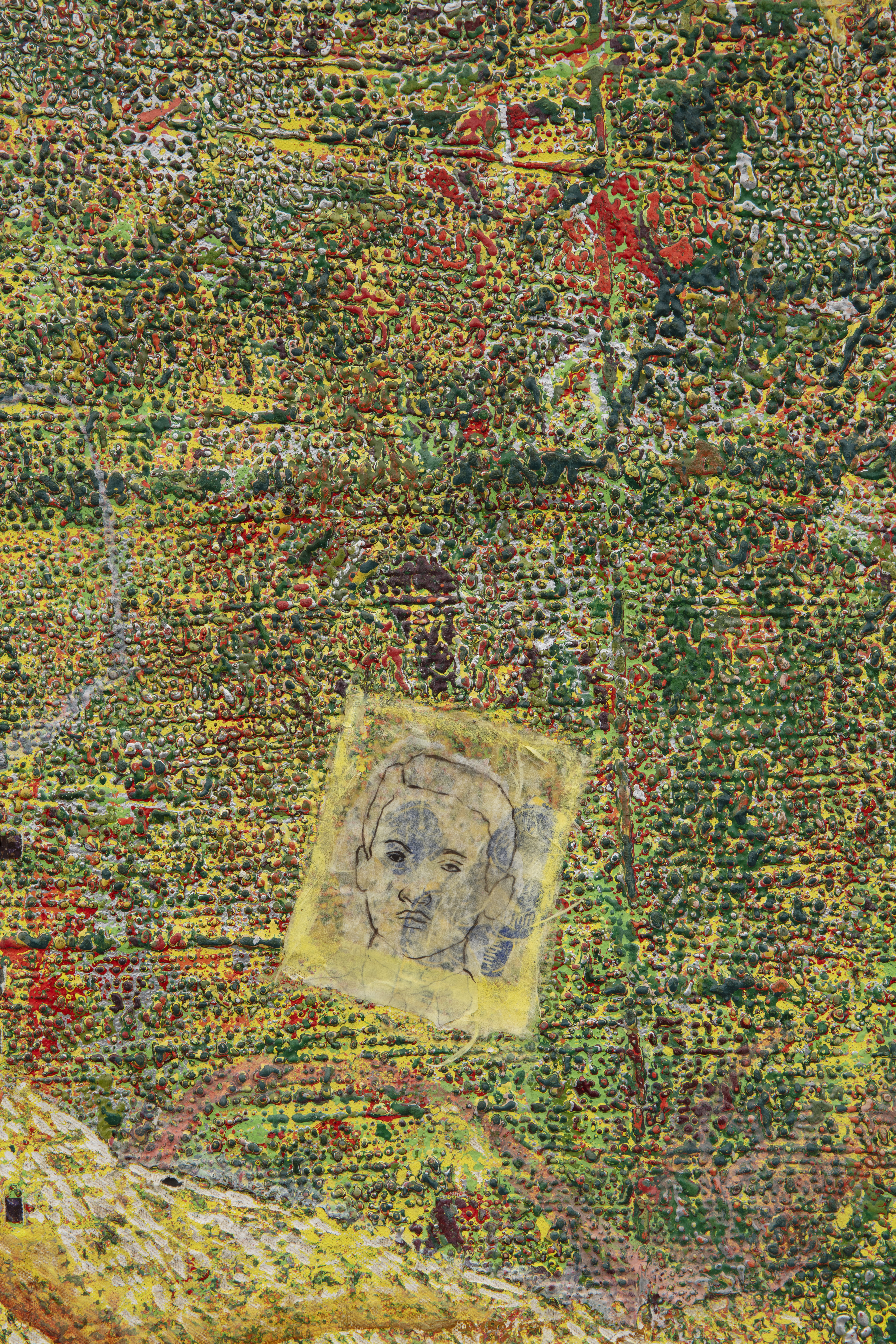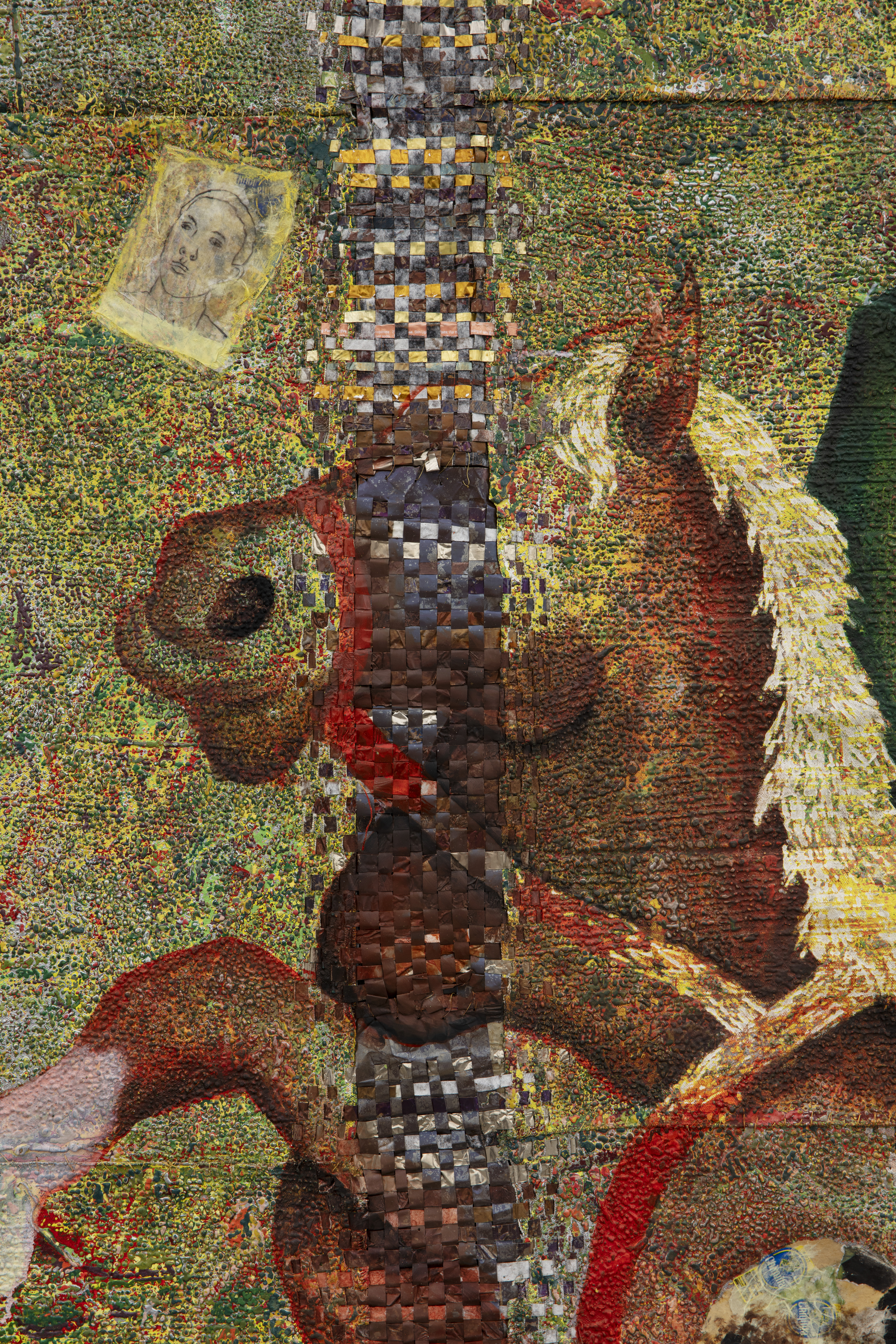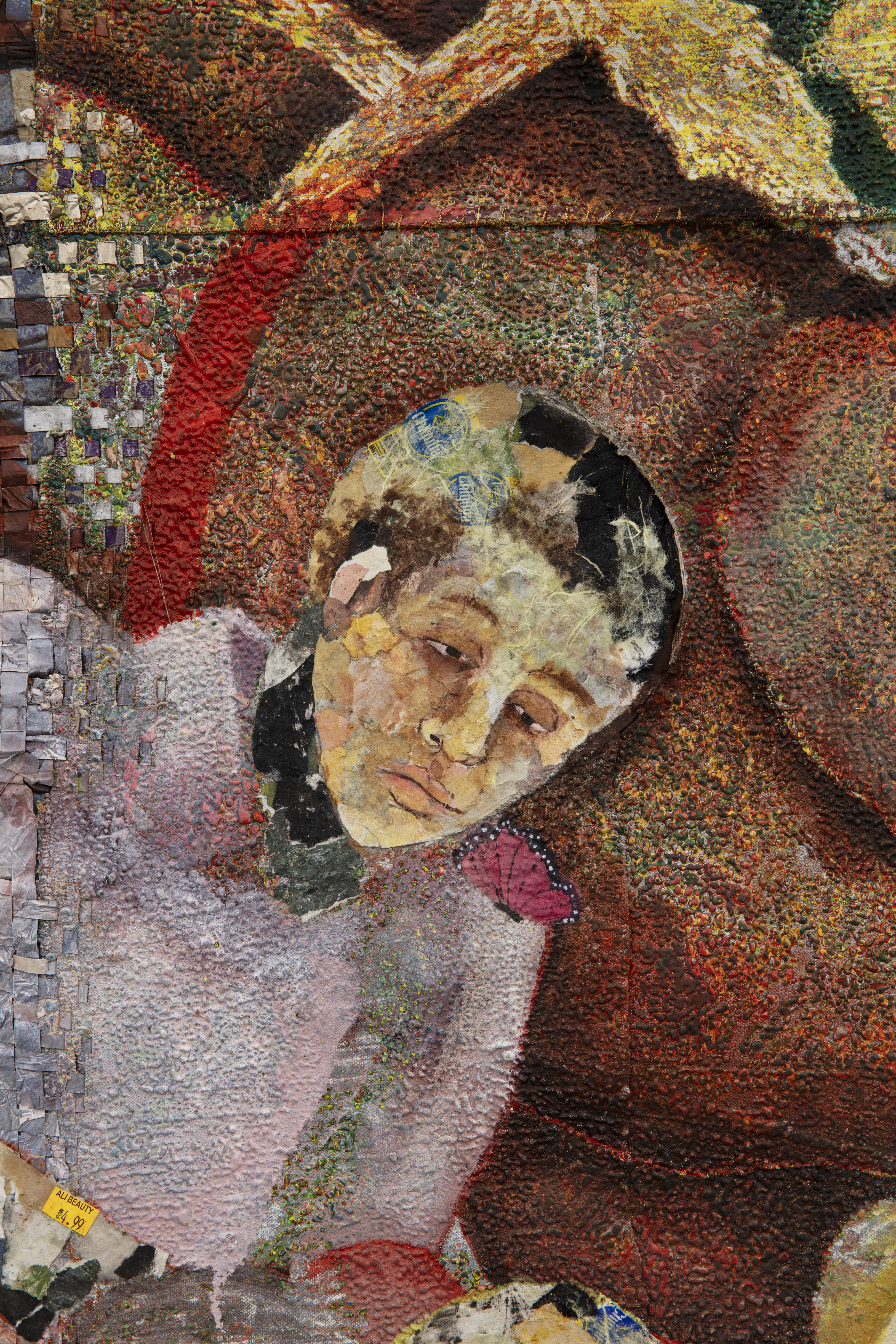 Oil based relief on canvas collage with skinlighting cream, steel, aluminum, bank notes, prices tags banana stickers, silkscreen, and tires