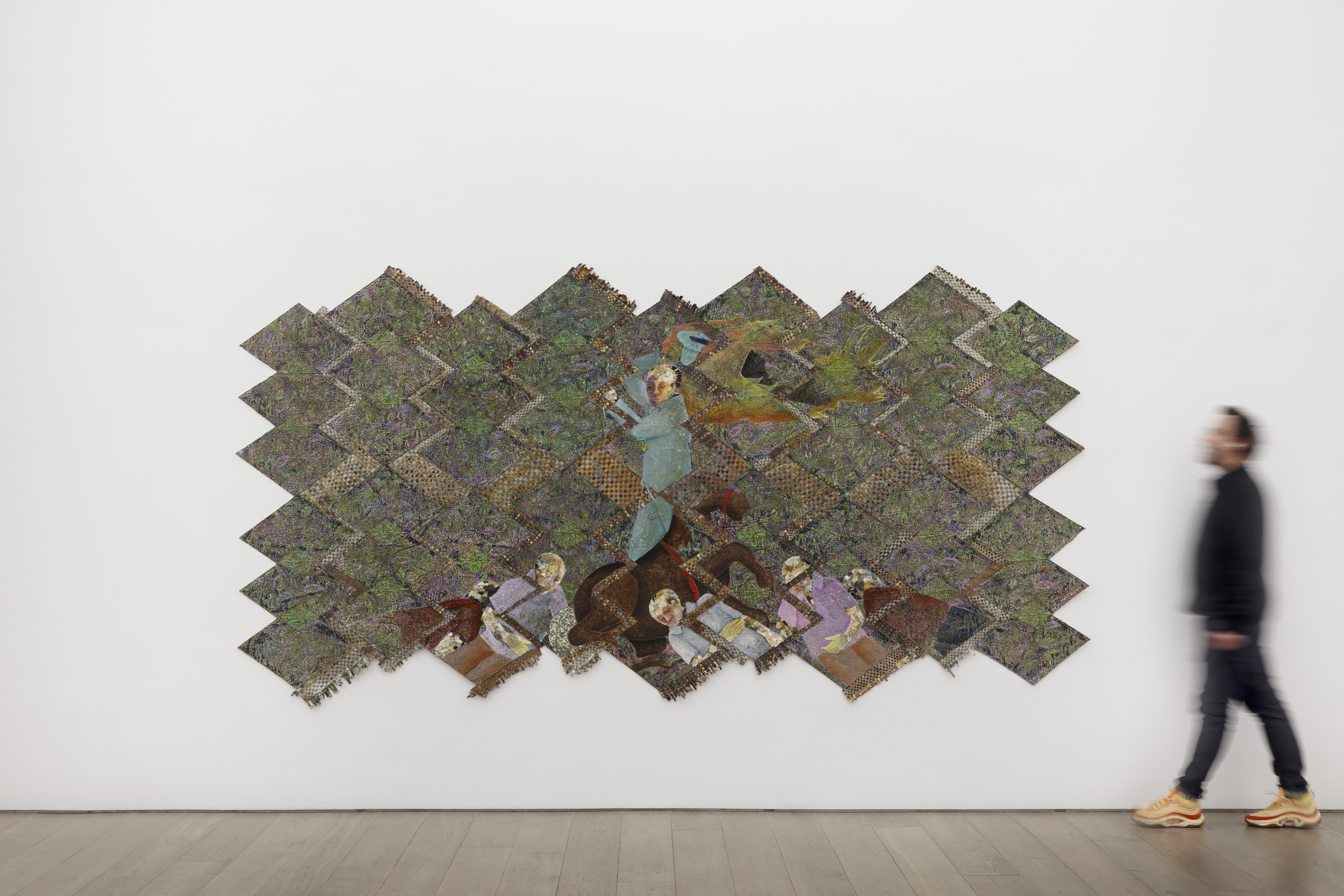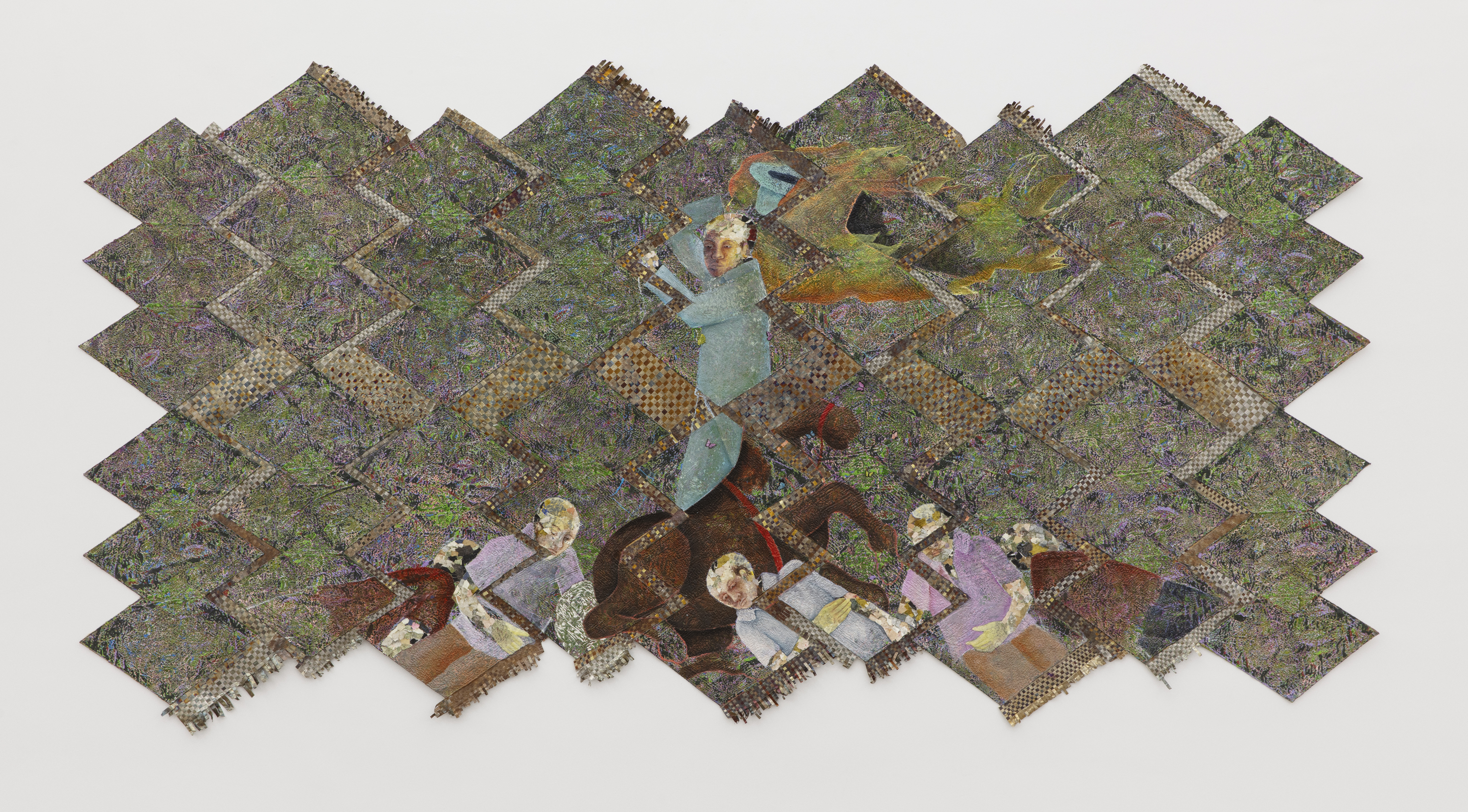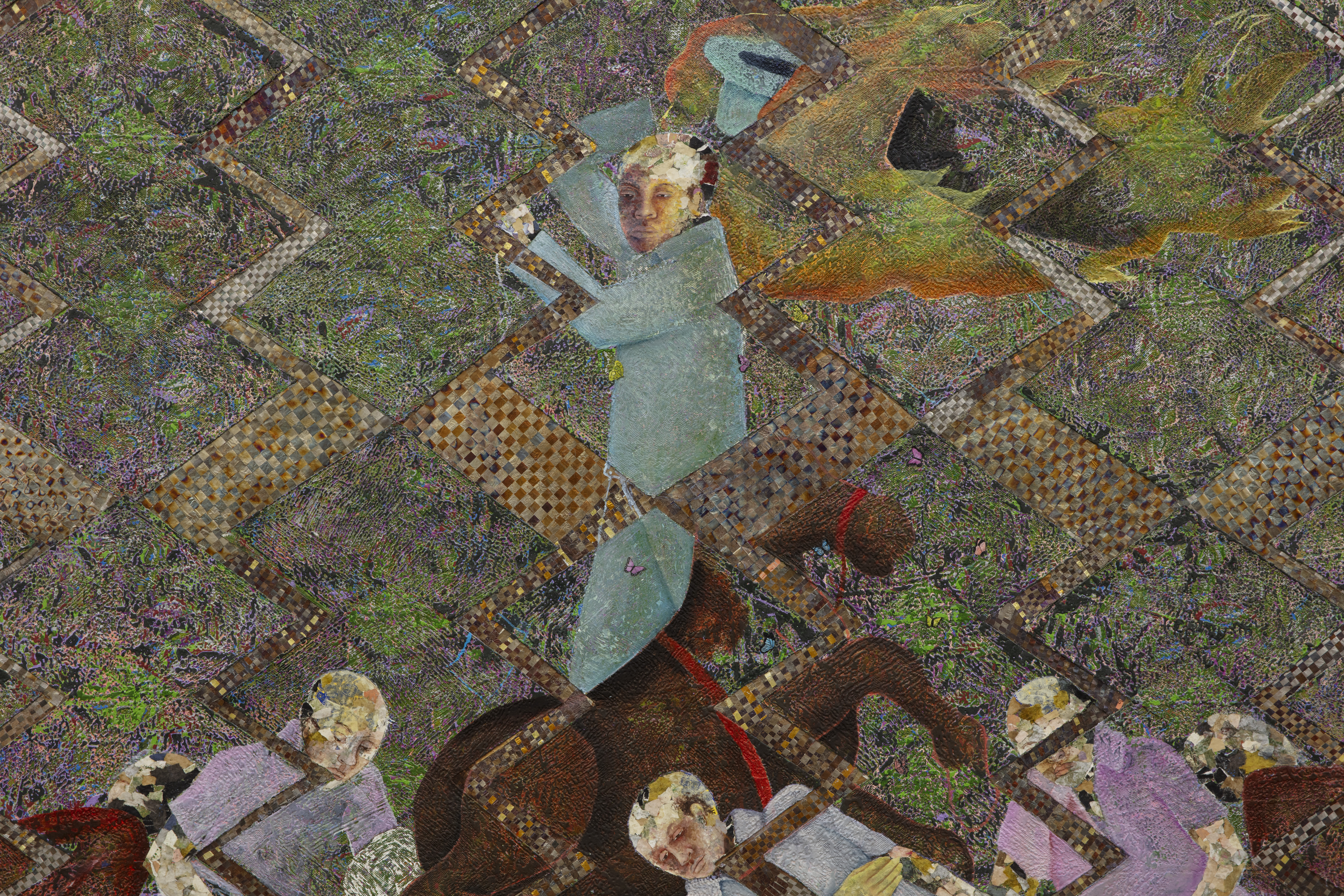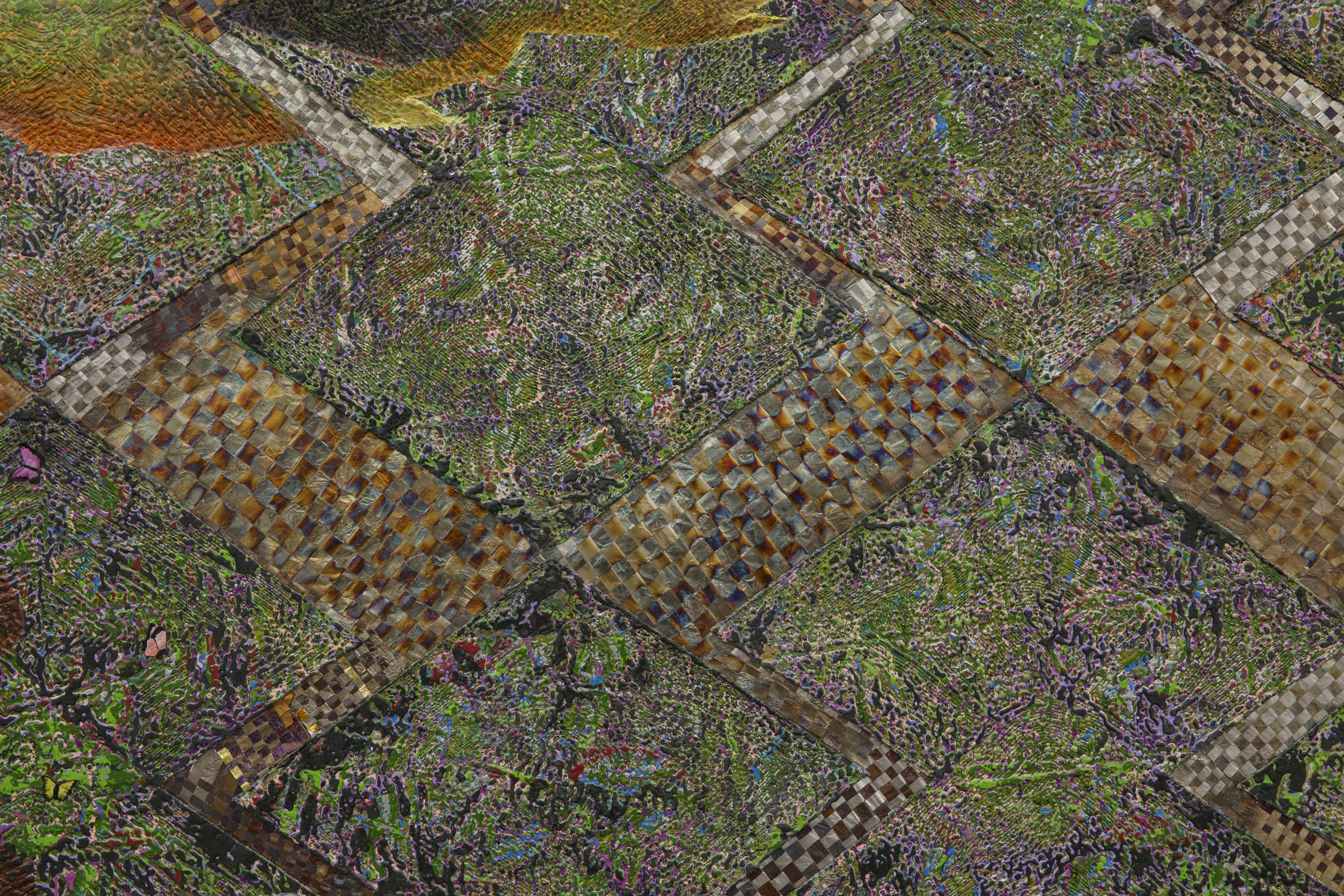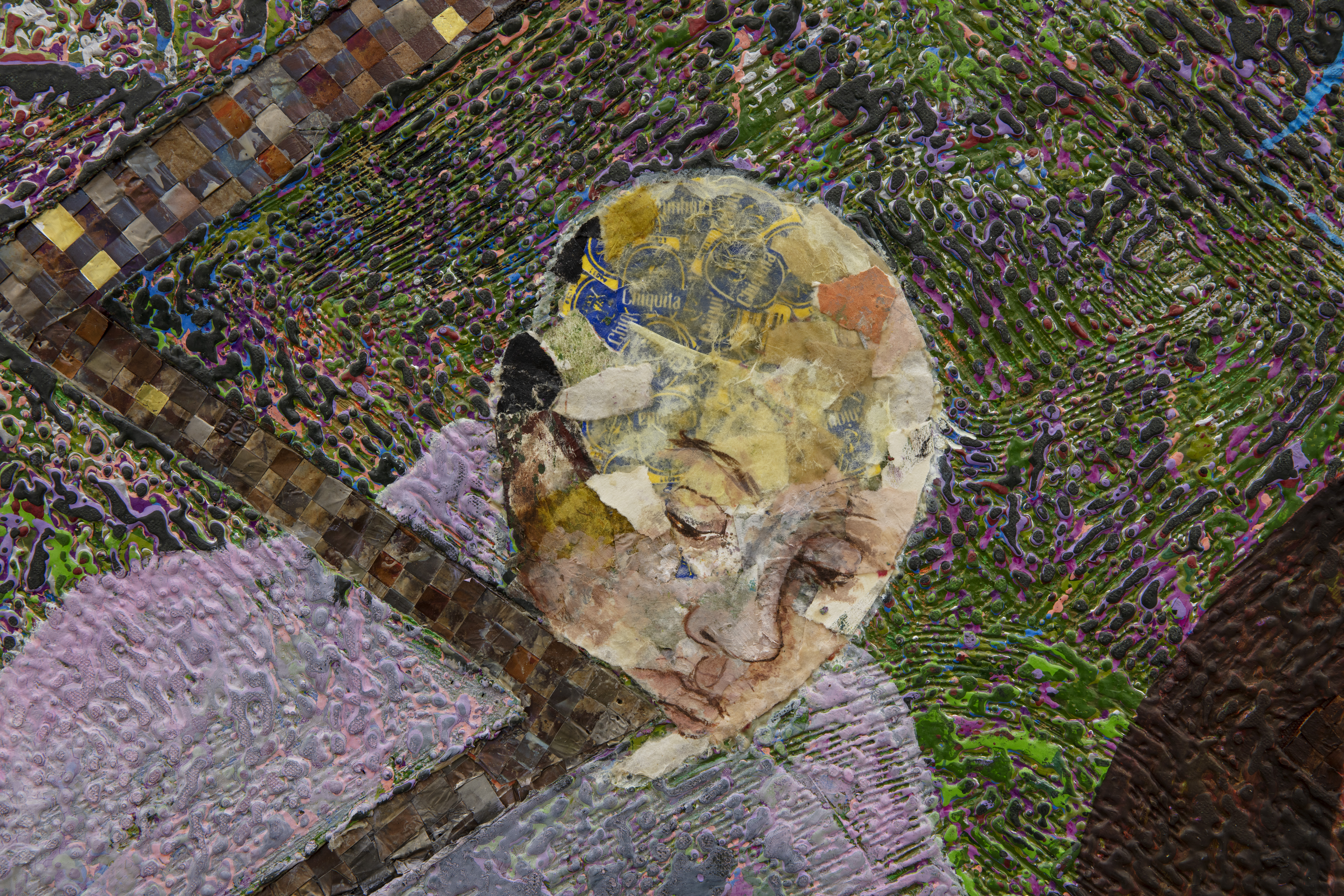 Oil based relief on canvas collage with skin lightening cream, steel, aluminum, banknotes, banana stickers, silkscreen, paper and tires
