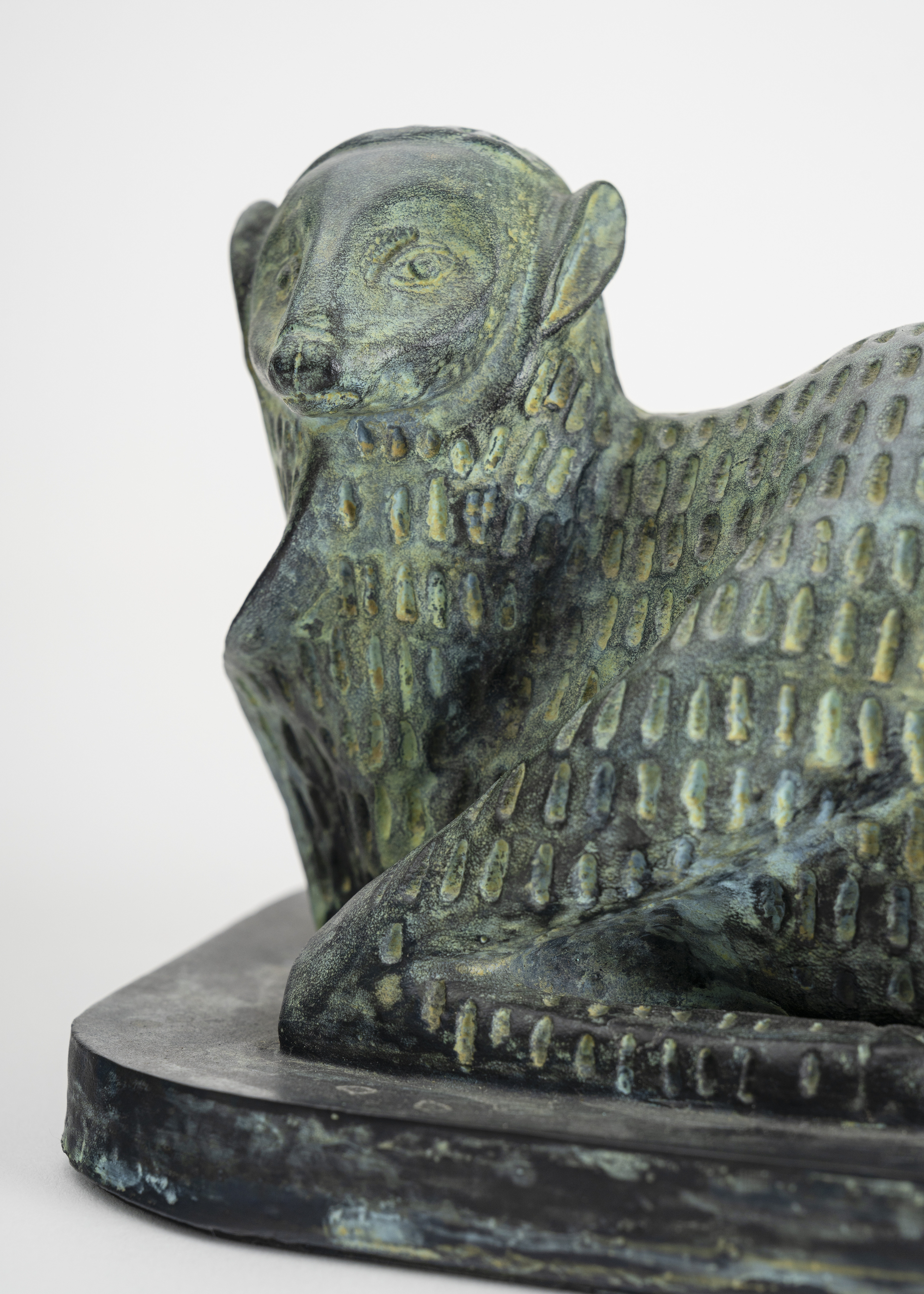 Bronze patiné, fonte à la cire perdue, patine verte, socle en grès émaillé