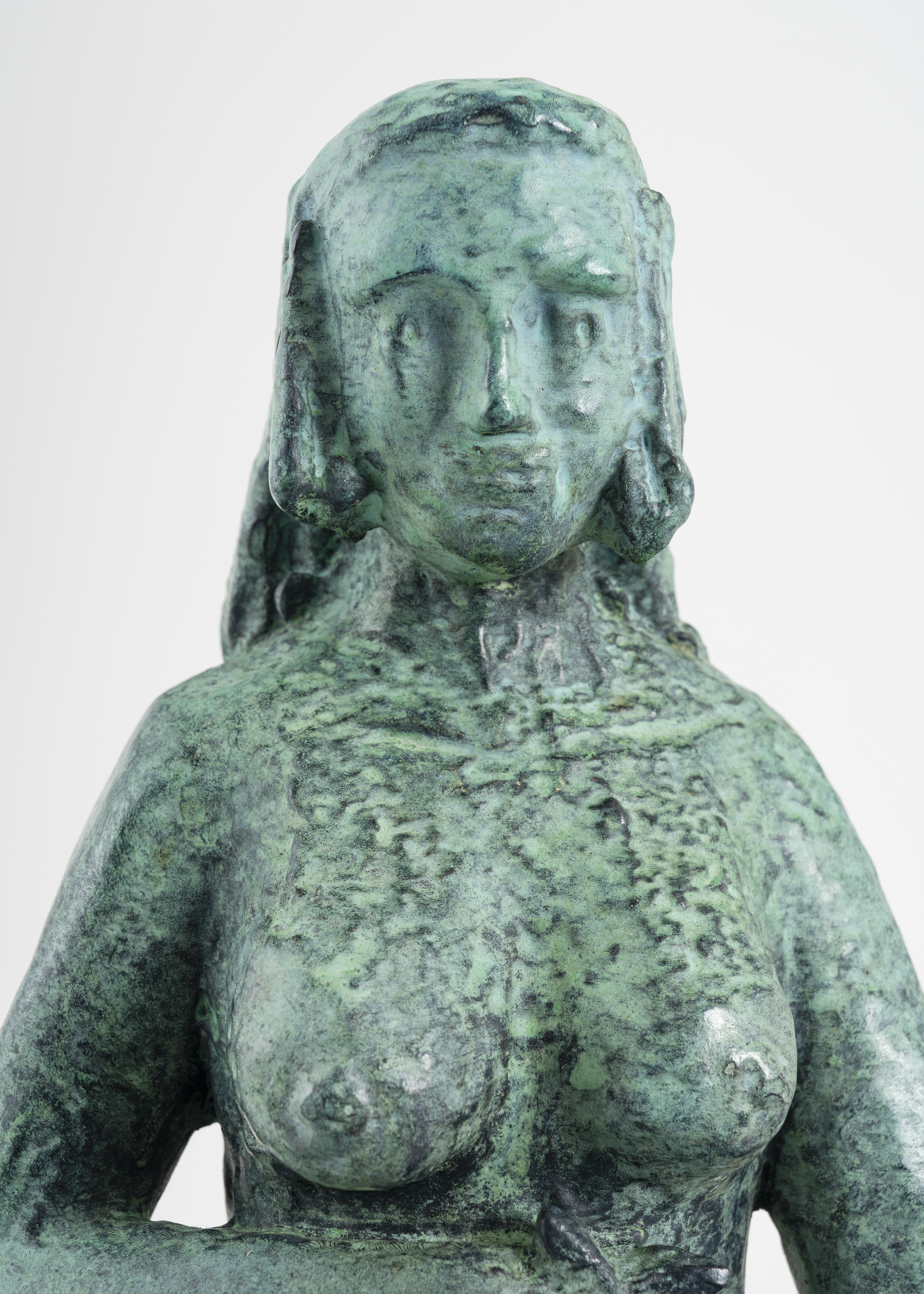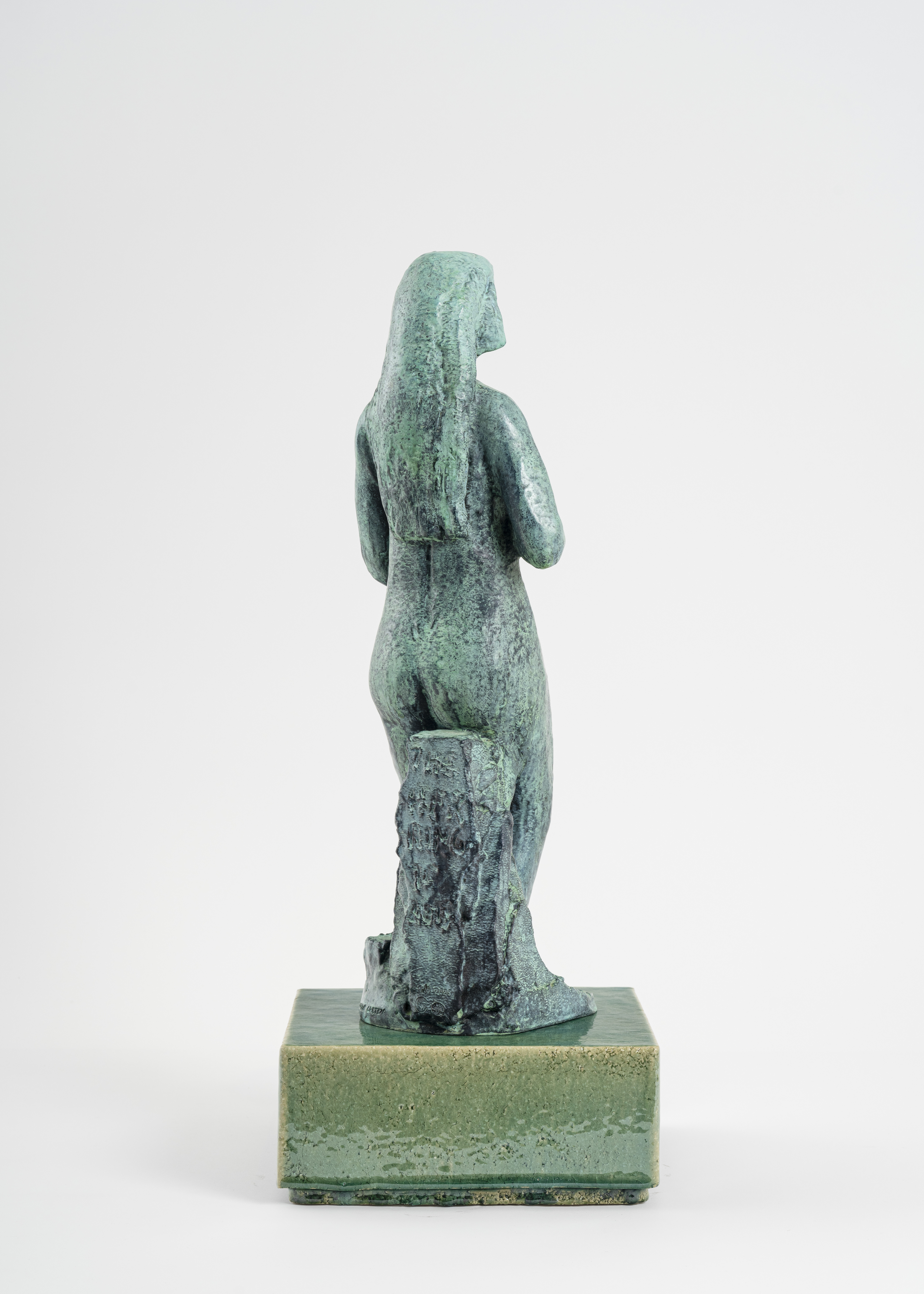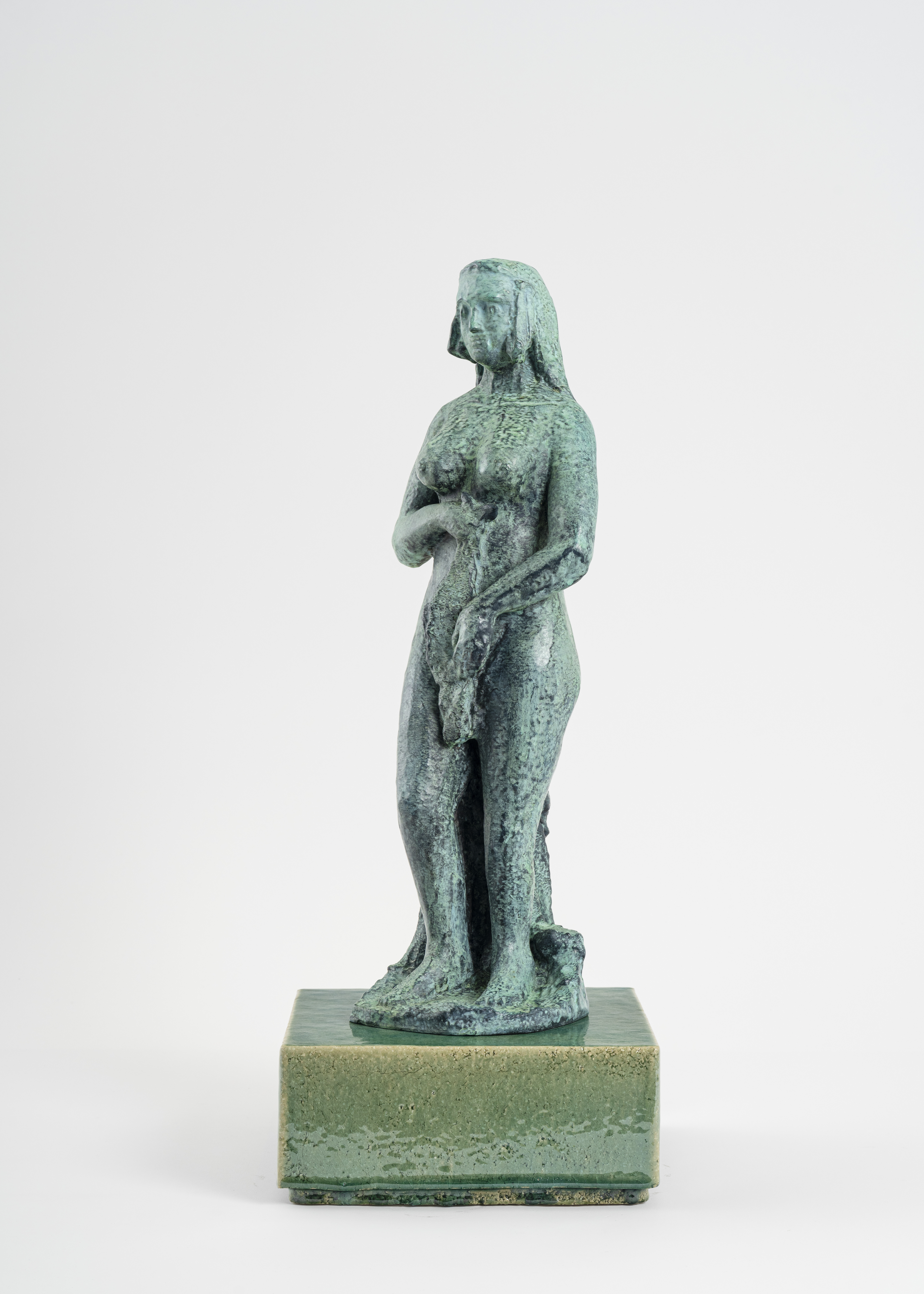 Bronze patiné, fonte à la cire perdue, patine verte, socle en grès émaillé