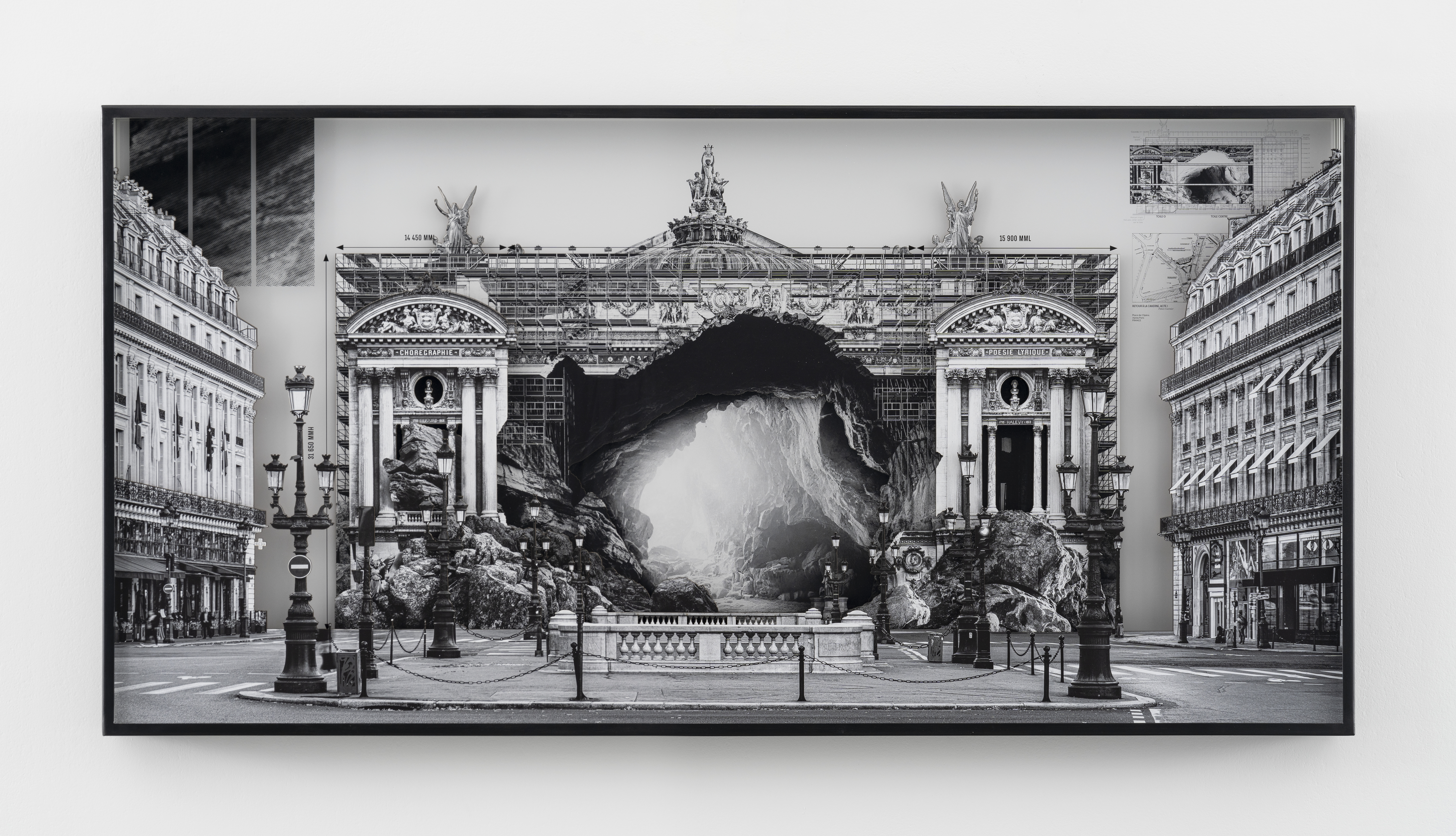 Black and white print multilayer on laser cut cardboard, printed duraclear, steel and plexiglass