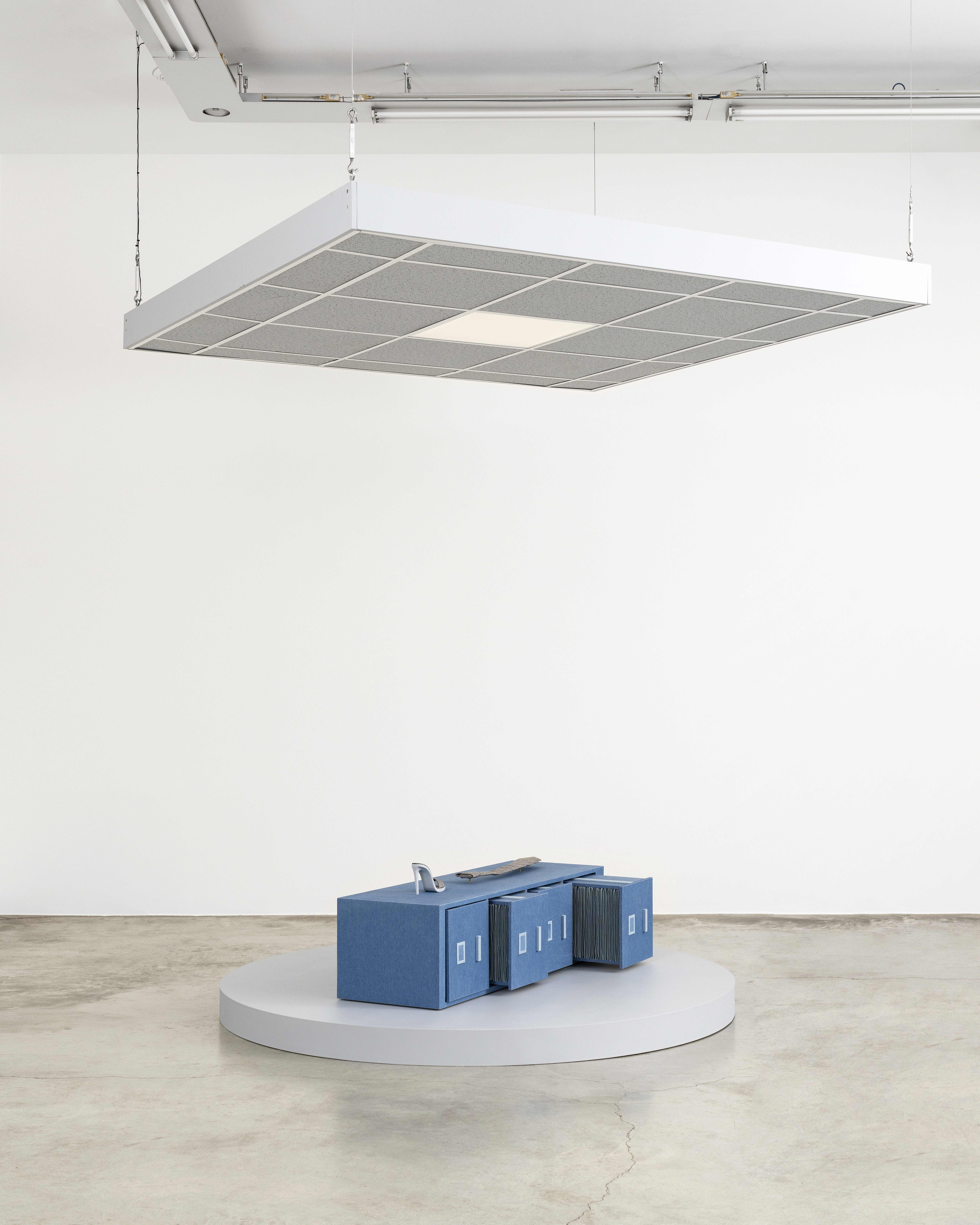 Sculpture au sol : bois, laiton, denim, acier, tissu résistant aux intempéries, vis. Panneau de plafond : cadre en aluminium, MDF, lumières LED.