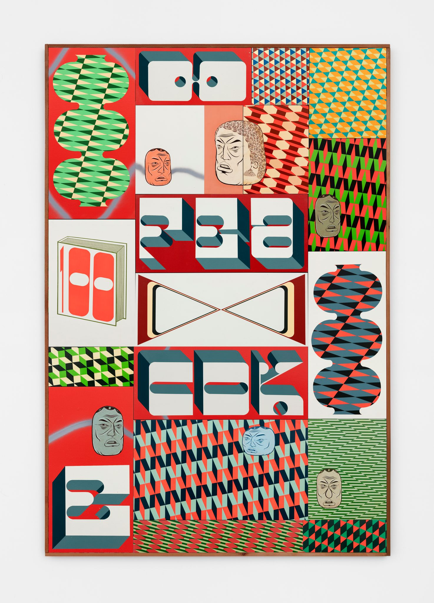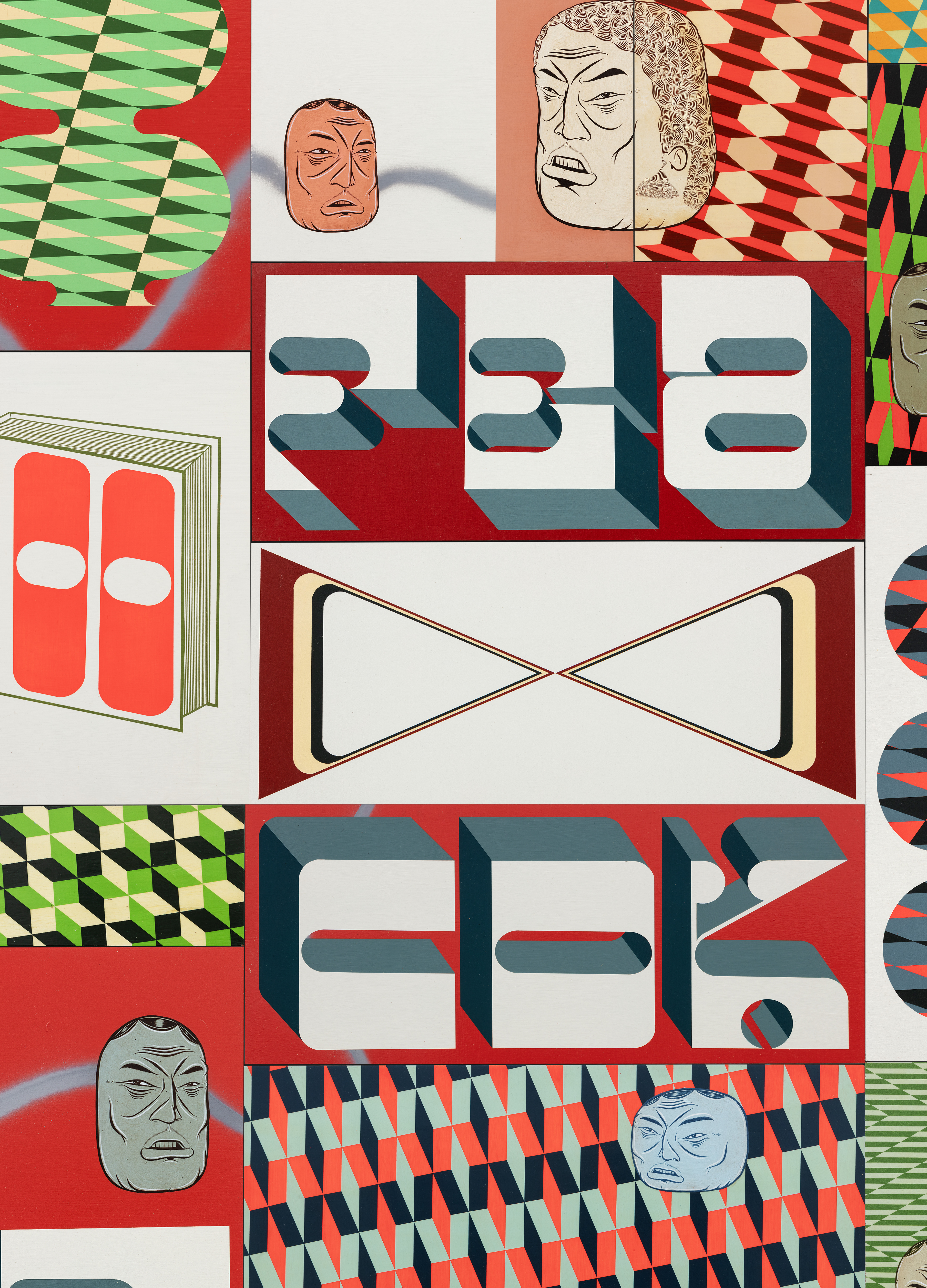 Acrylic, gouache, and aerosol on panel; 18 elements