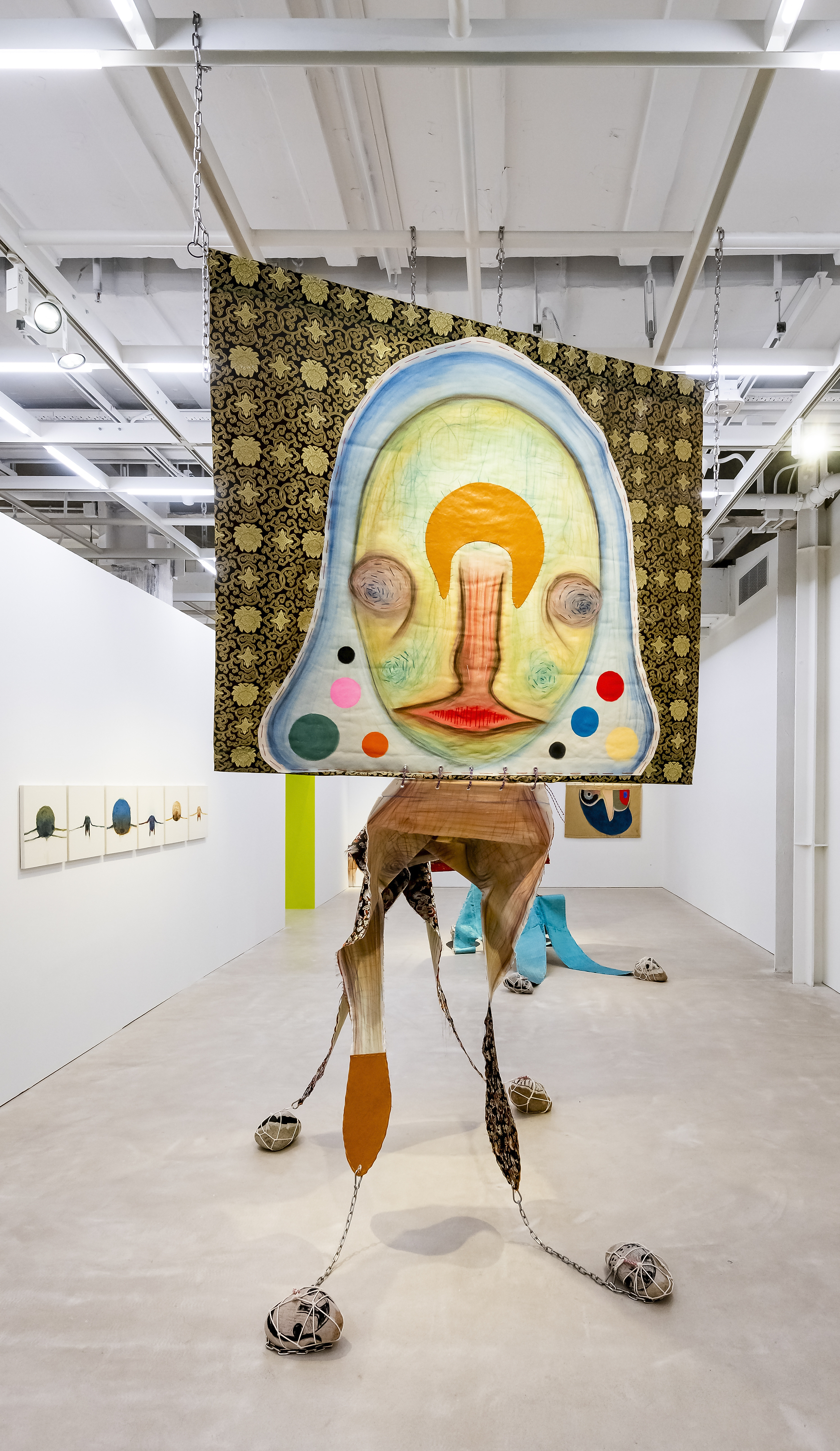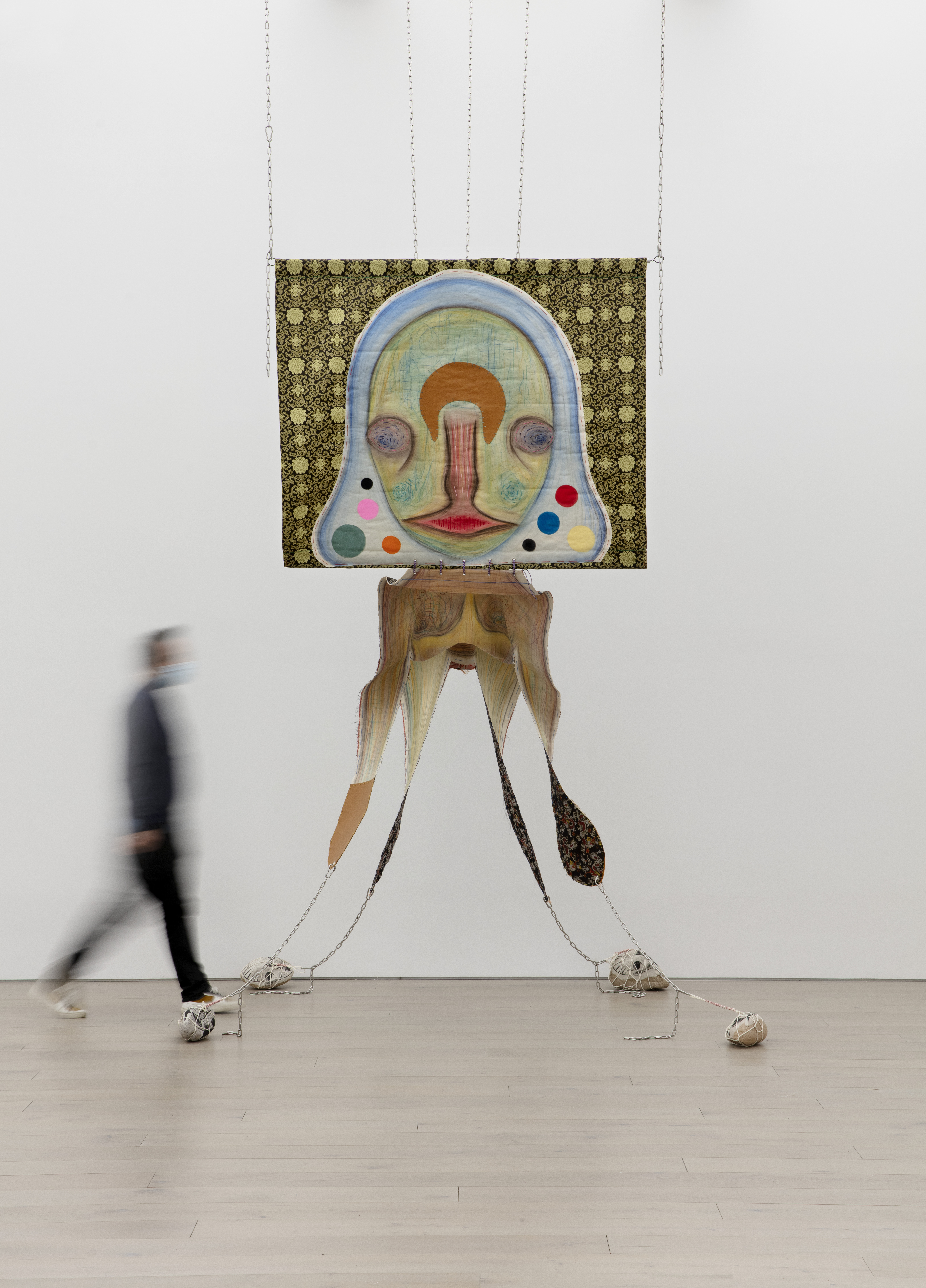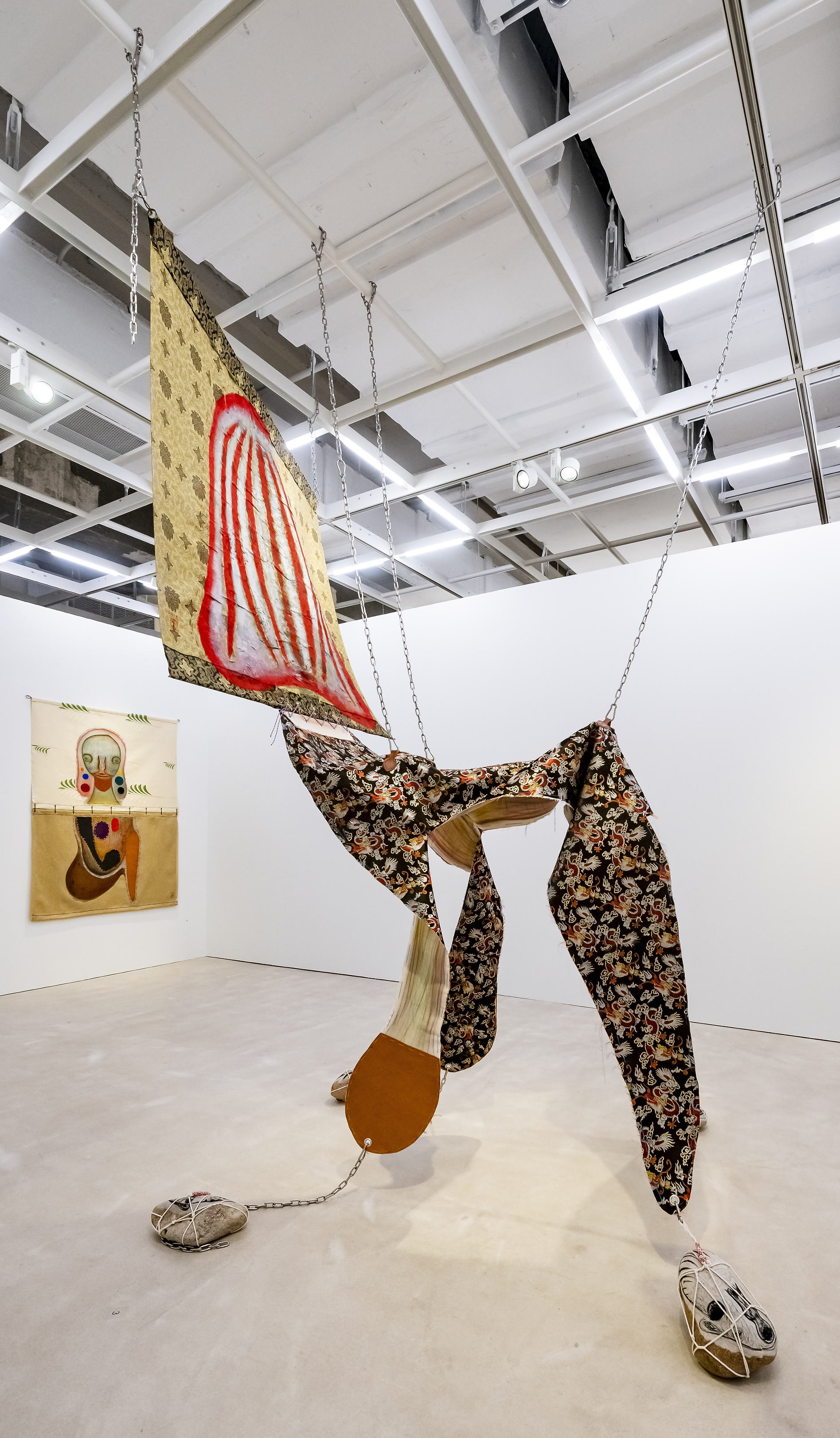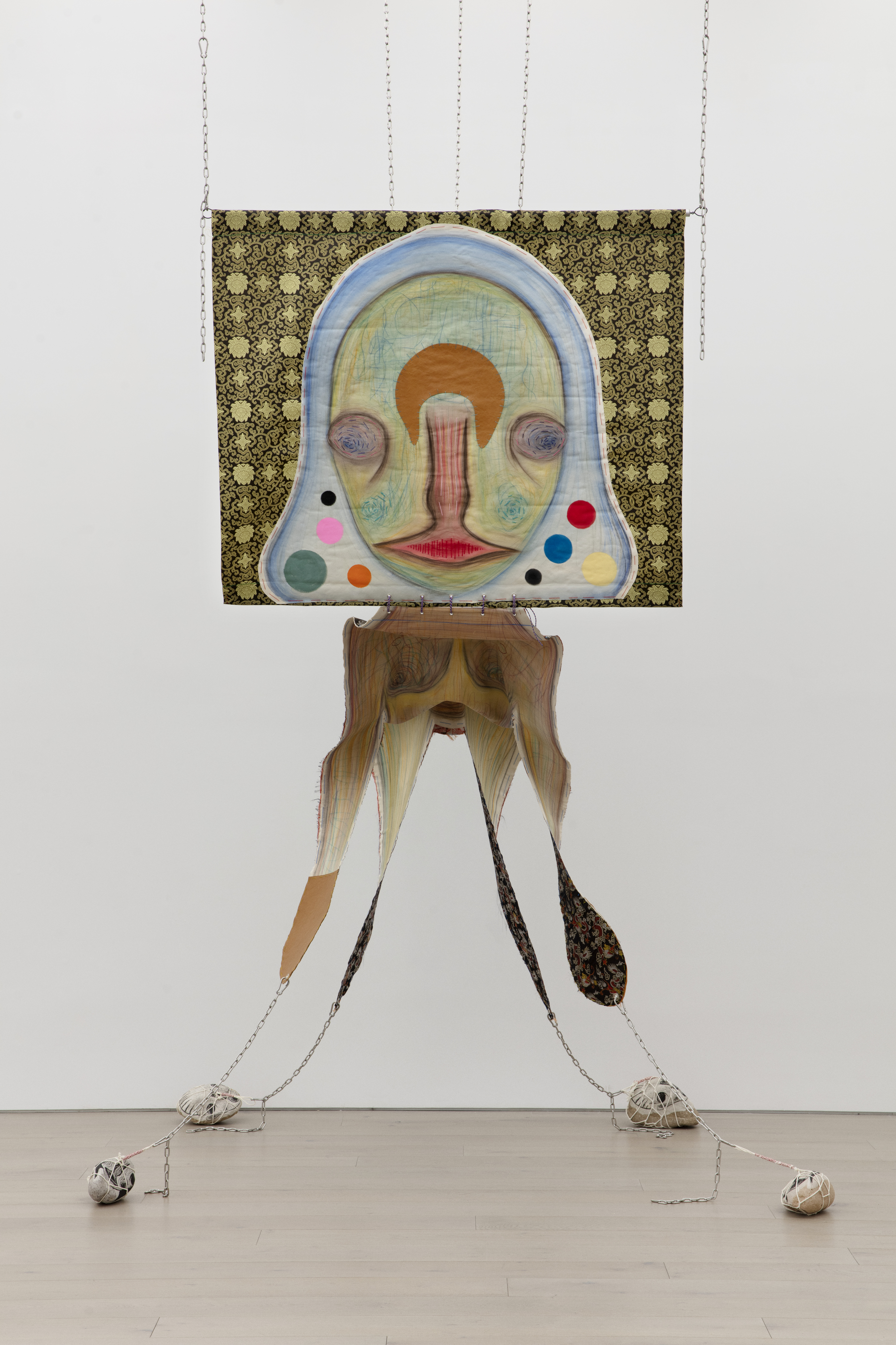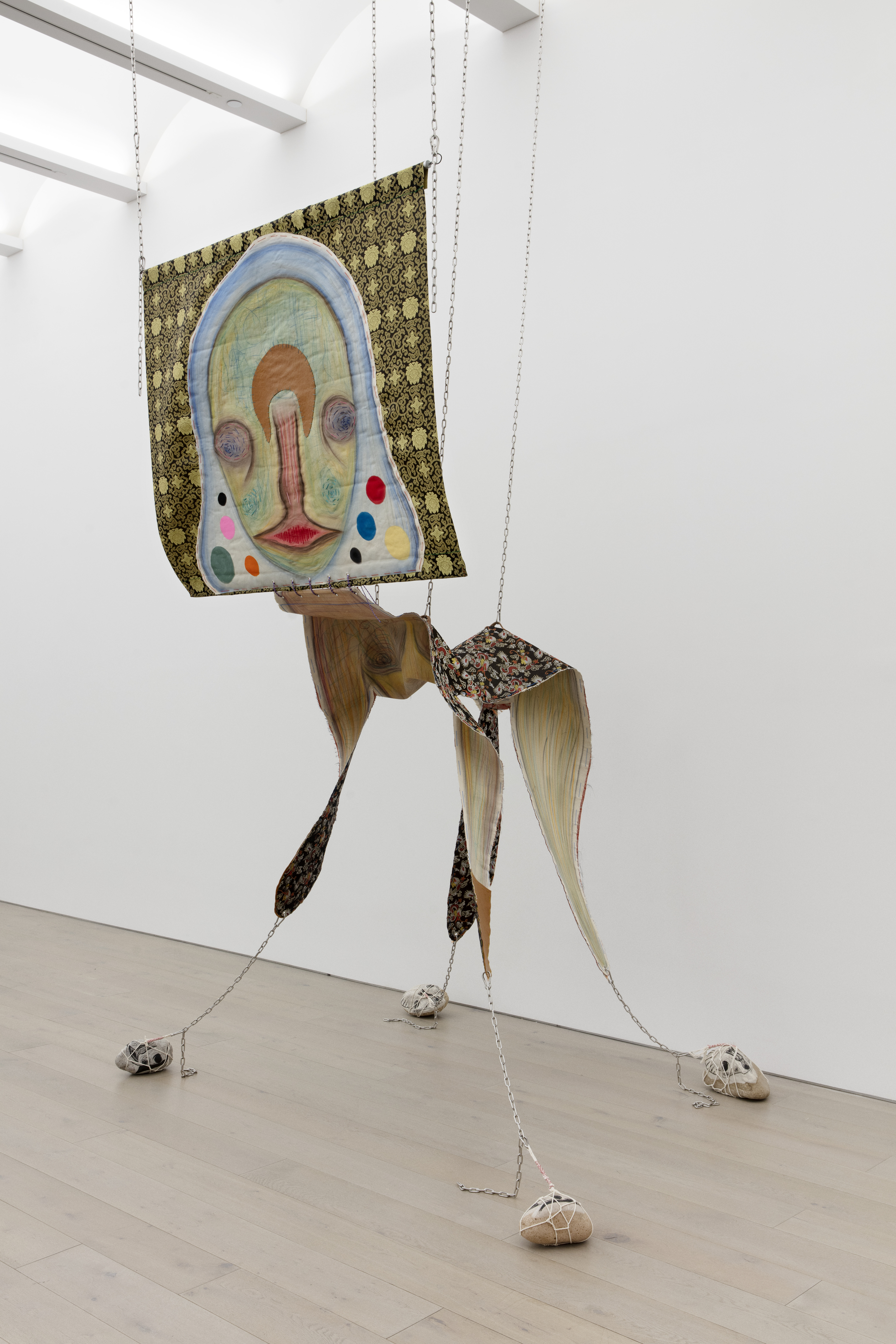 Pastel, acrylic, embroidery and leather on fabric; lithograph and strings on stone; stainless steel, aluminium, iron and chain