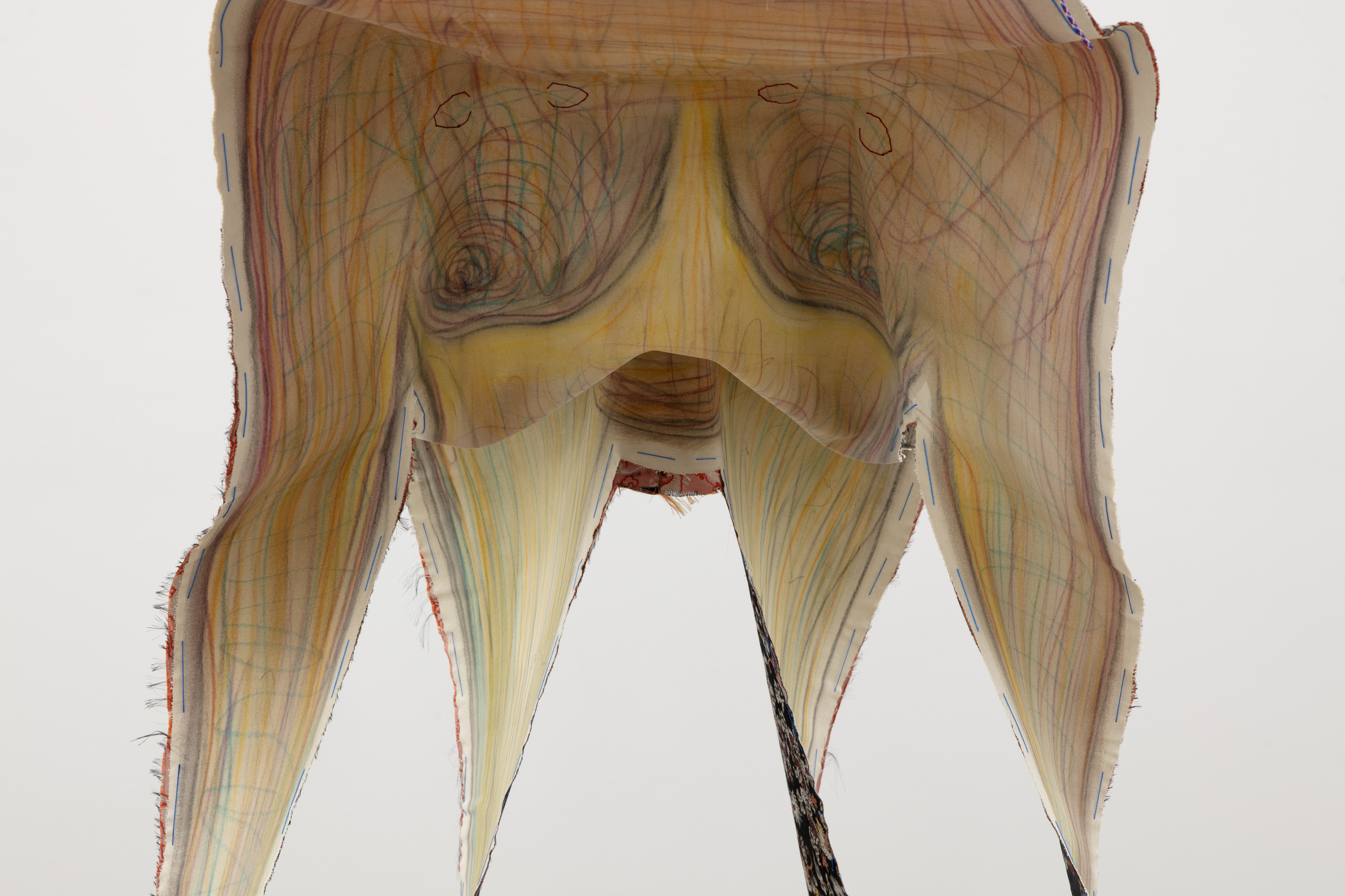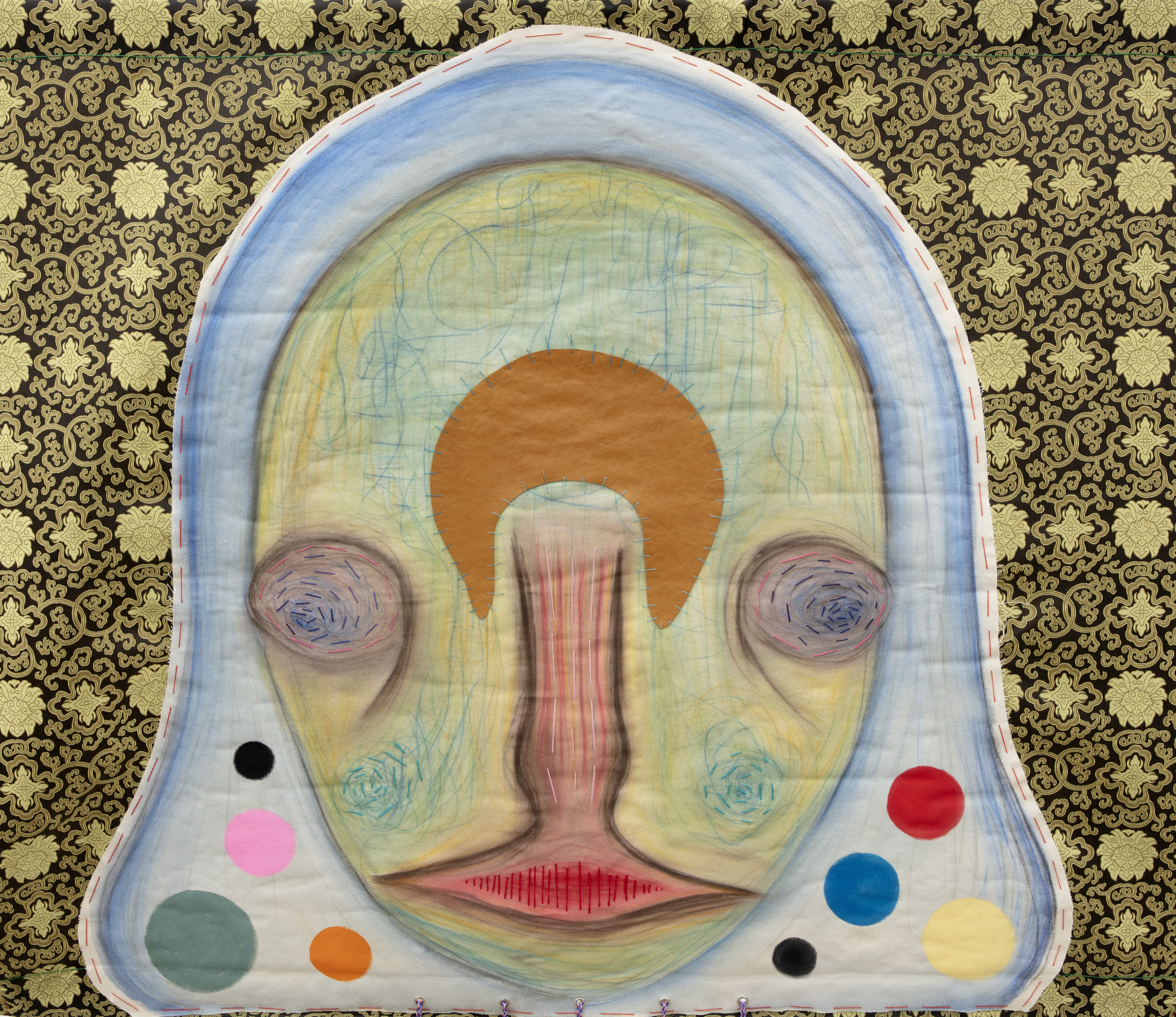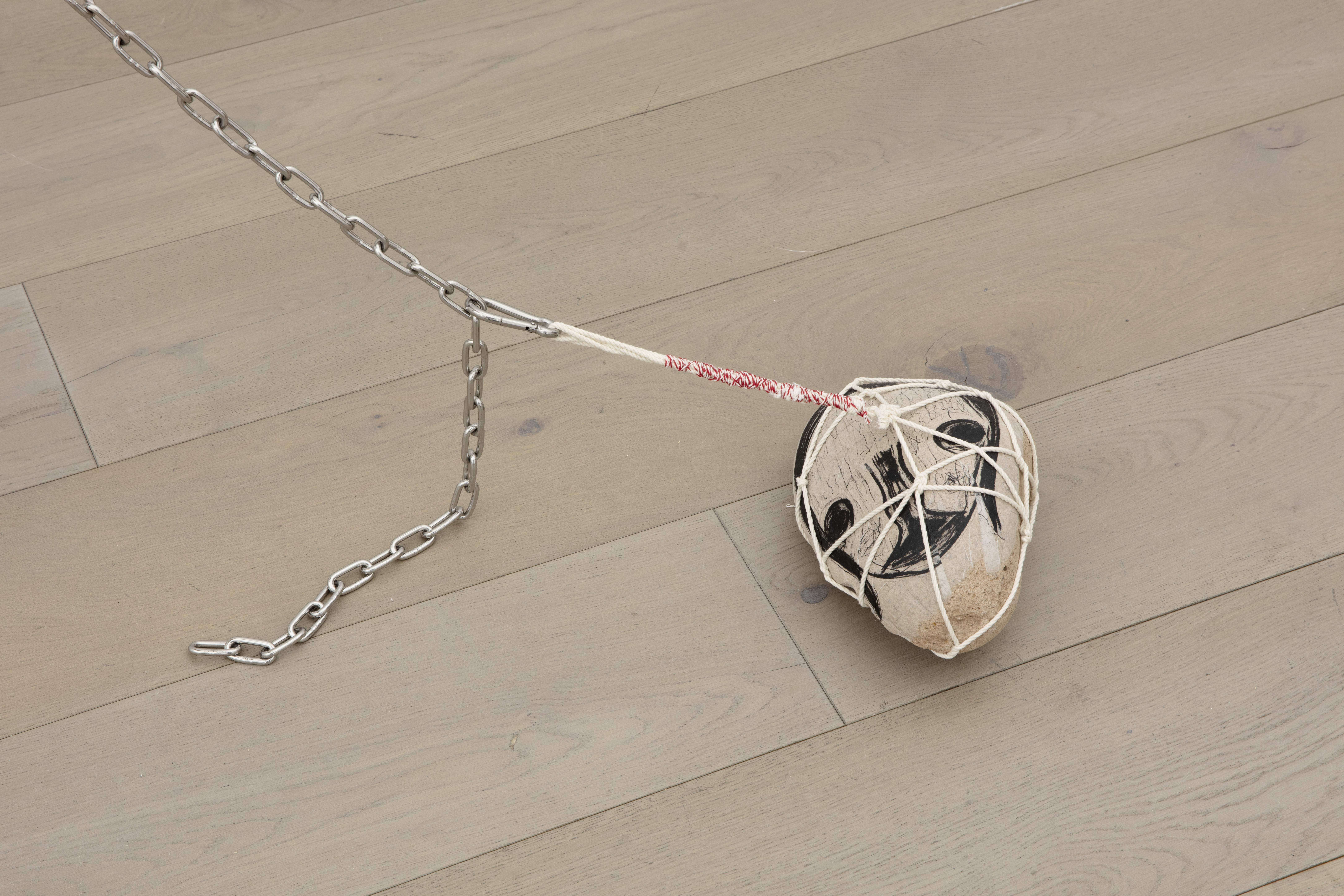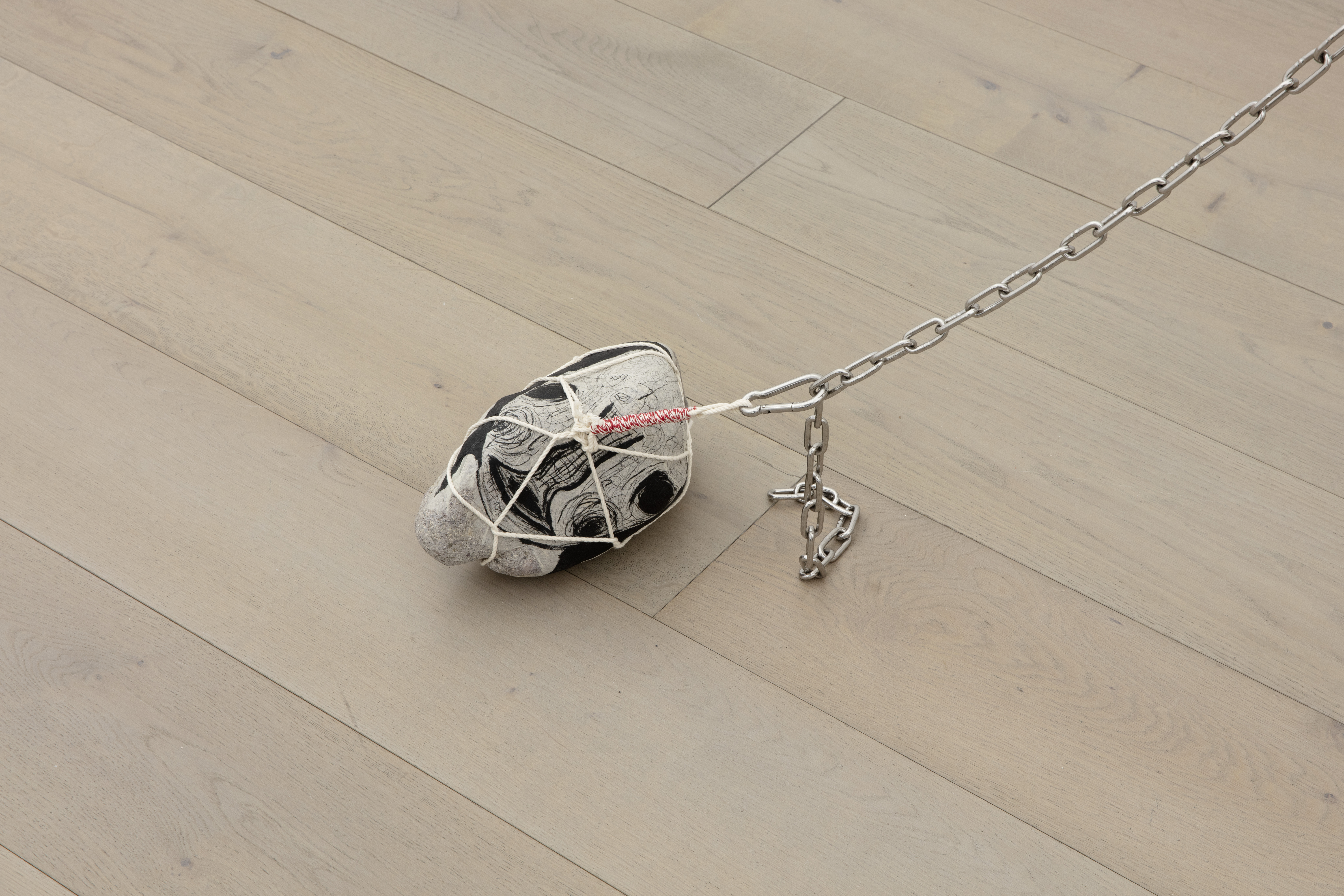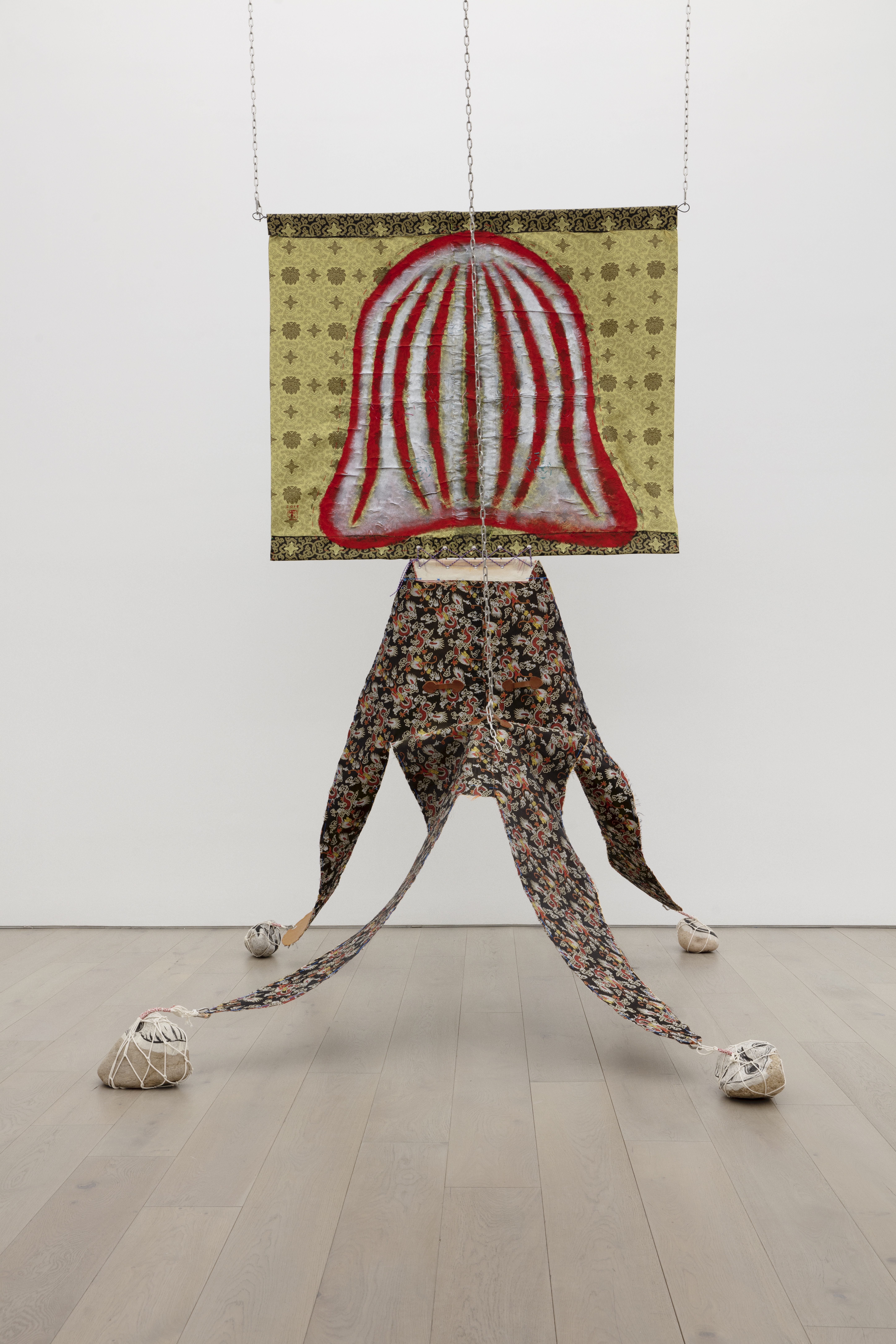 Pastel, acrylic, embroidery and leather on fabric; lithograph and strings on stone; stainless steel, aluminium, iron and chain
