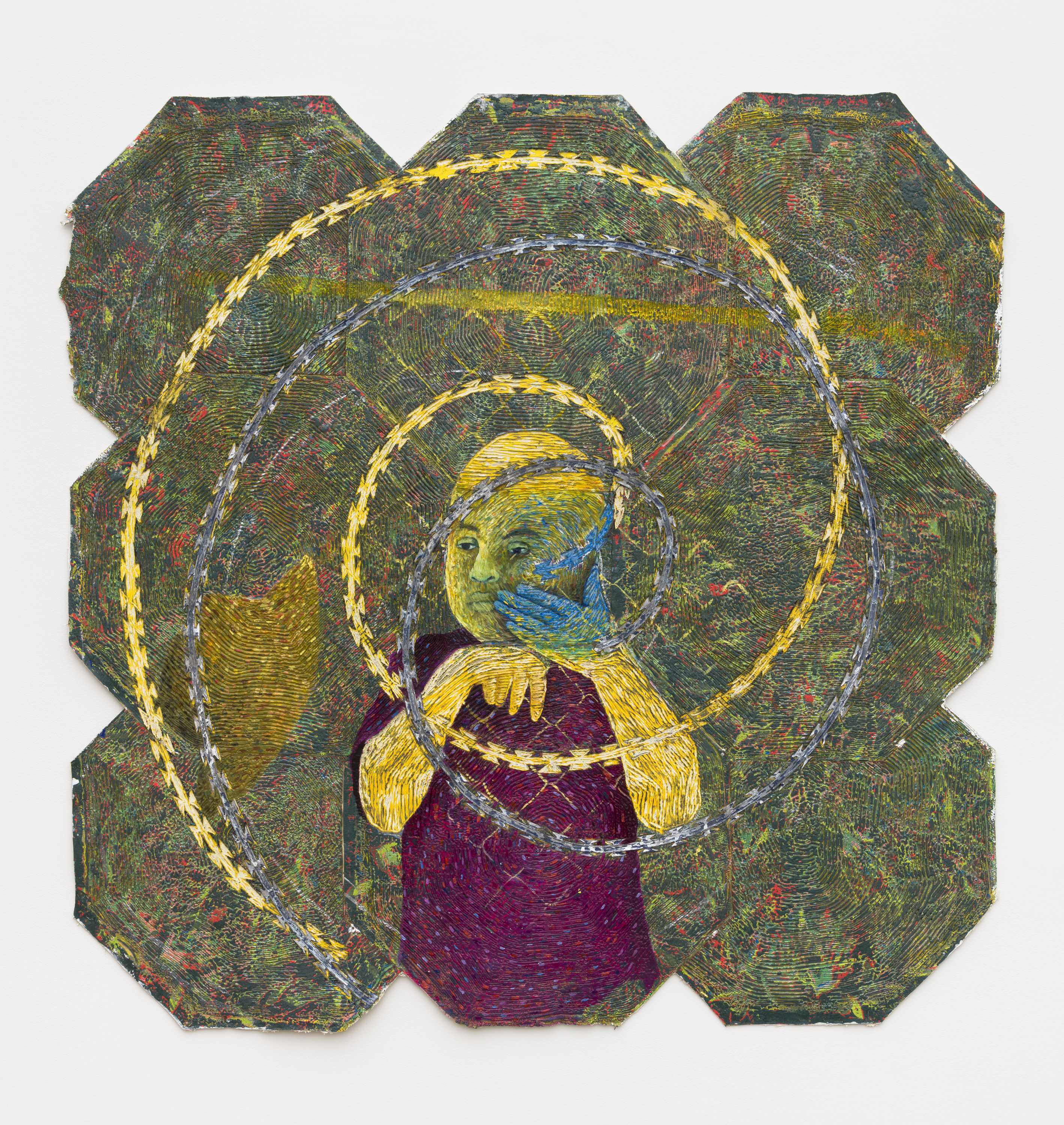 Oil based relief on canvas collage with barbed wire