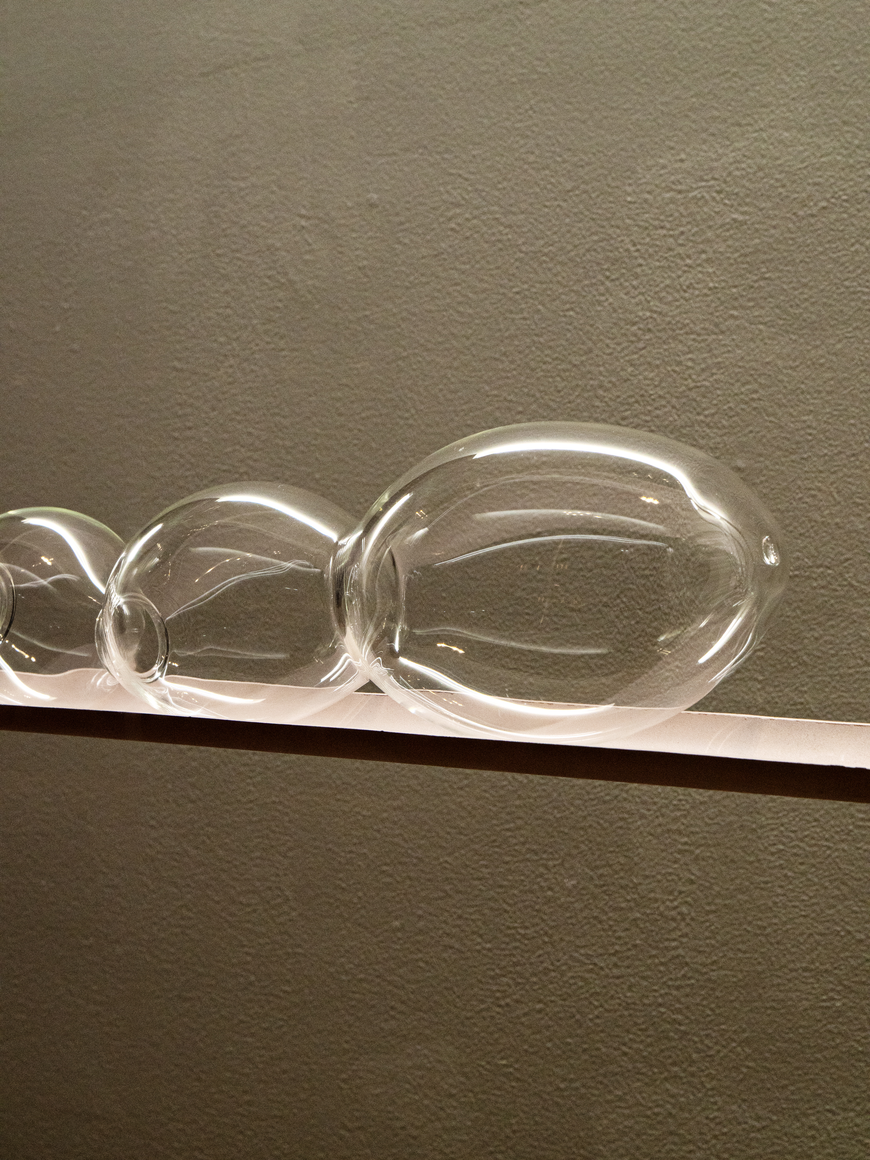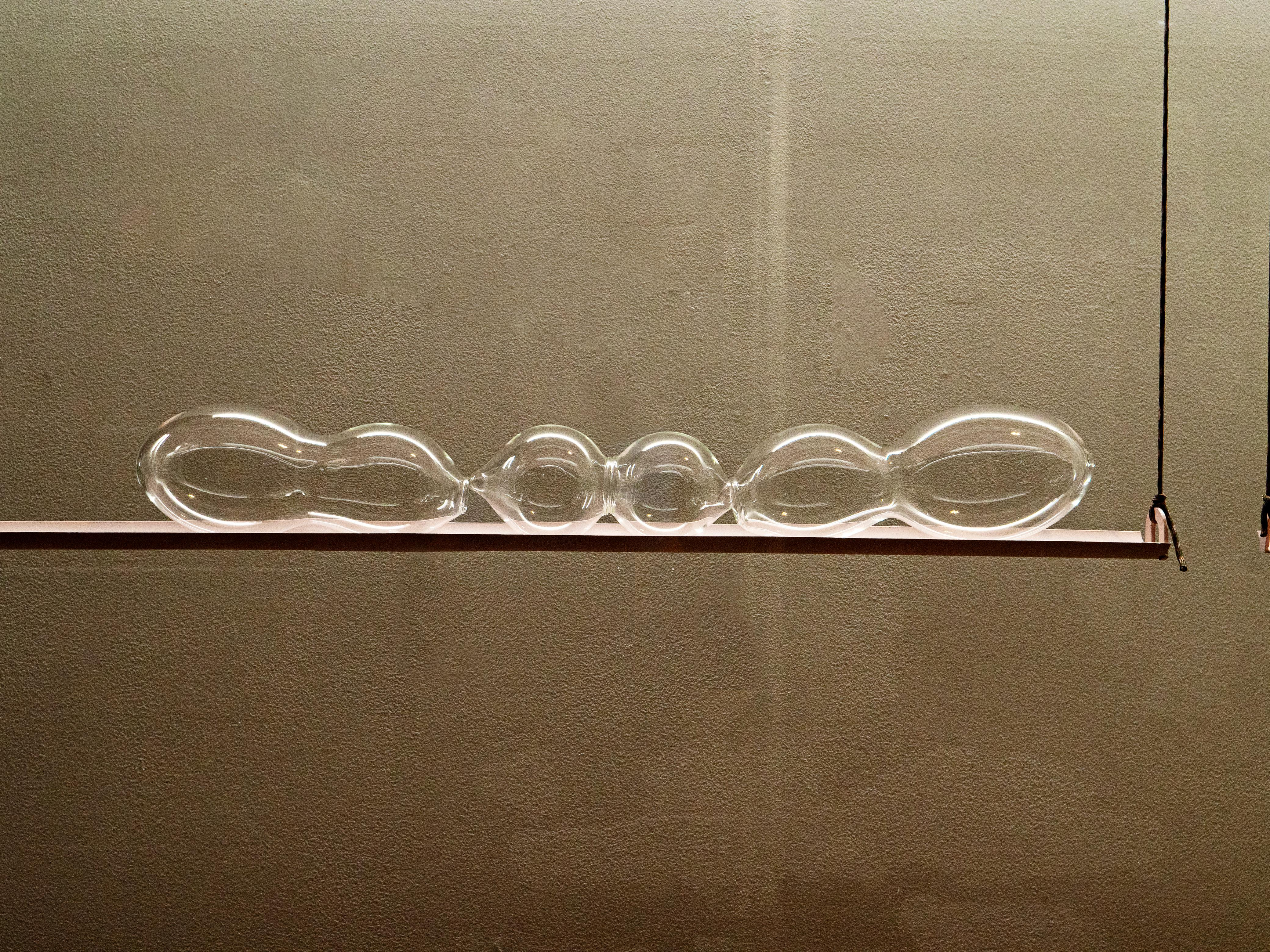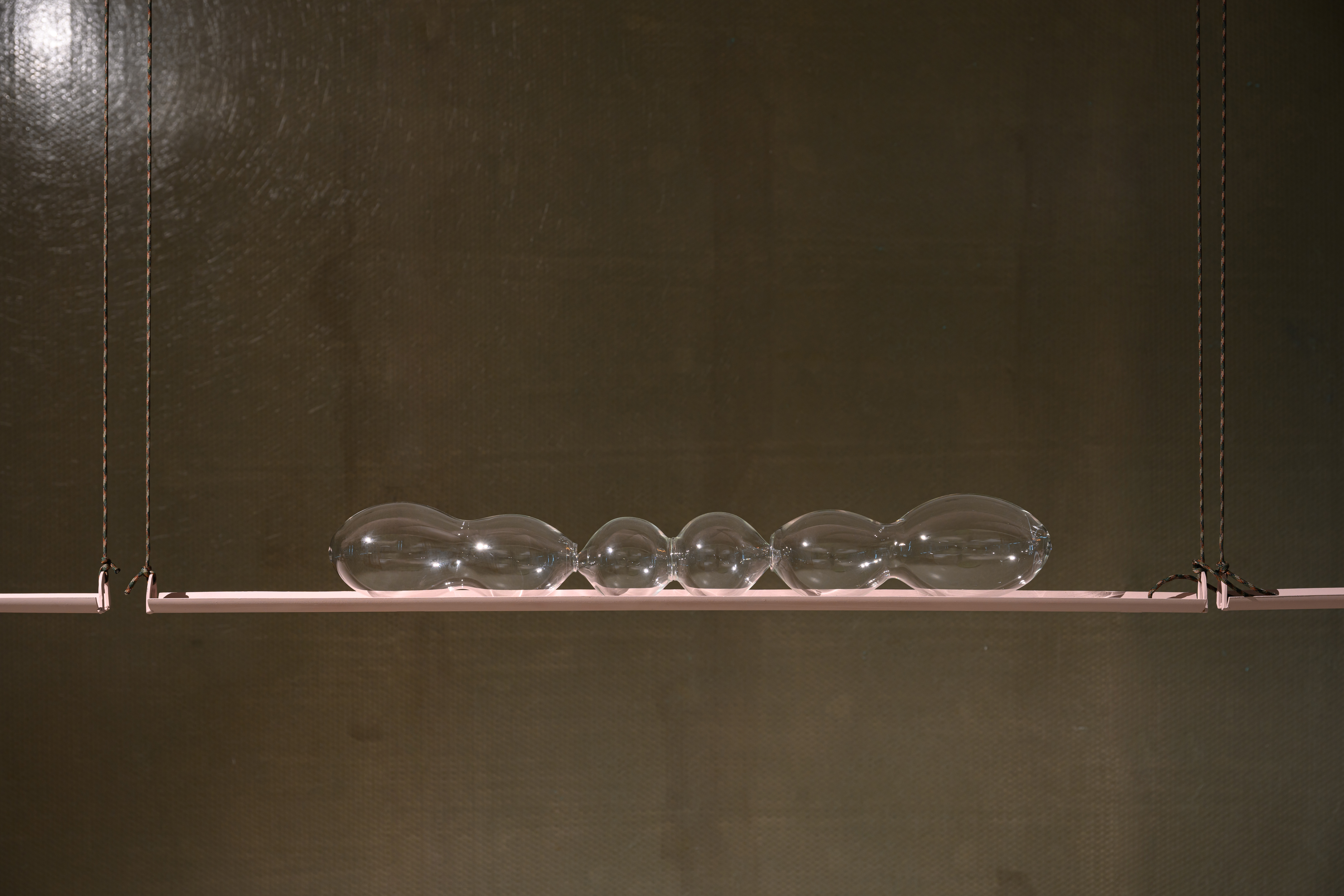 Powder-coated mild steel, fishing cable, hand-blown glass