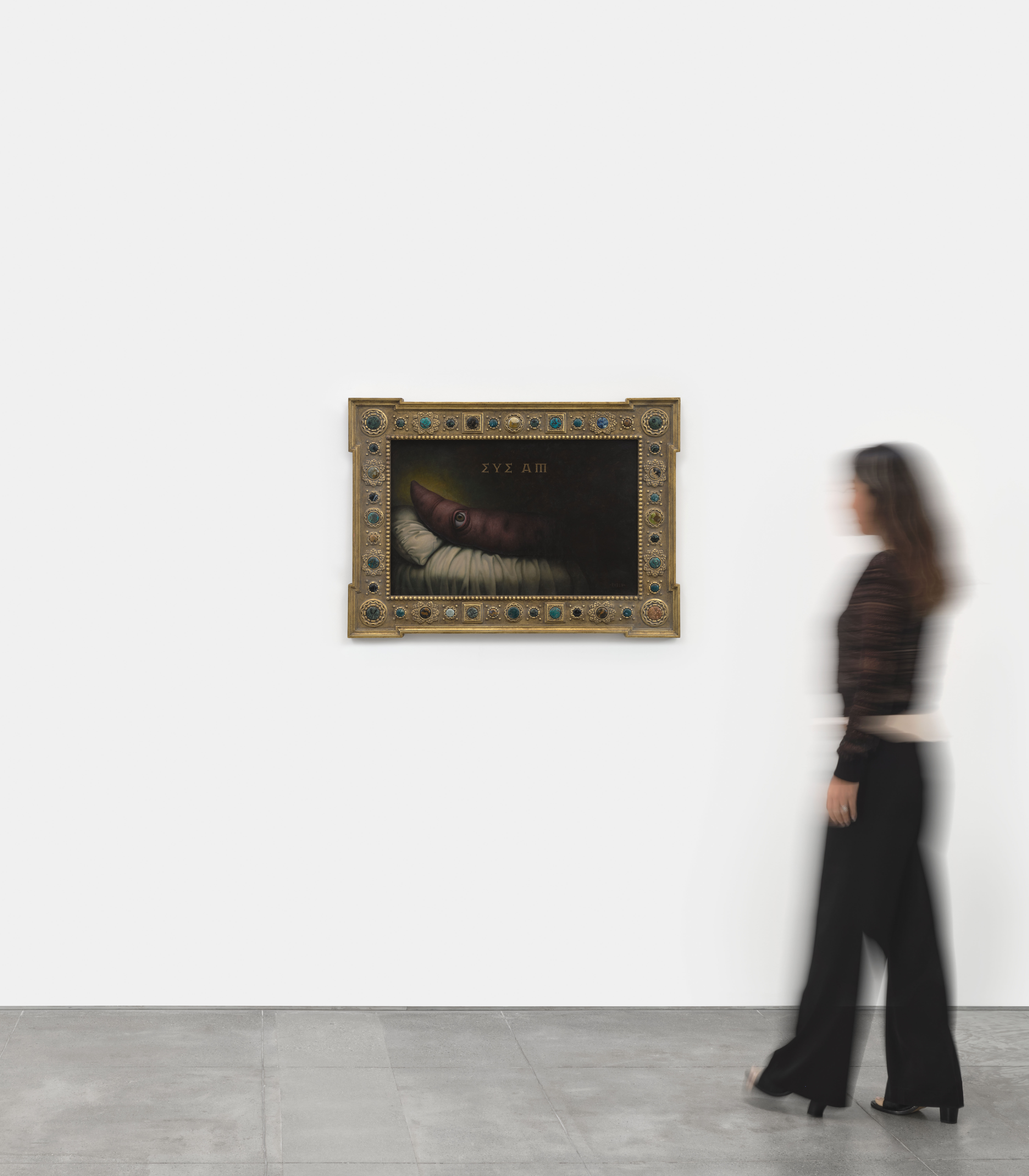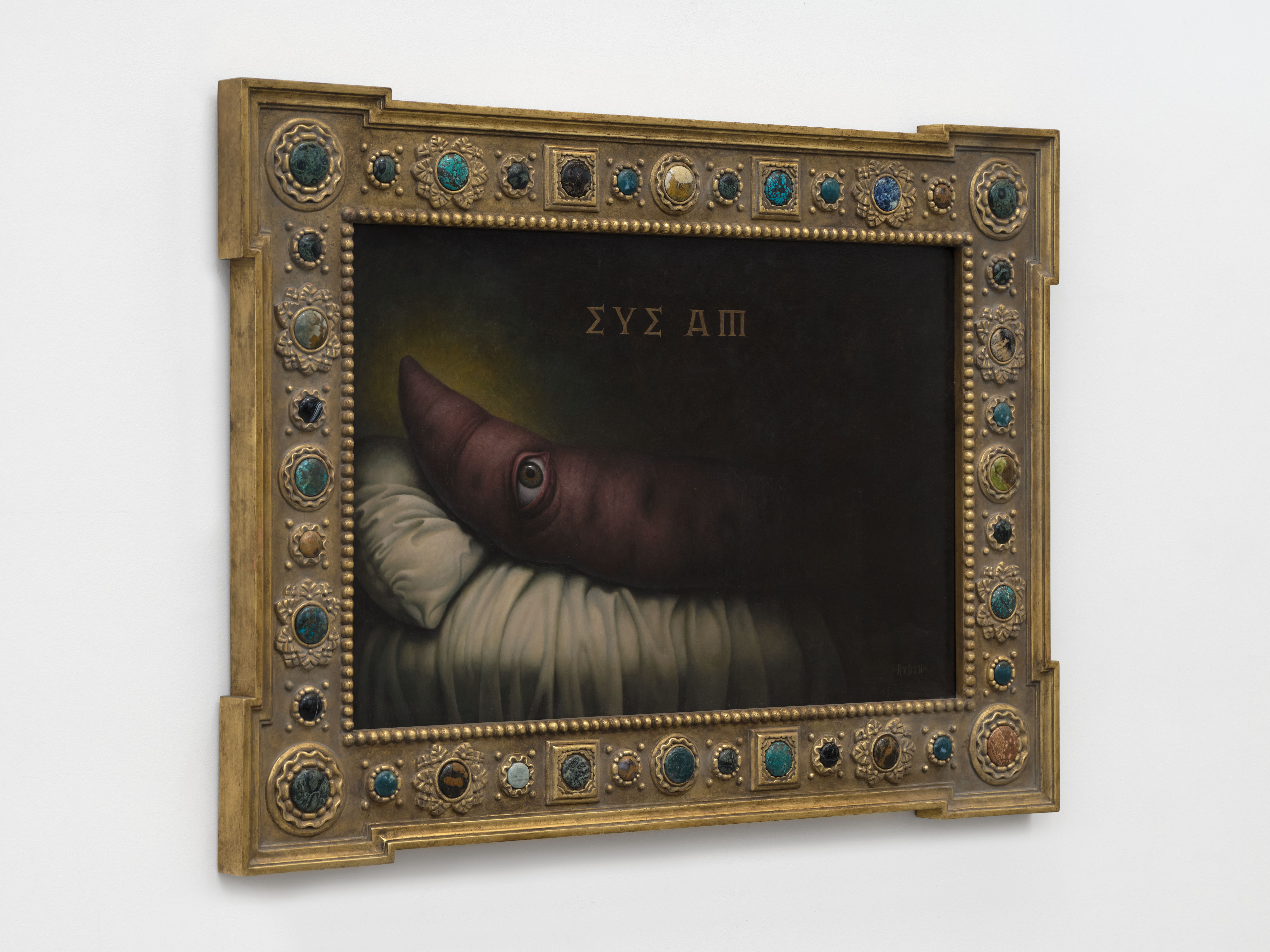 Oil on panel in hand-carved, gilded wooden frame with natural stones
