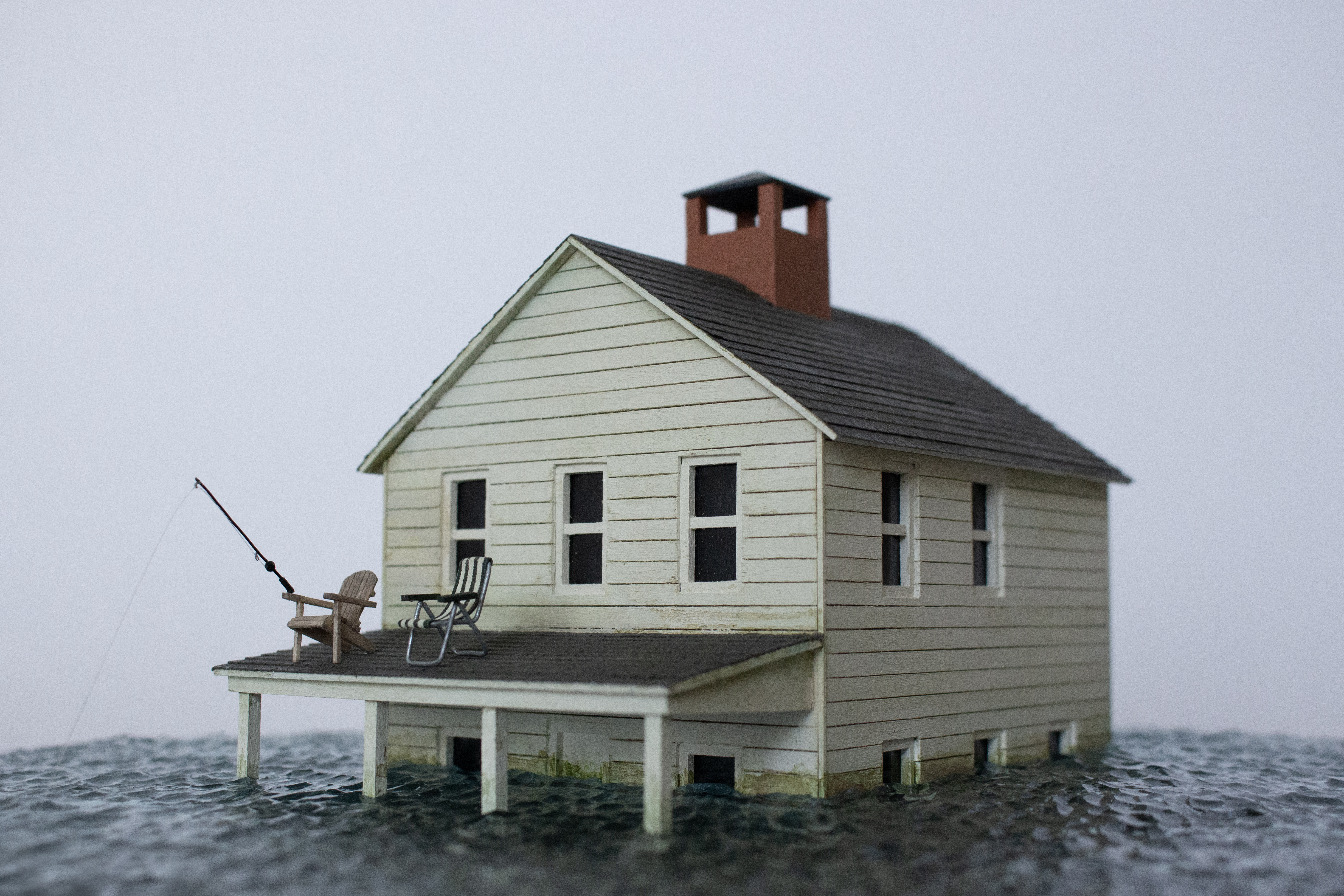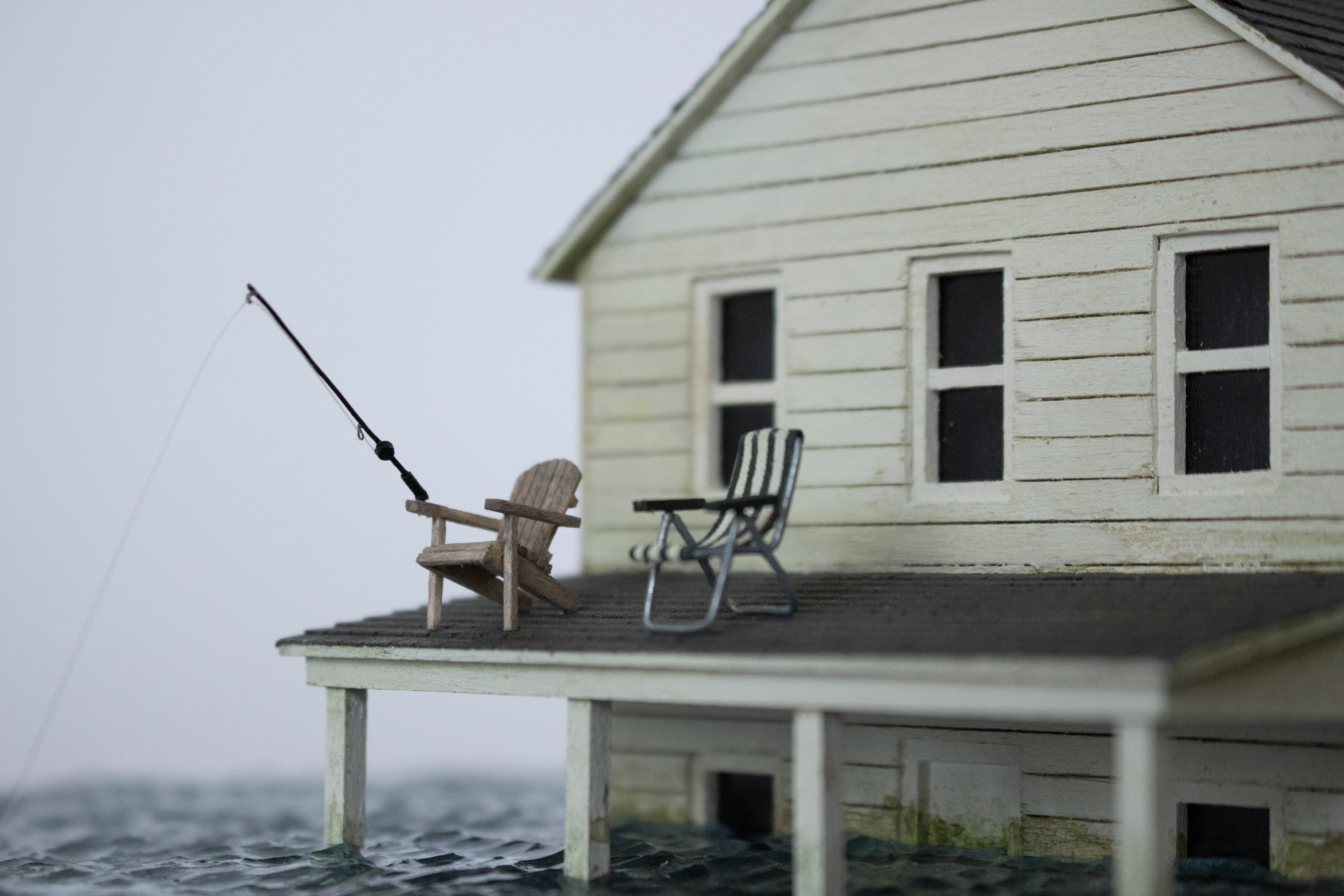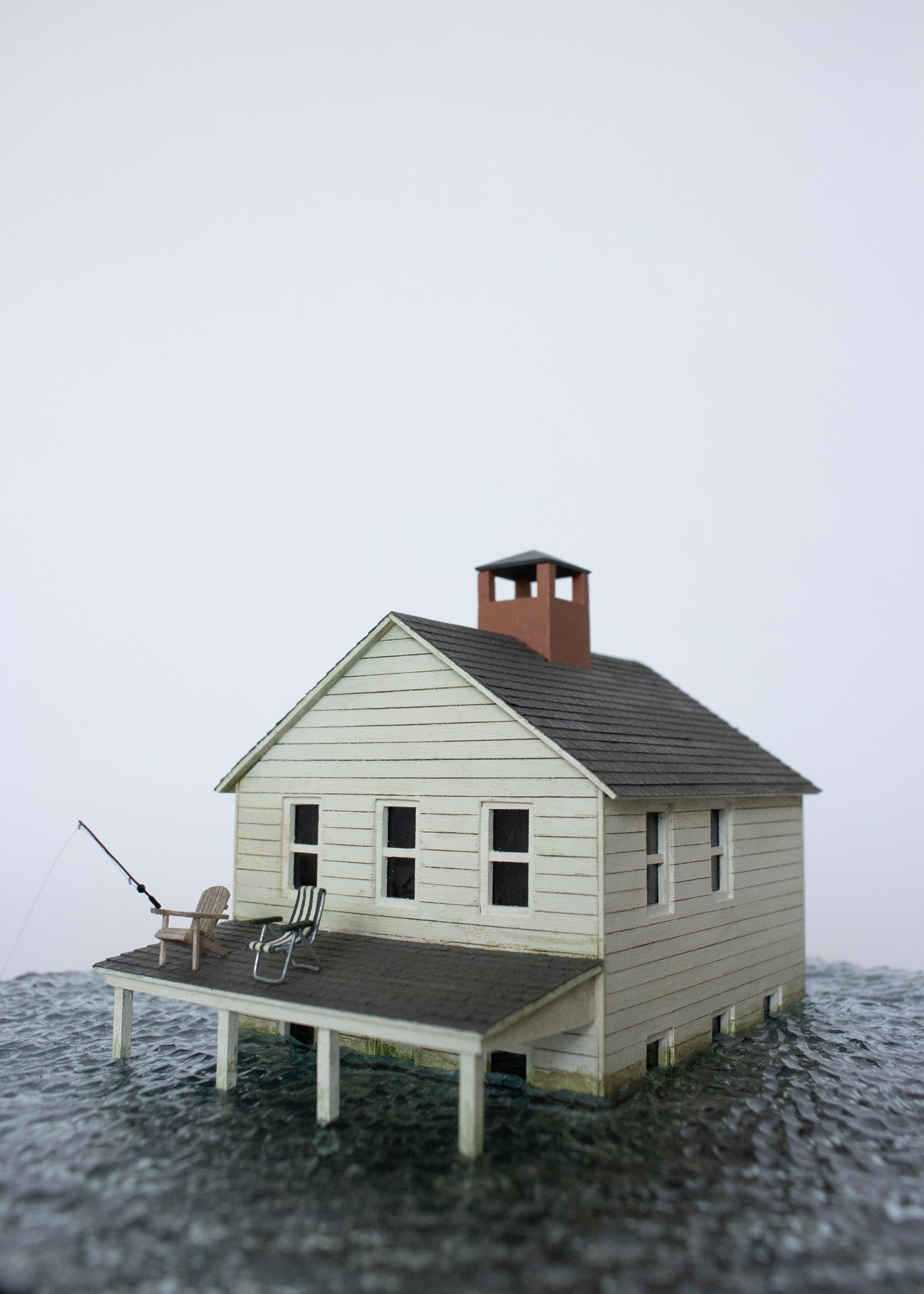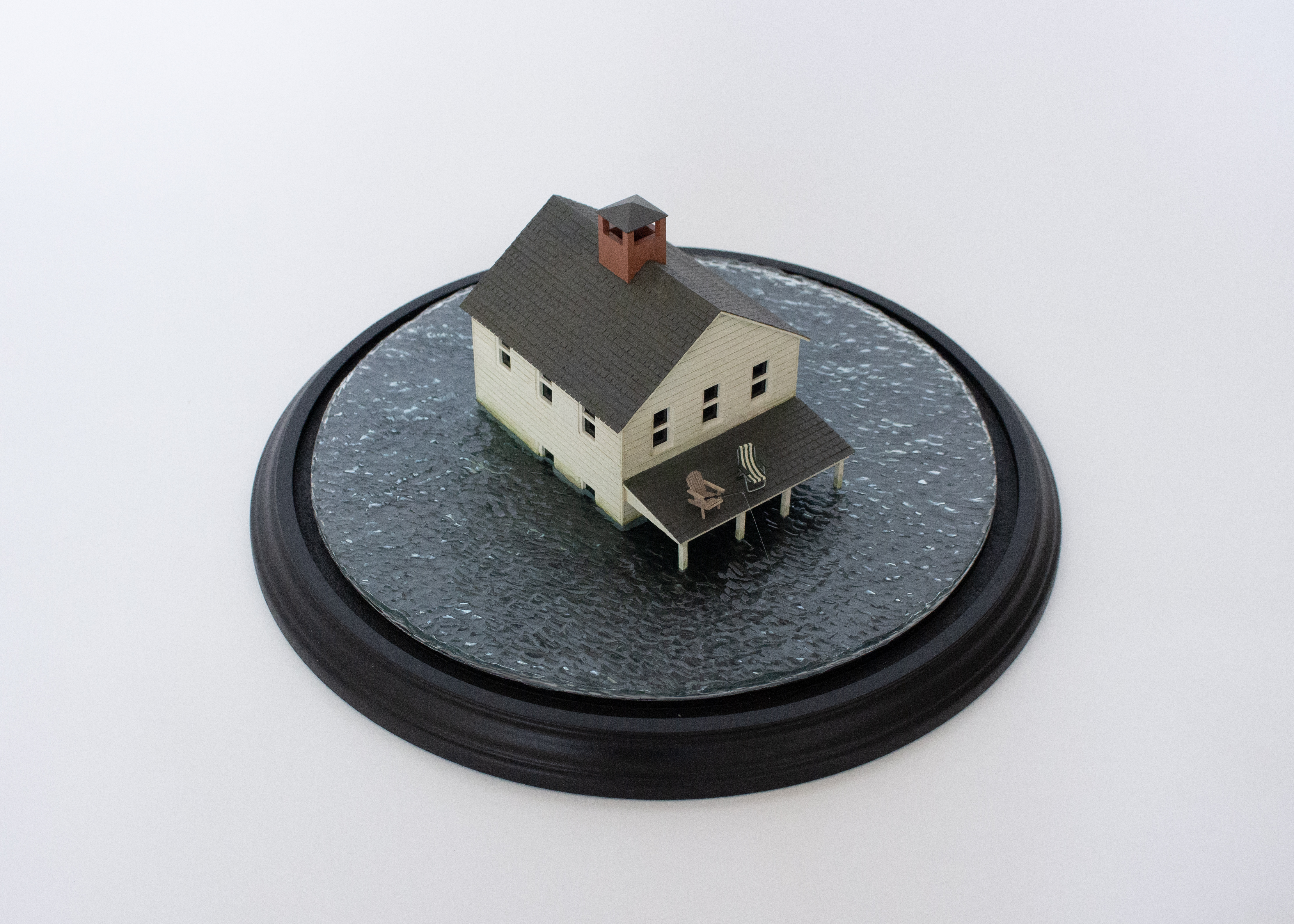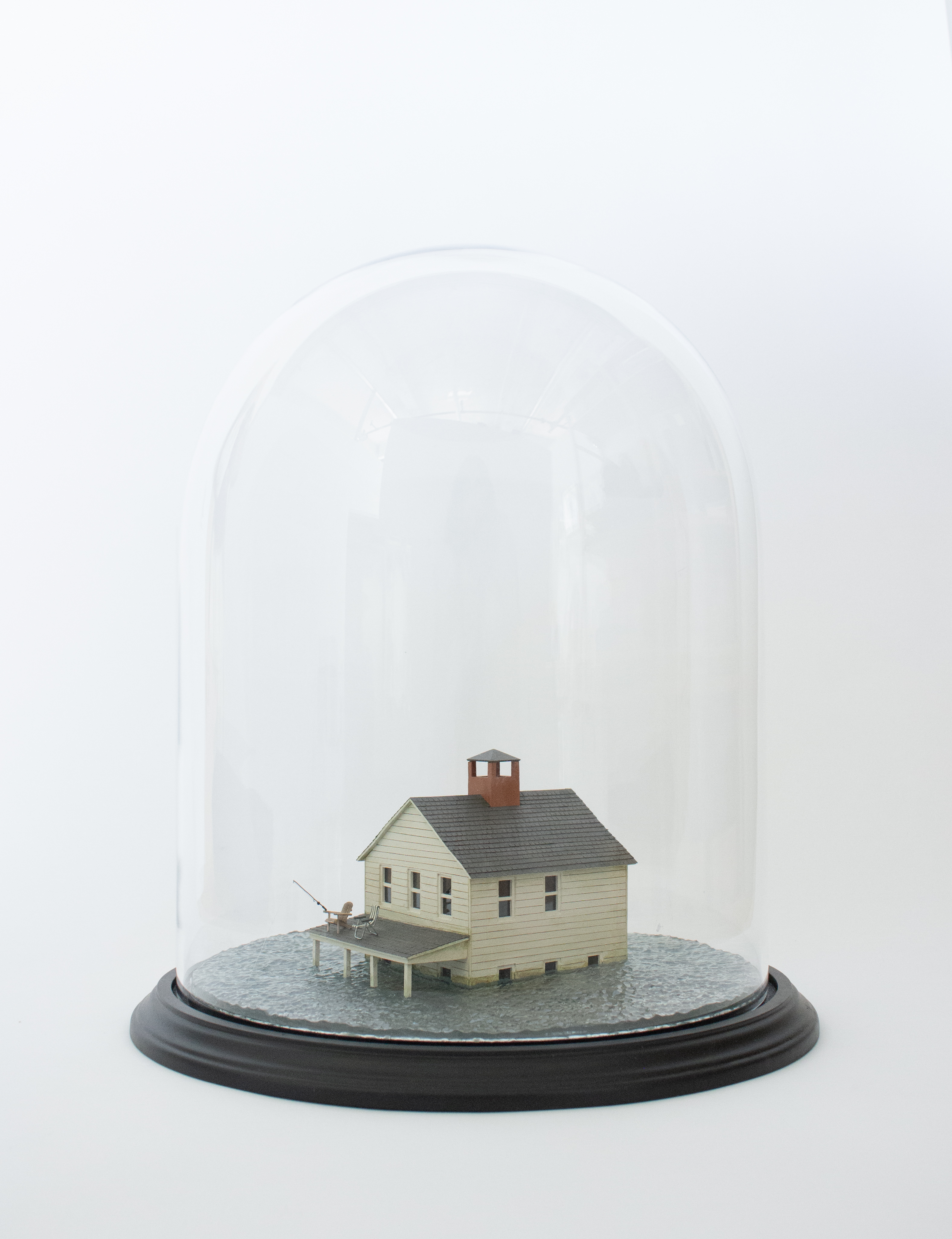 Glass cloche, resin, wood, plexiglass, sandpaper, wire, cotton fabric, monofilament, acrylic paint
