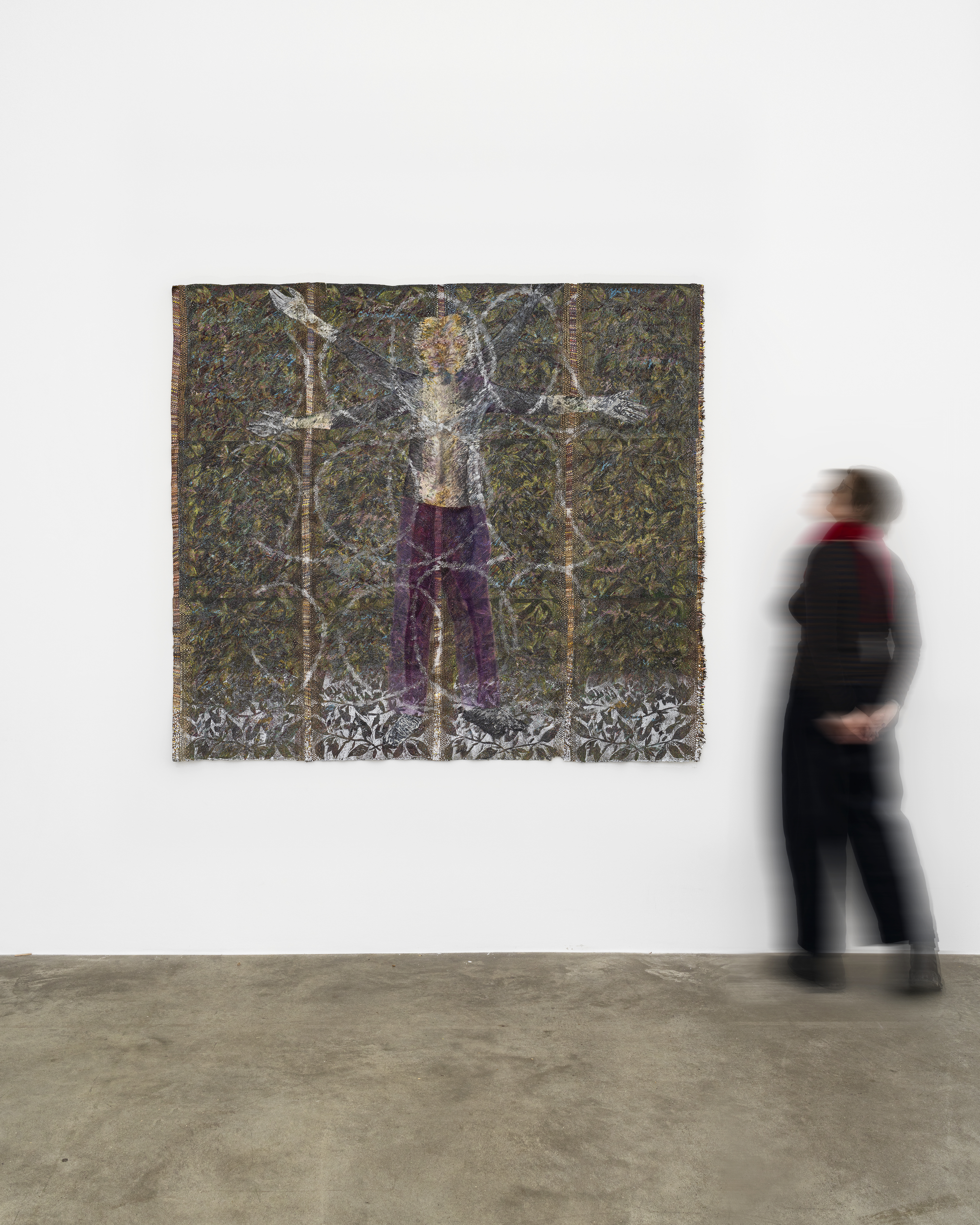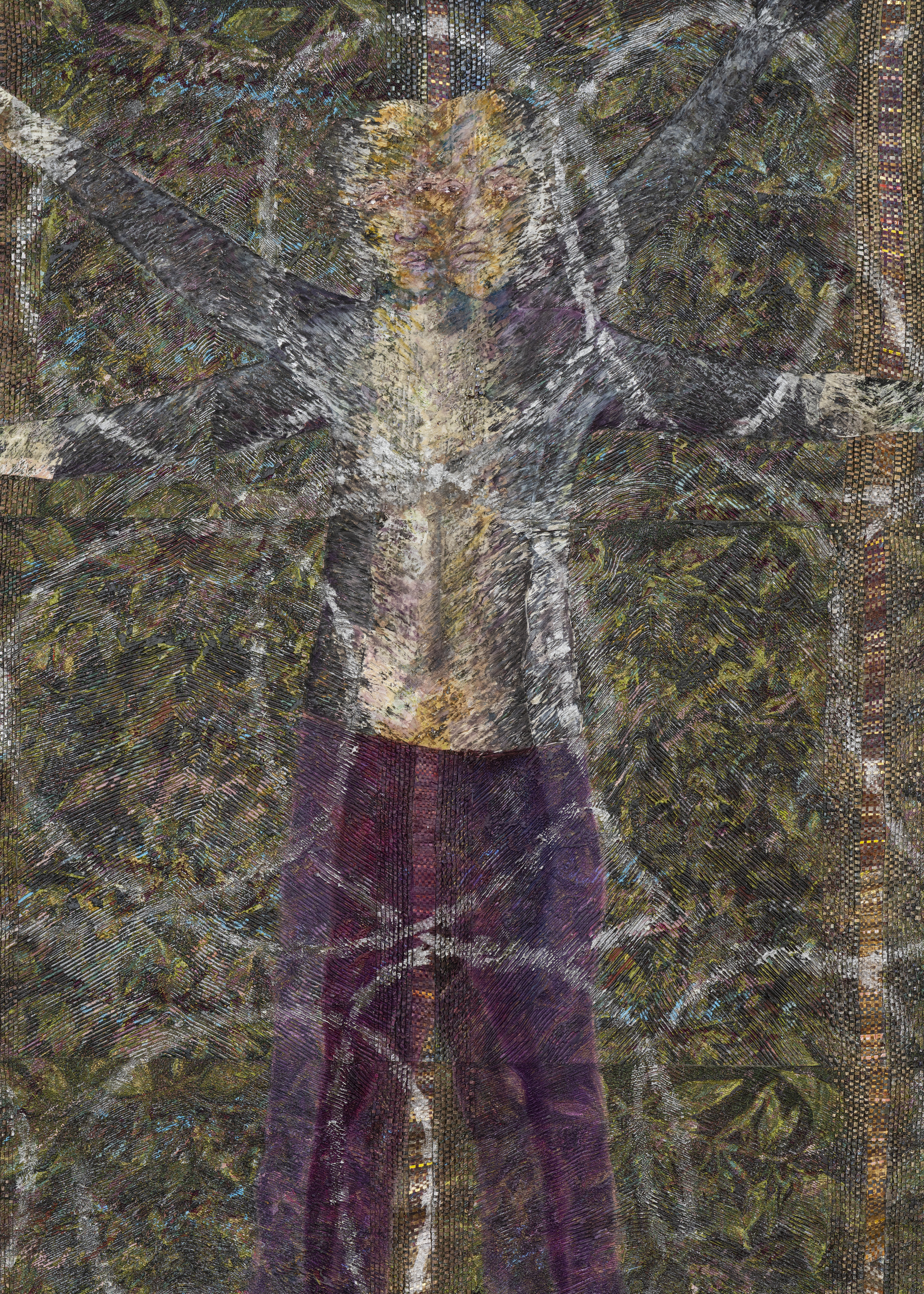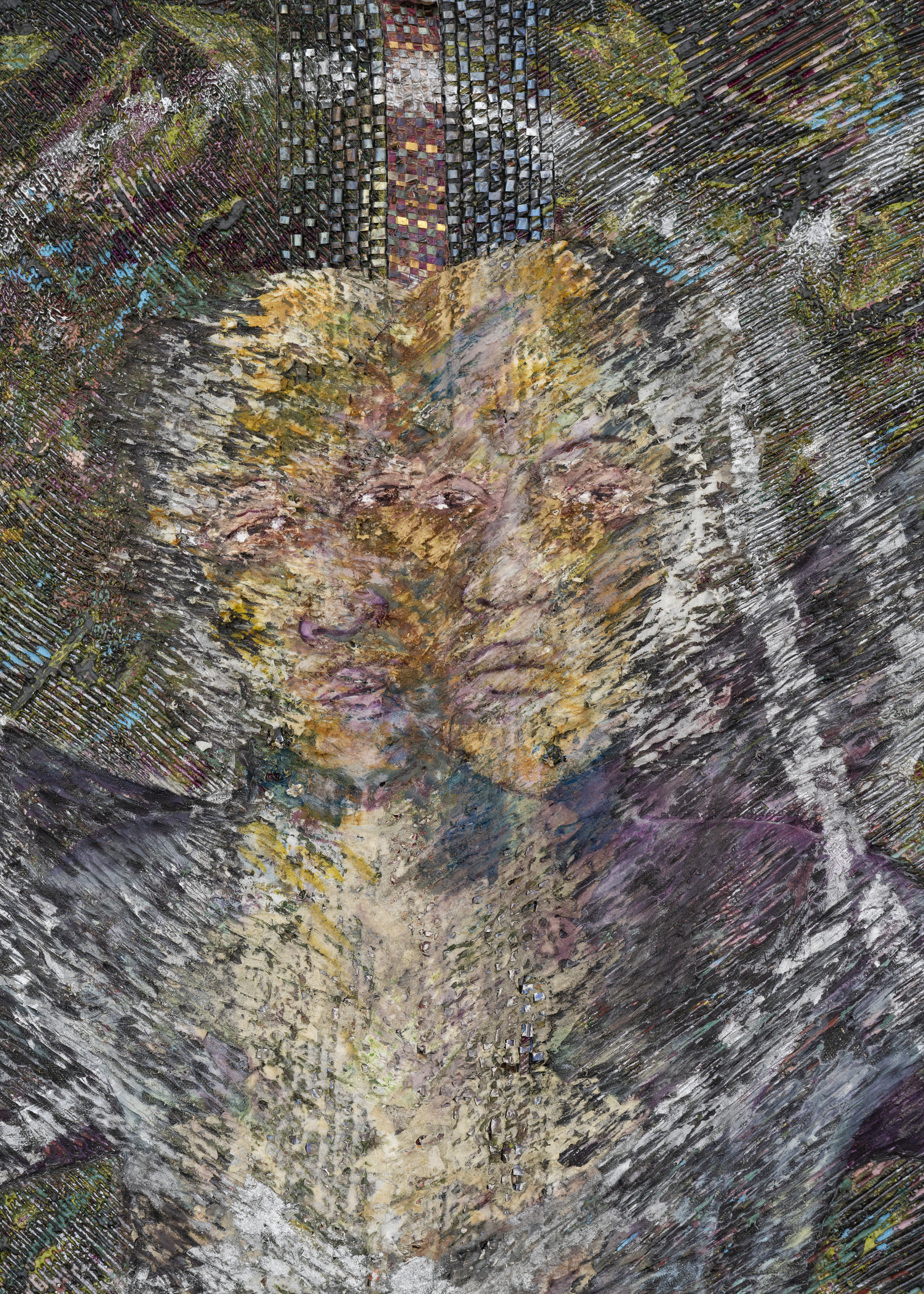 Acrylic and oil relief on canvas backed with muslin collage and woven with steel and skin lightening cream packaging