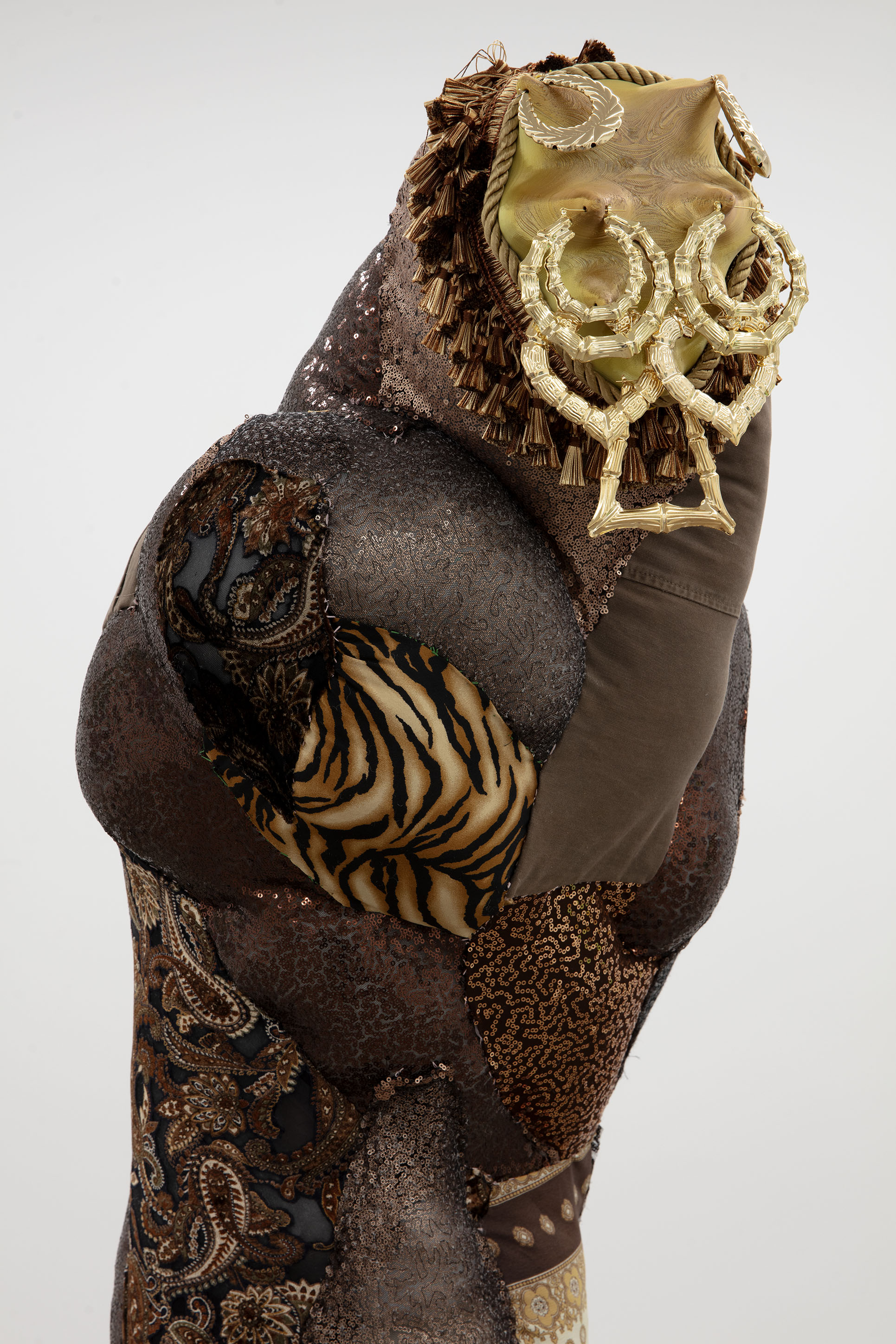 Fabric, 3D printed PLA mask, sequins, earrings, wood