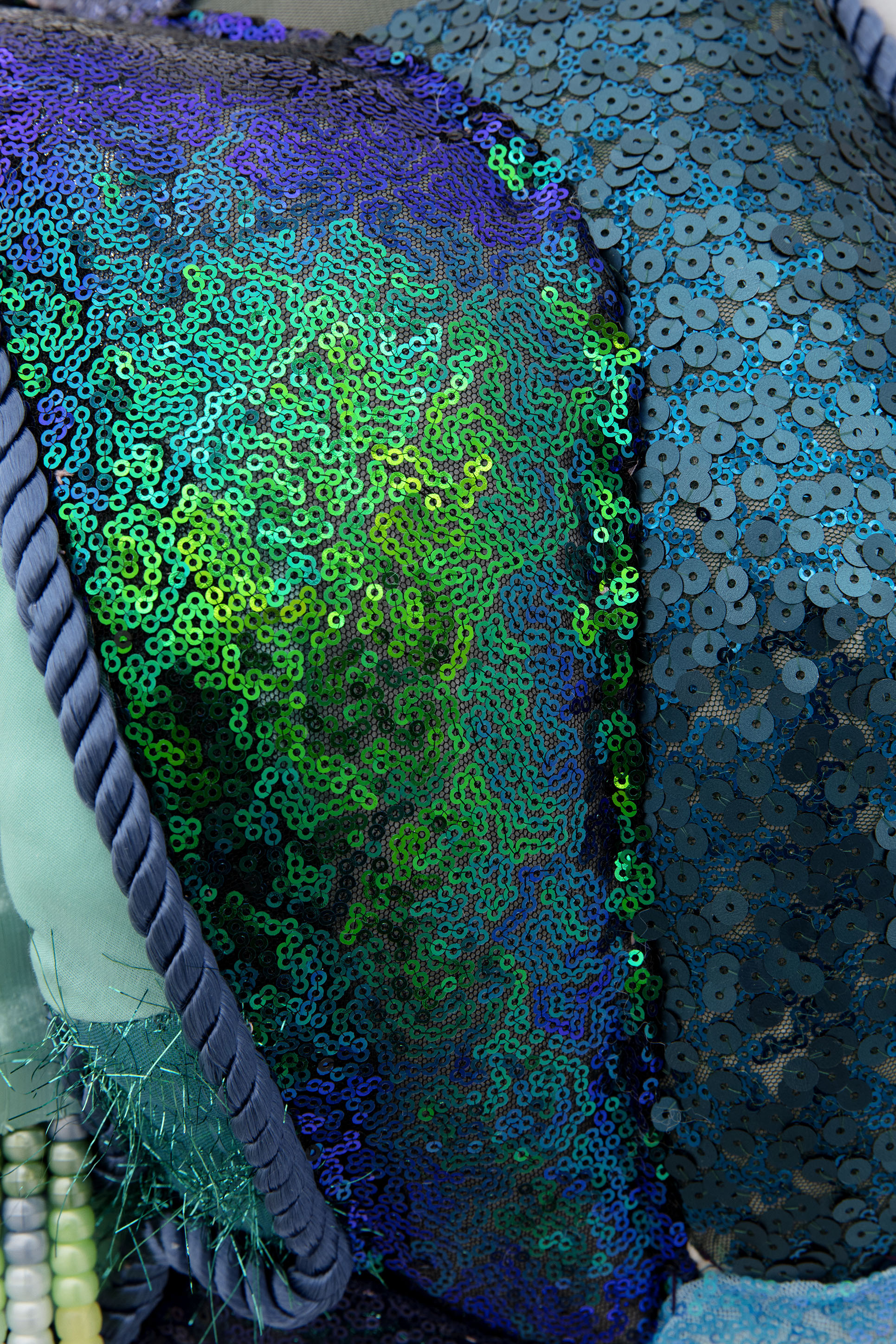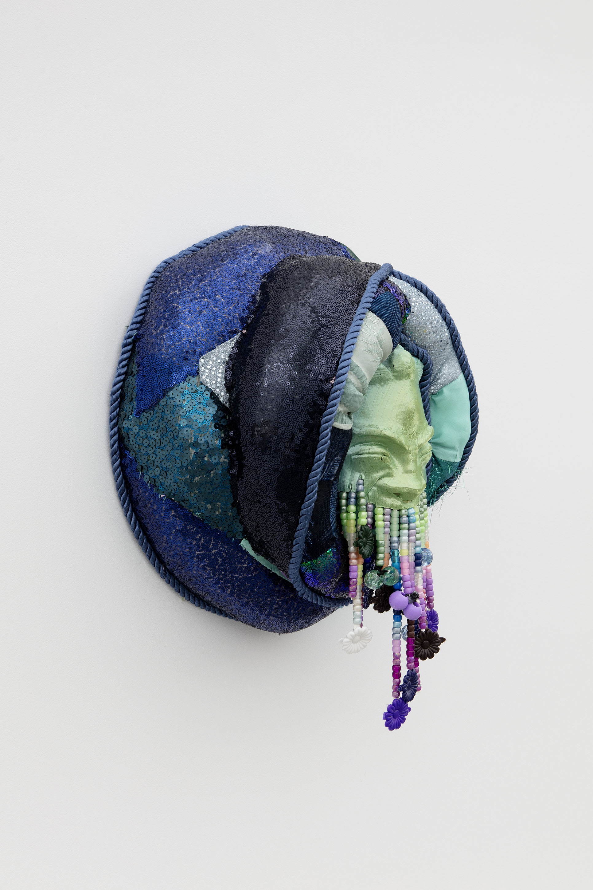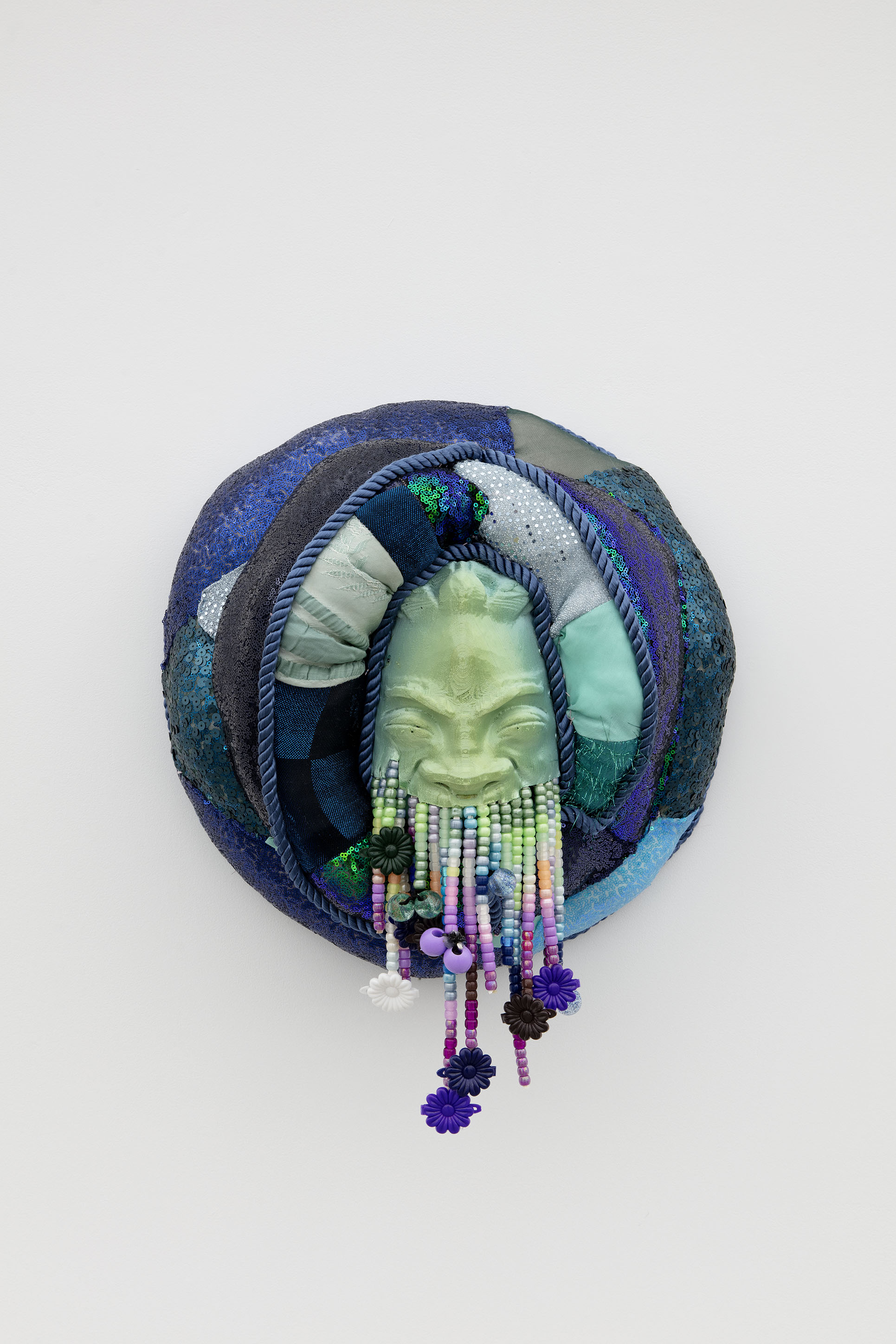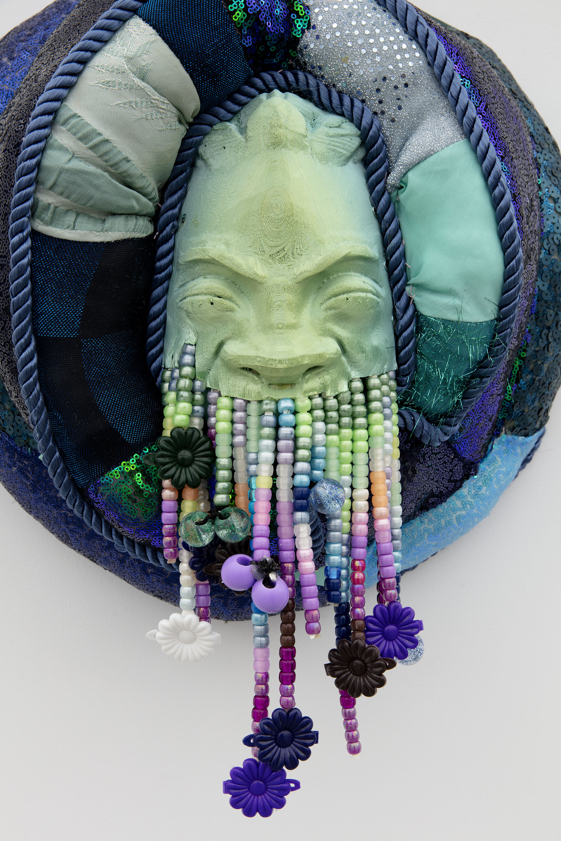 Fabric, 3D printed PLA mask, plastic beads, barrettes