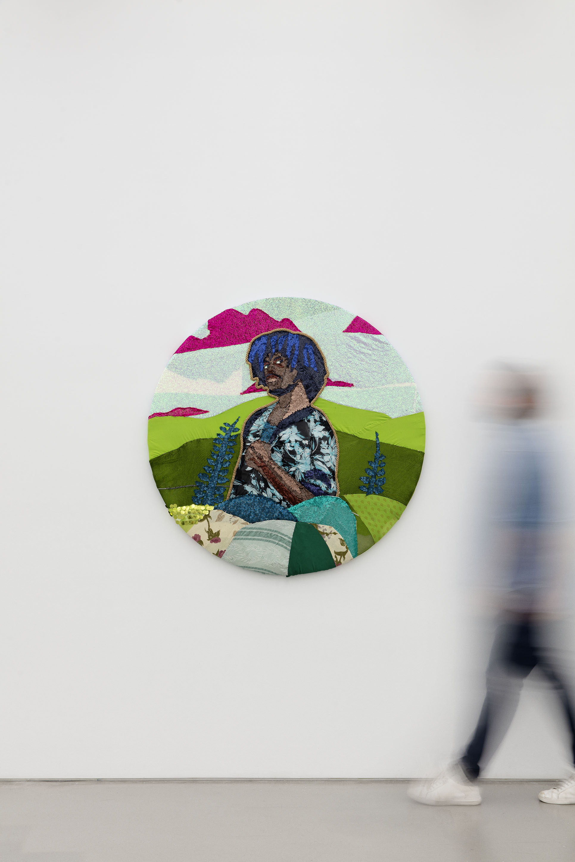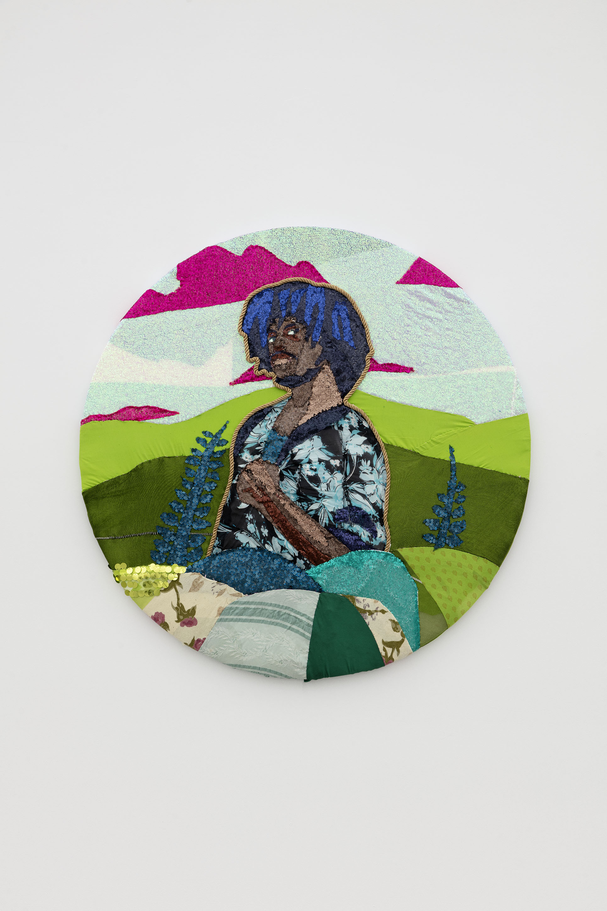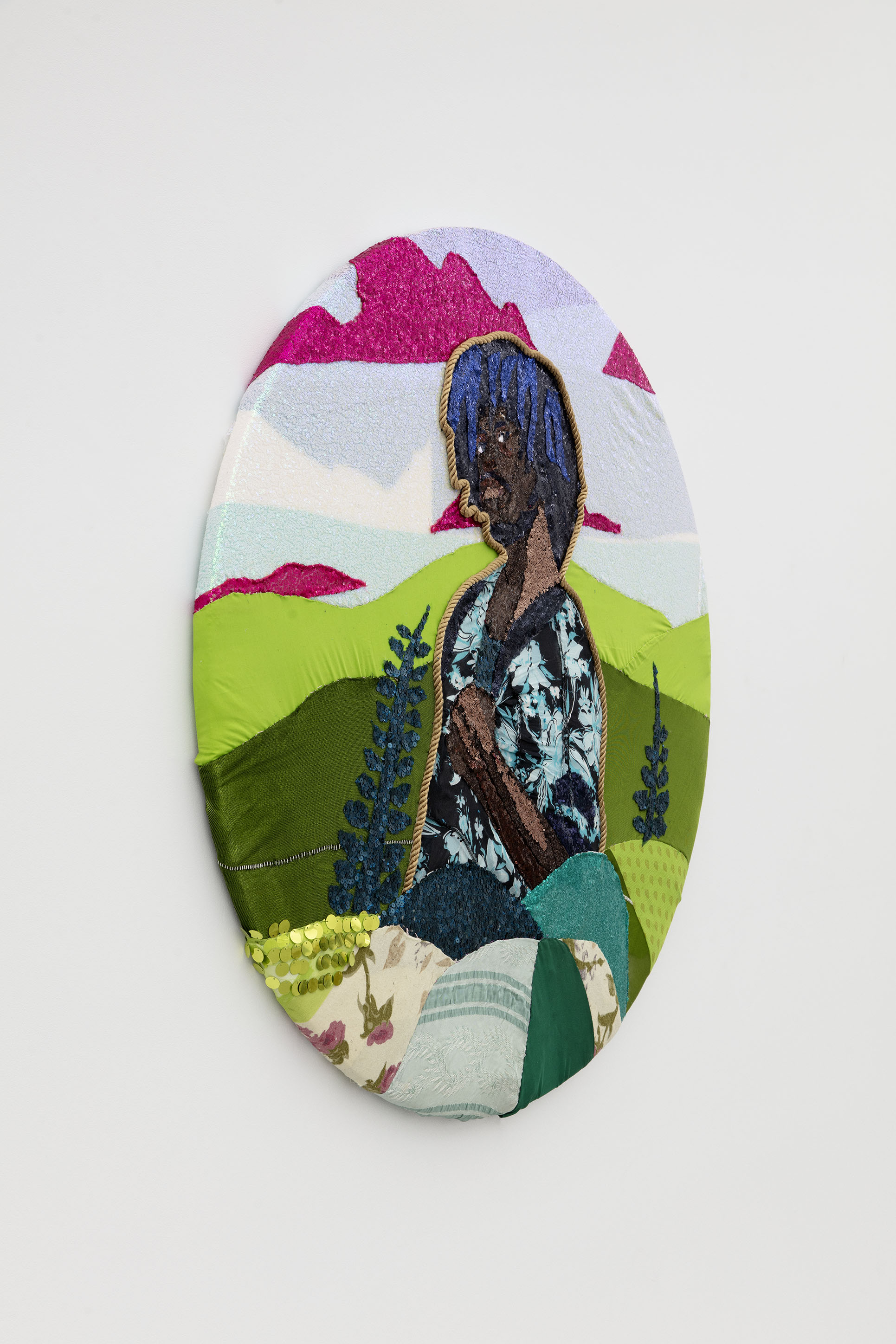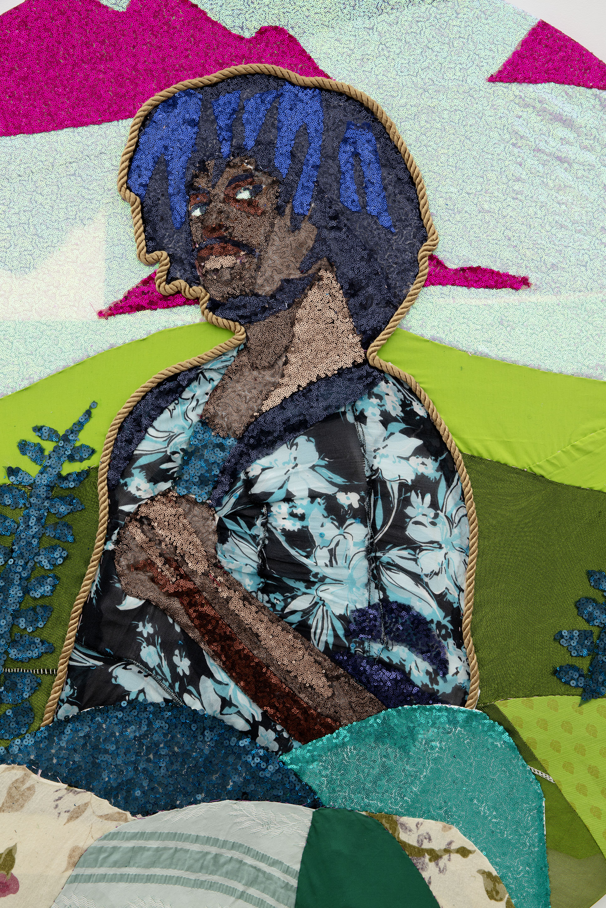 Fabric and sequins stretched on panel