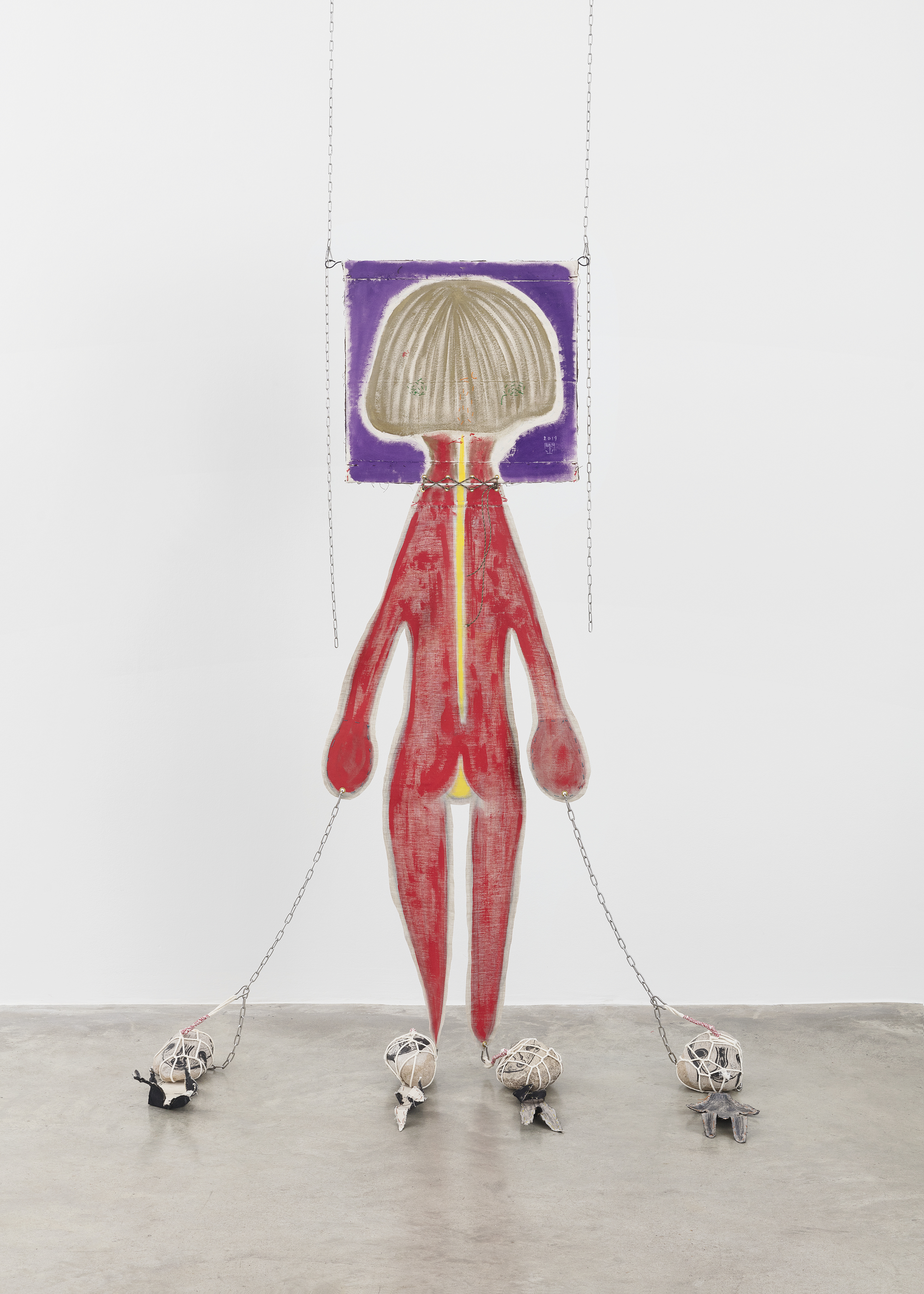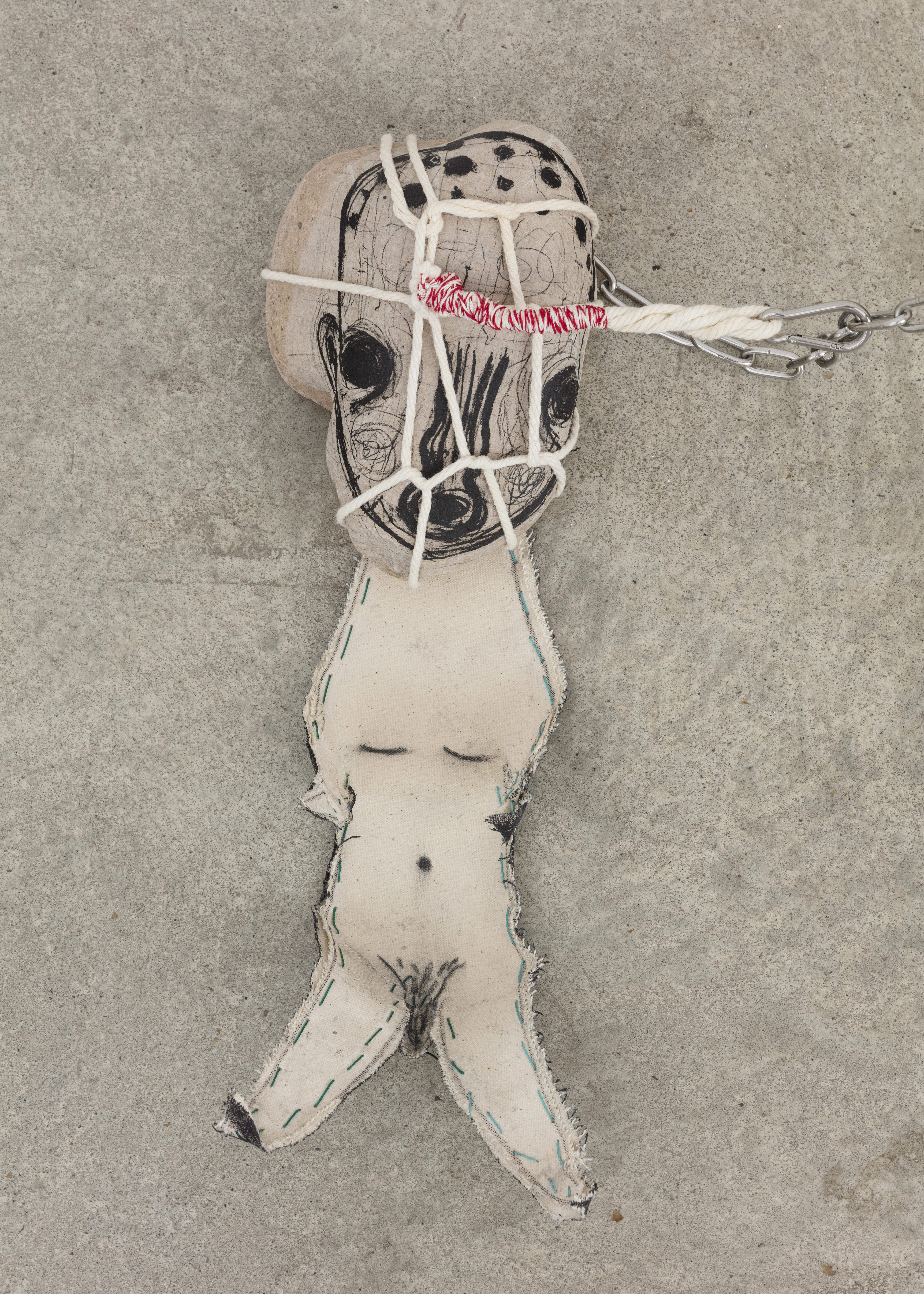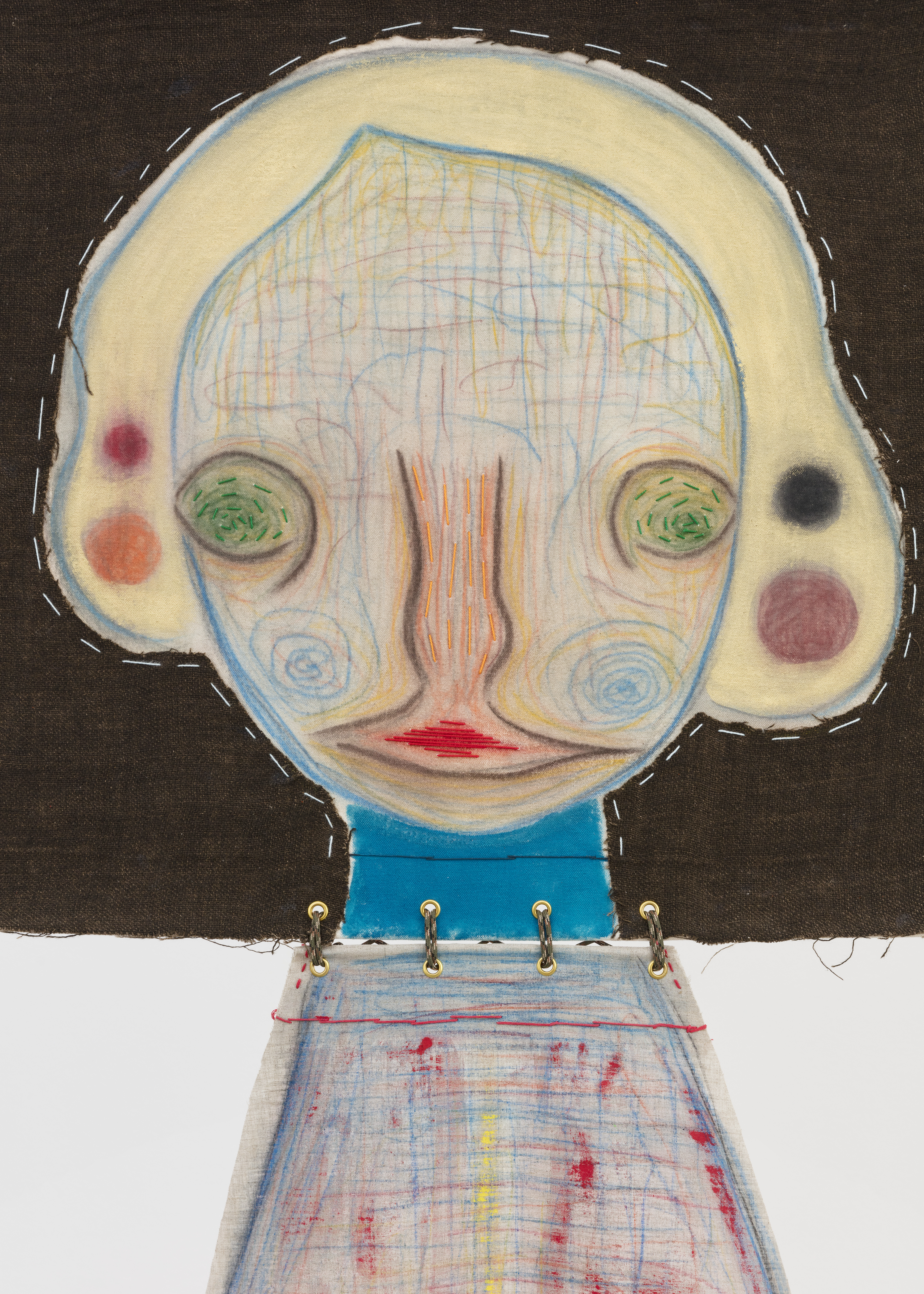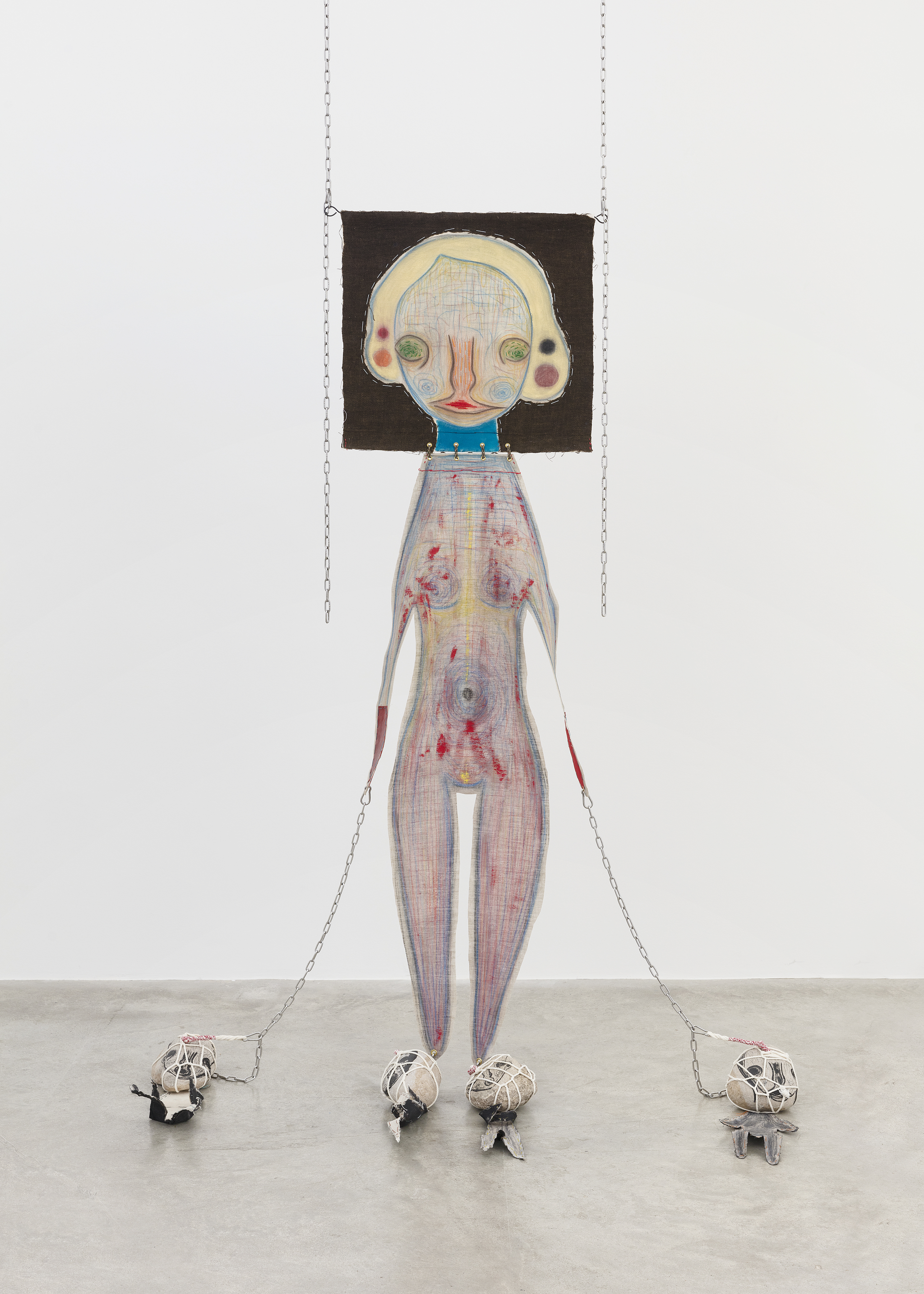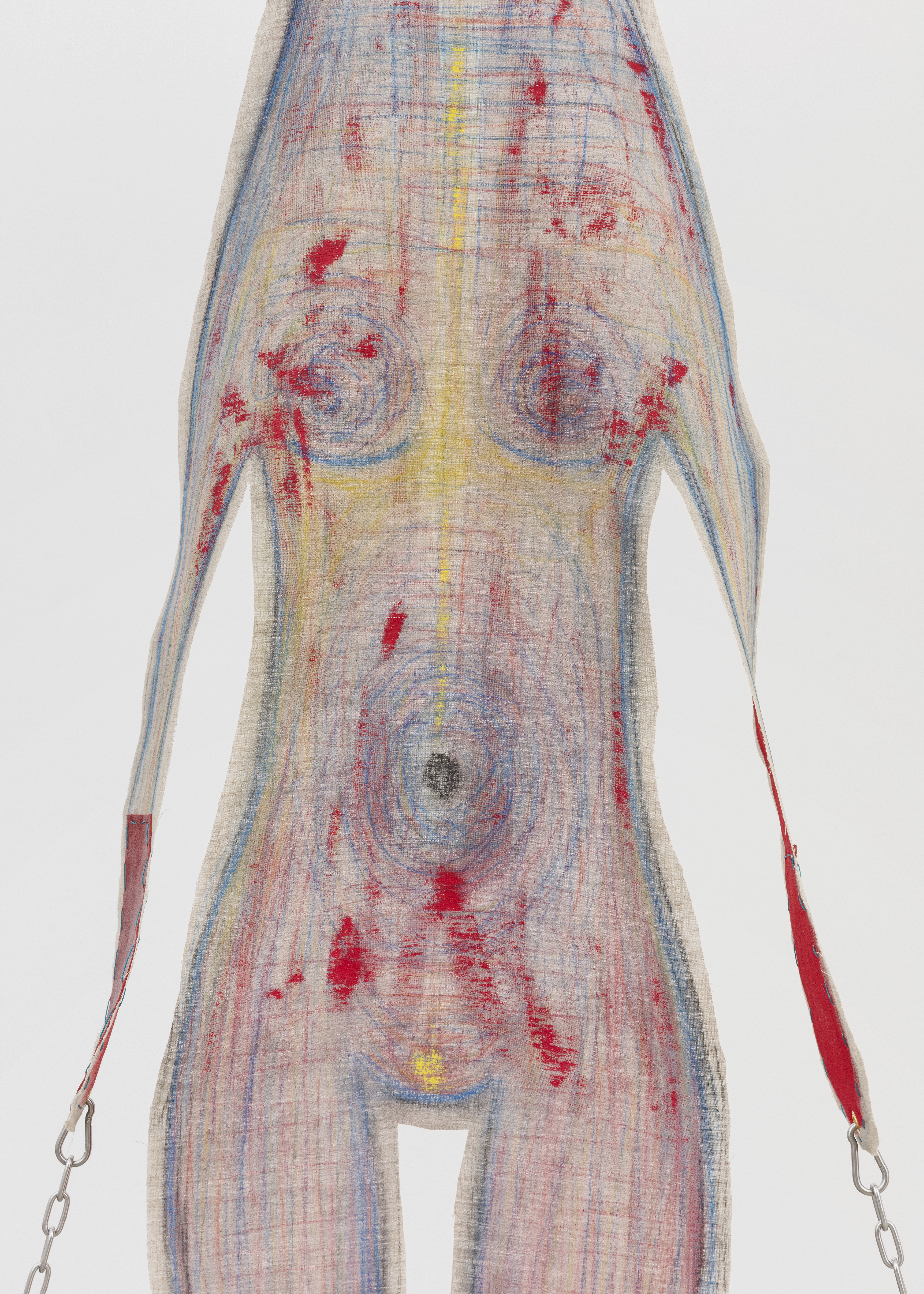Fabric, pastel, acrylic, embroidery, leather, string, aluminium, chain, stone, lithograph