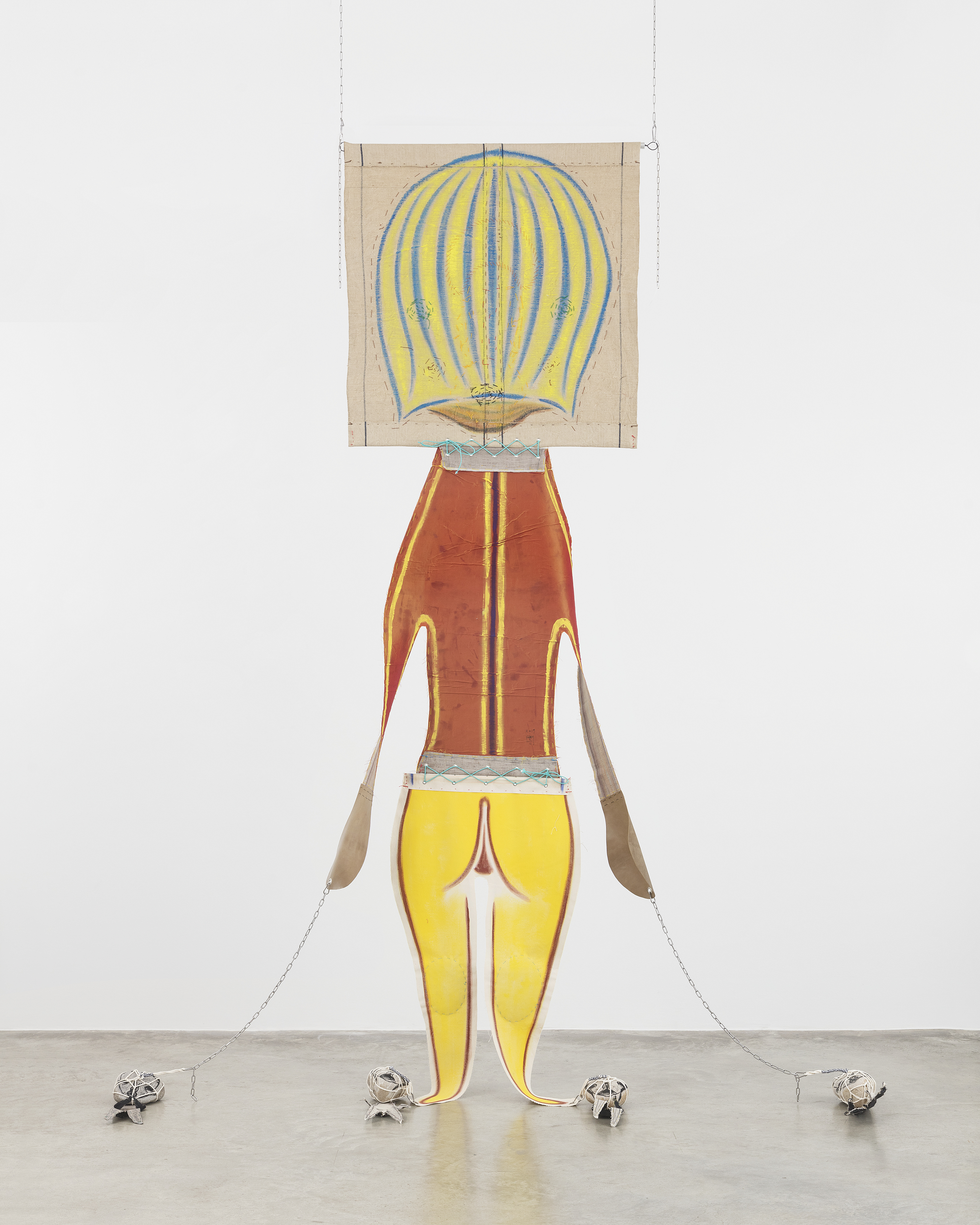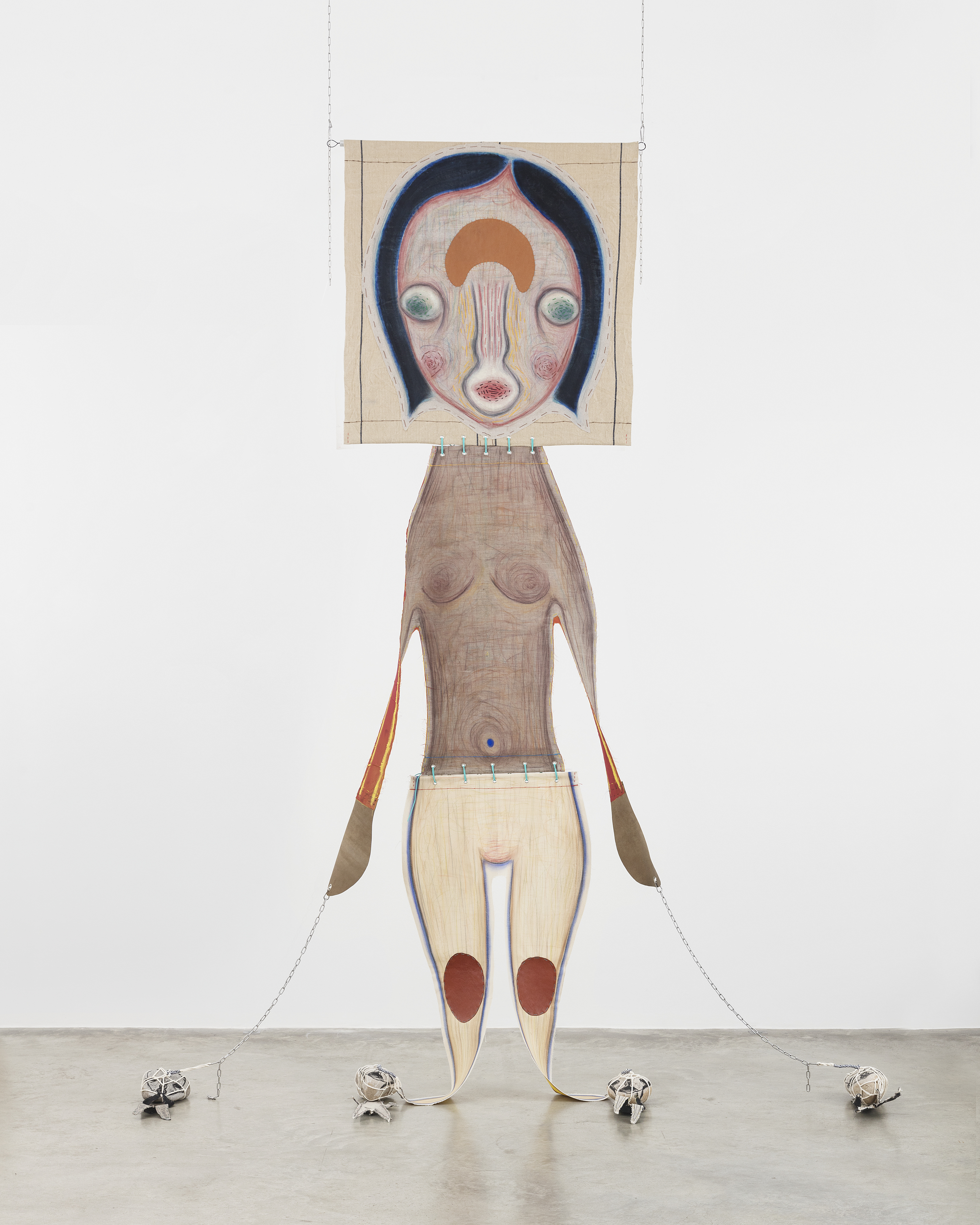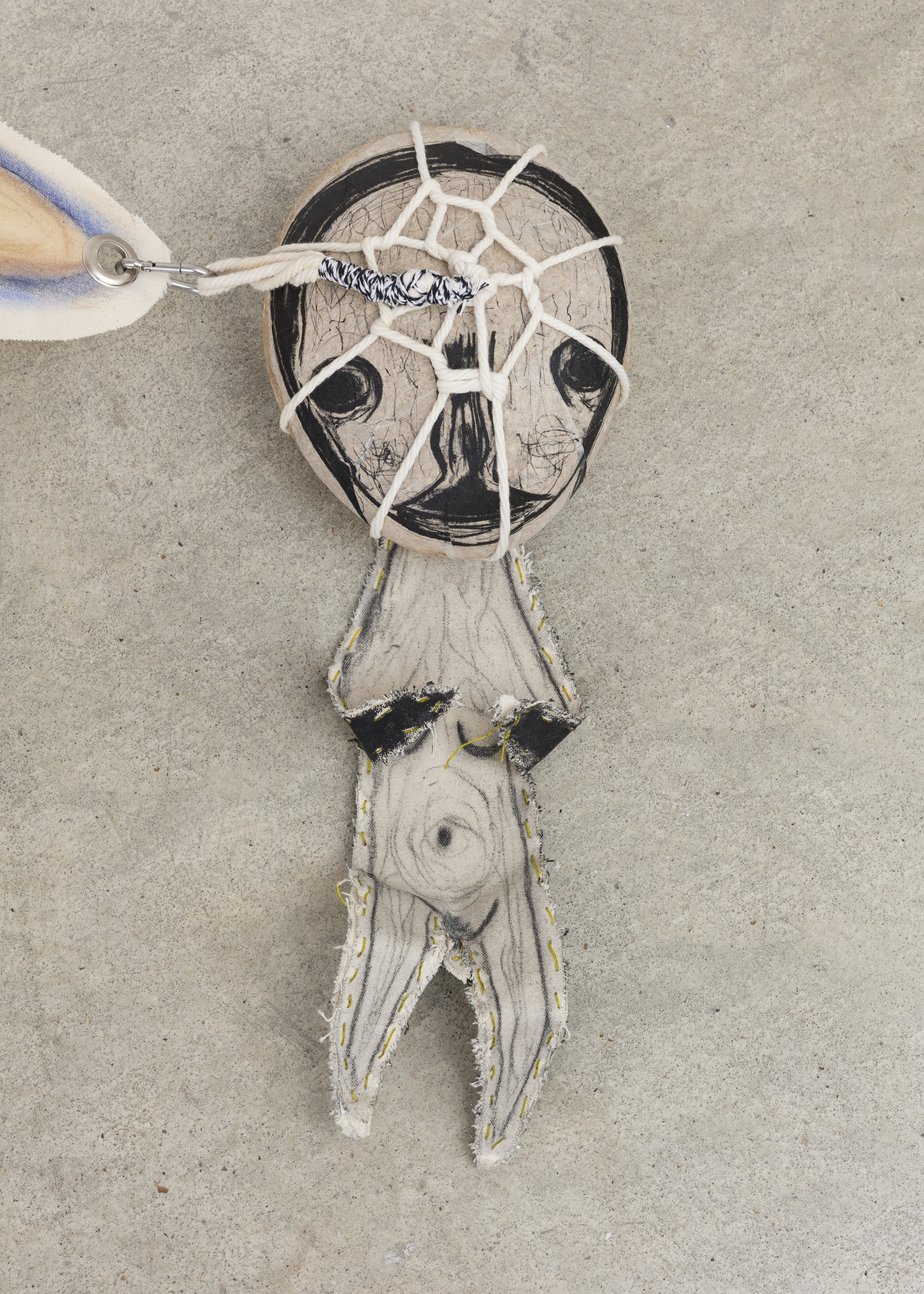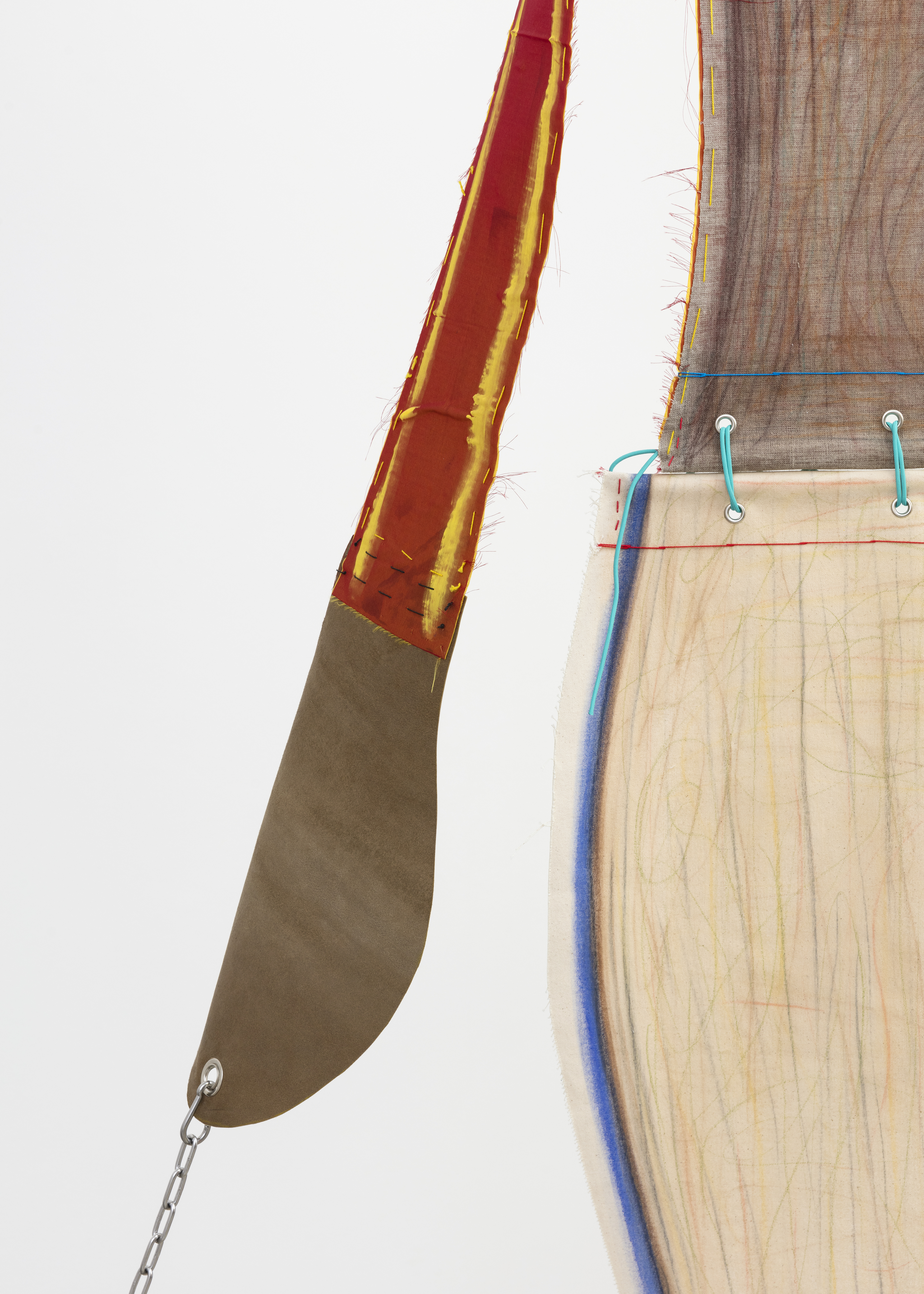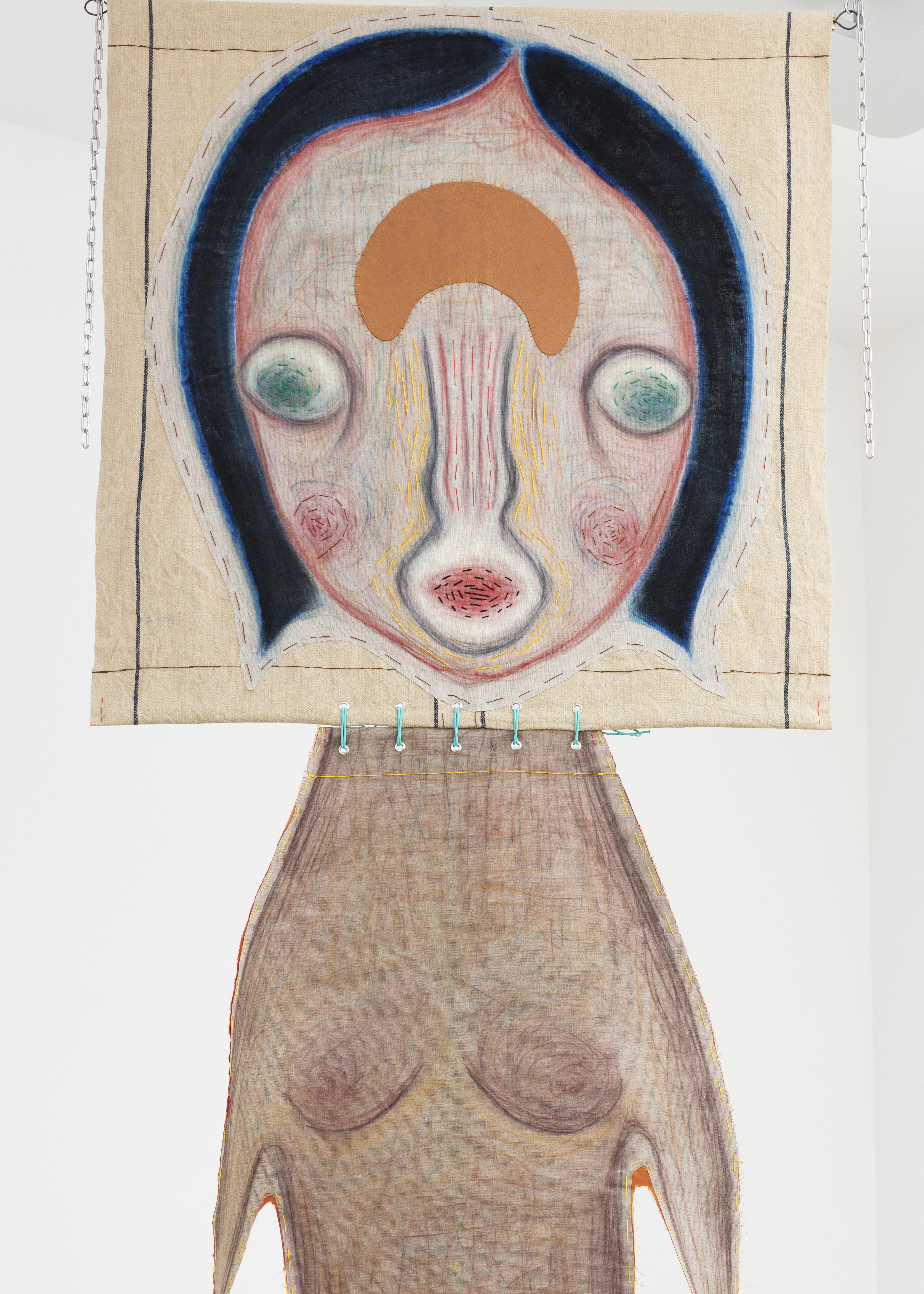 Fabric, pastel, acrylic, embroidery, leather, string, aluminium, chain, stone, lithograph