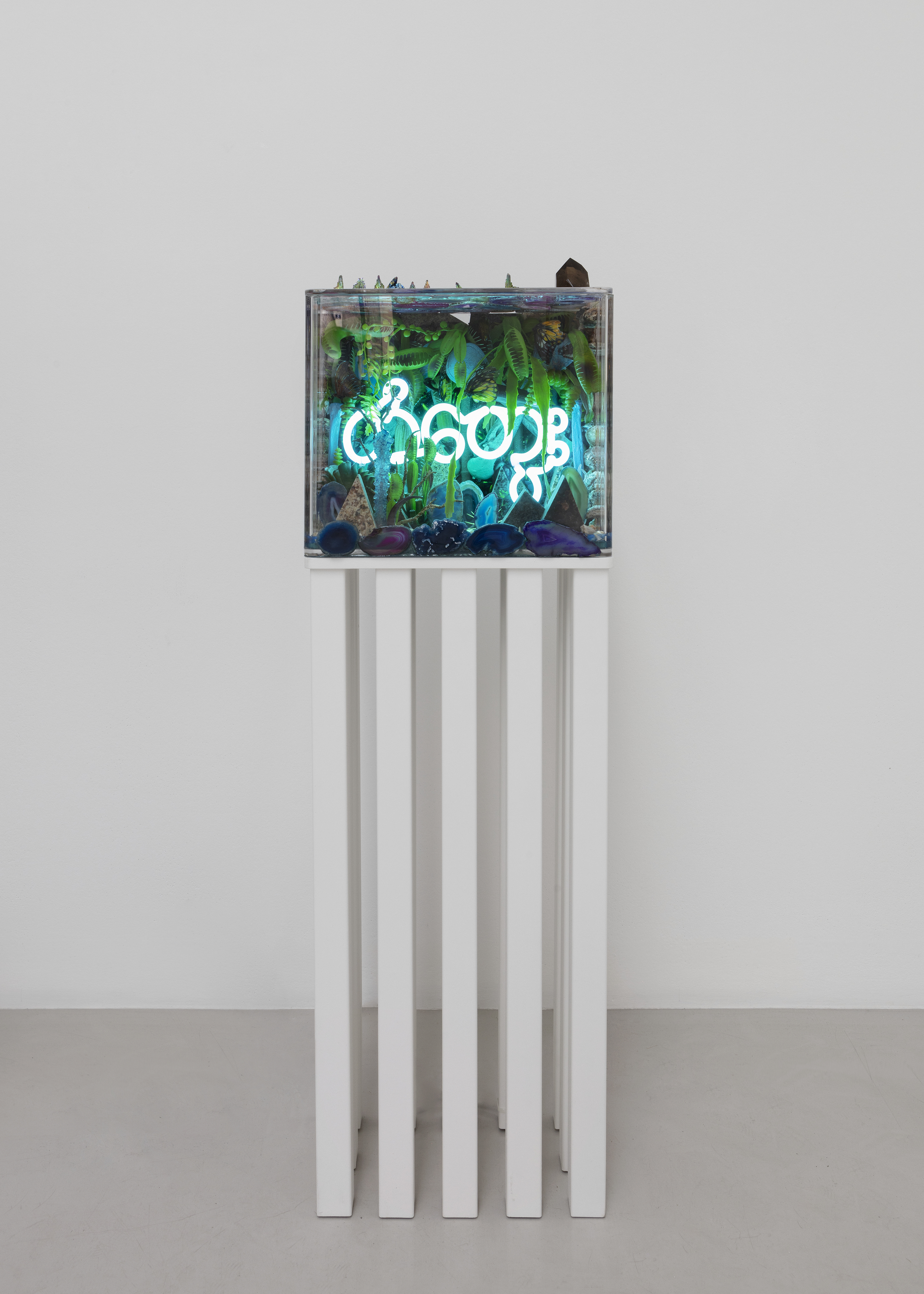 Custom acrylic vitrine, modeled habitat, selenite, plastic tusks, neon sign