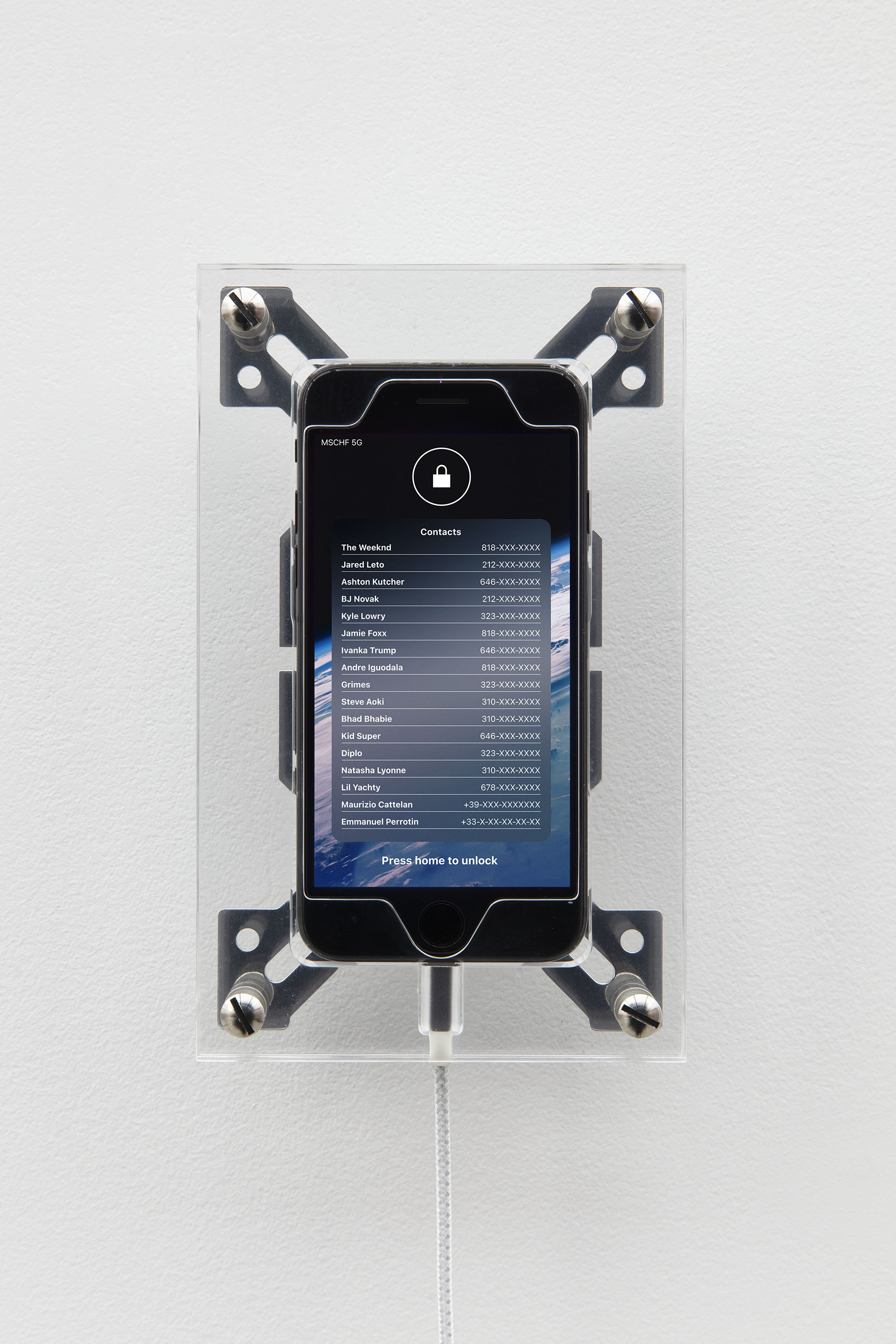 Locked Apple iPhone 7 containing the phone numbers of The Weeknd, Jared Leto, Ashton Kutcher, BJ Novak, Kyle Lowry, Jamie Foxx, Ivanka Trump, Andre Iguodala, Grimes, Steve Aoki, Bad Bhabie, Kid Super, Diplo, Natasha Lyonne, Lil Yachty, Maurizio Cattelan, Emmanuel Perrotin,