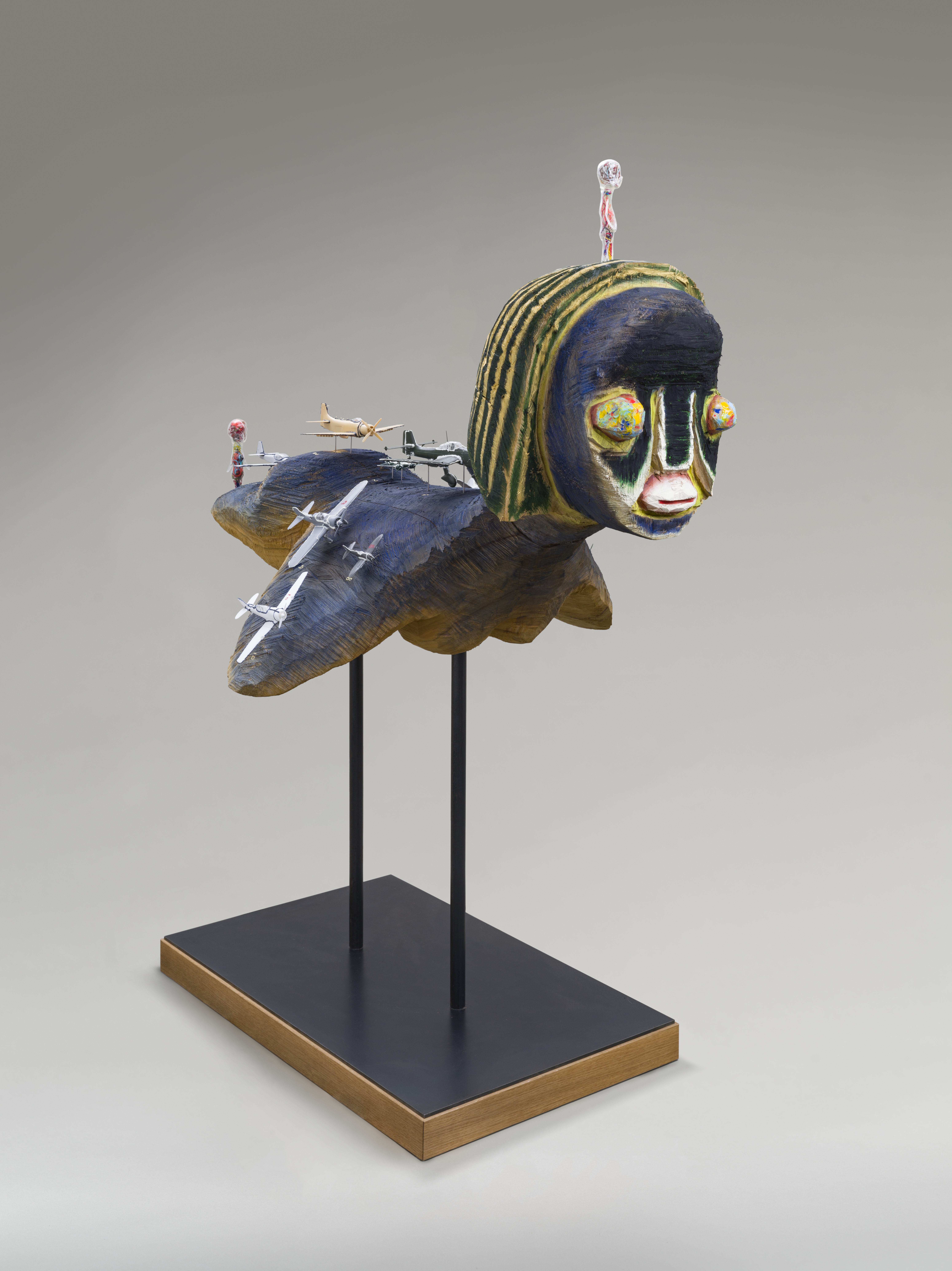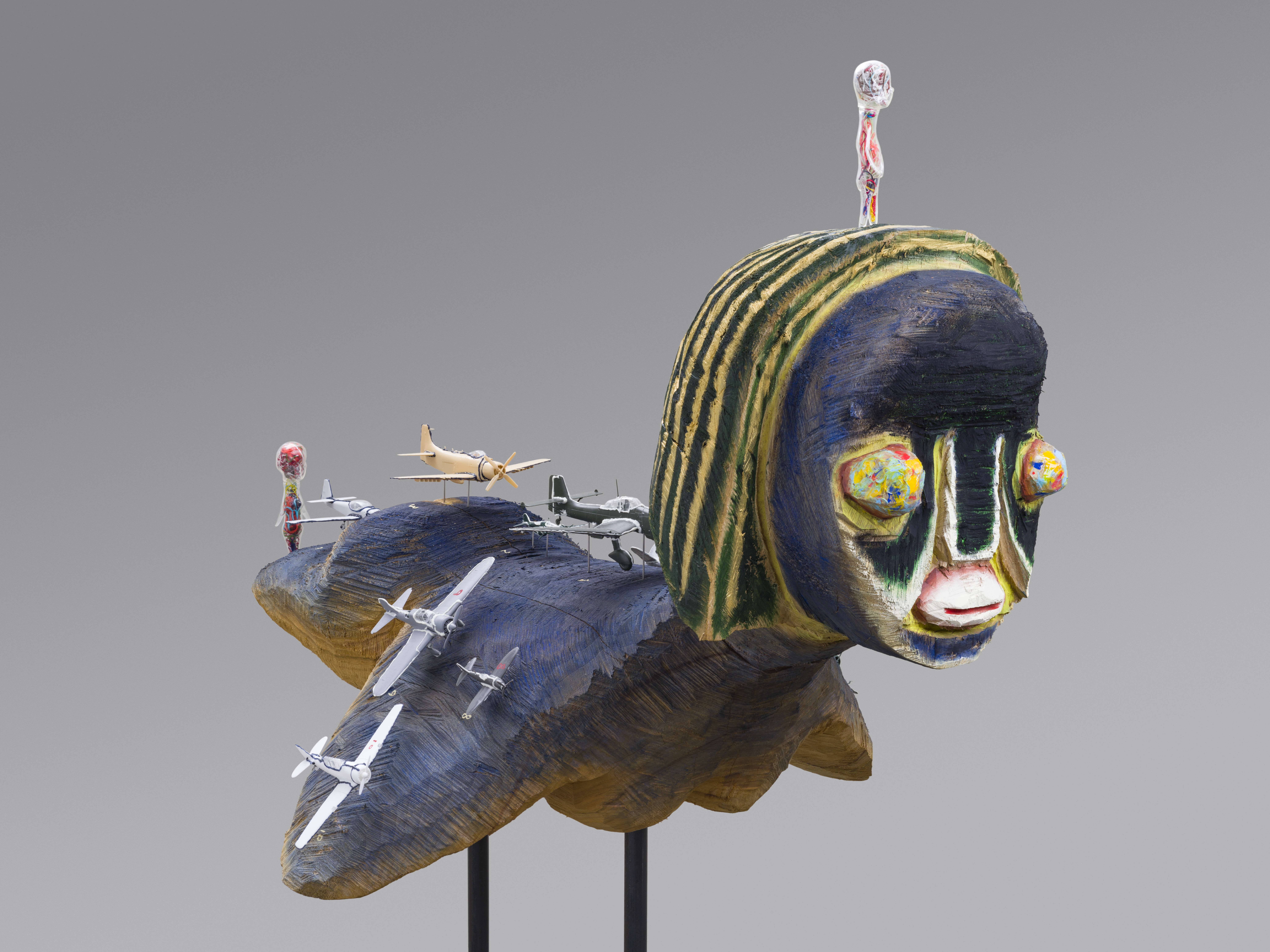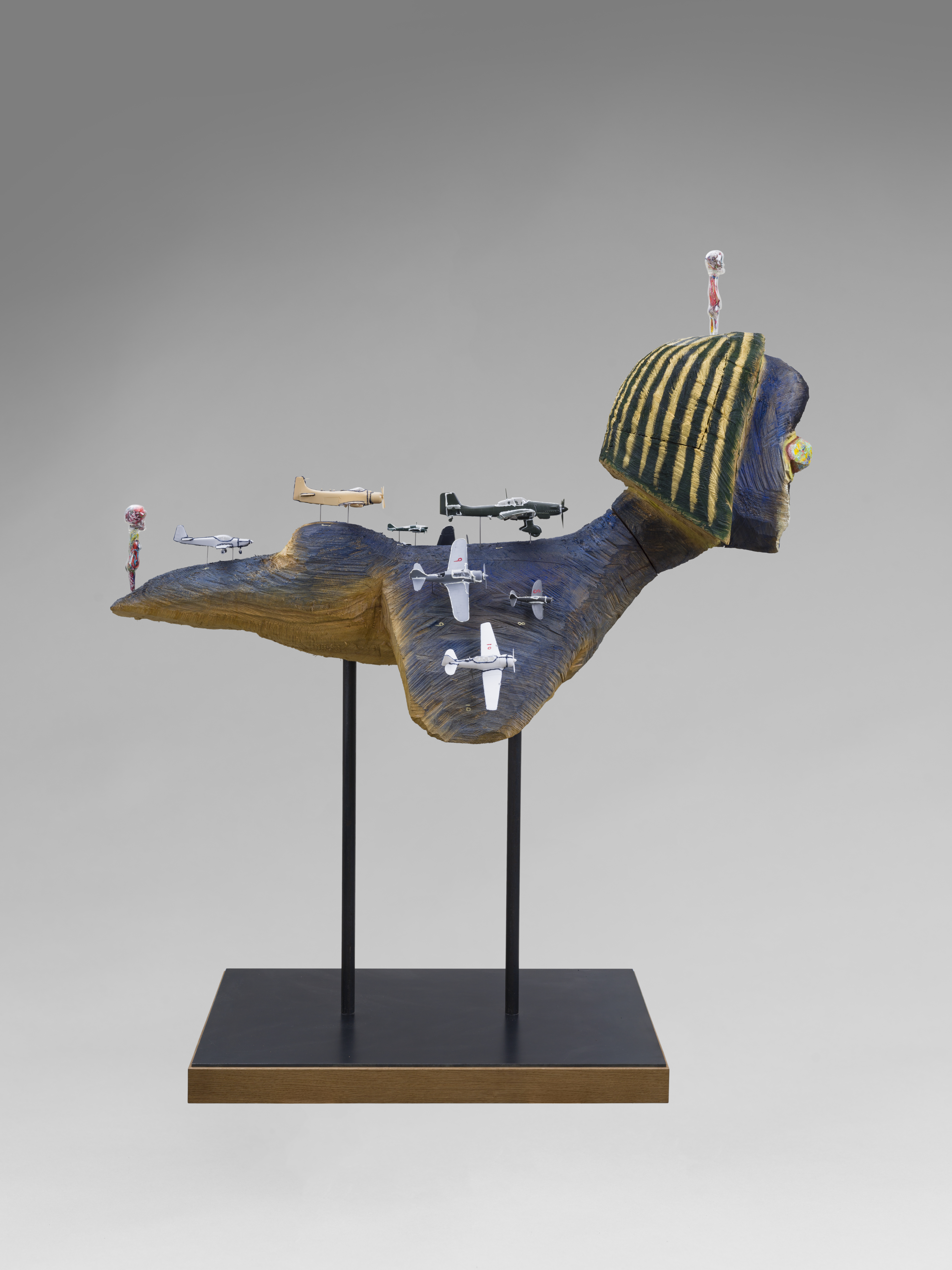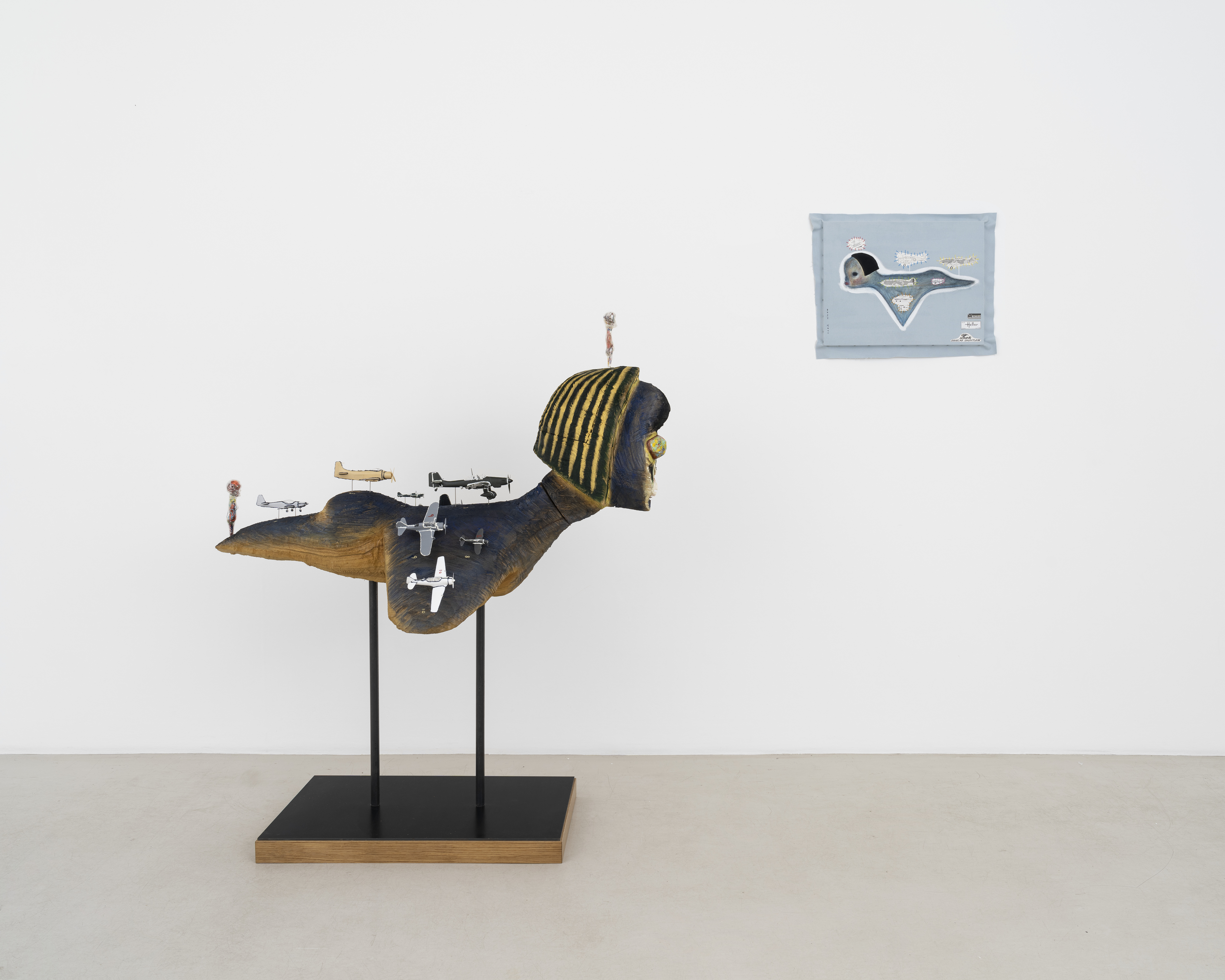 Sculpture: Wood, acrylic, plastic model, soft vinyl, steel. Drawing: Acrylic paint on fabric, plastic model instruction drawing, embroidery, collage, wood